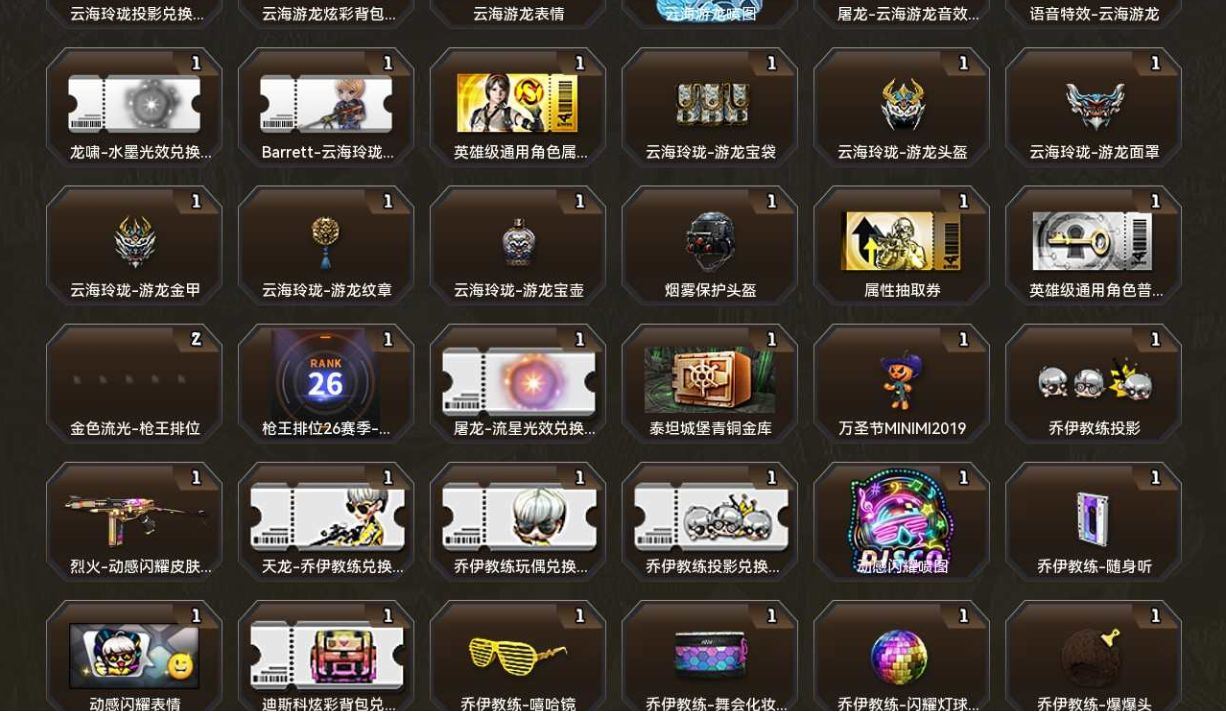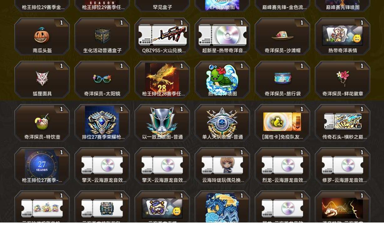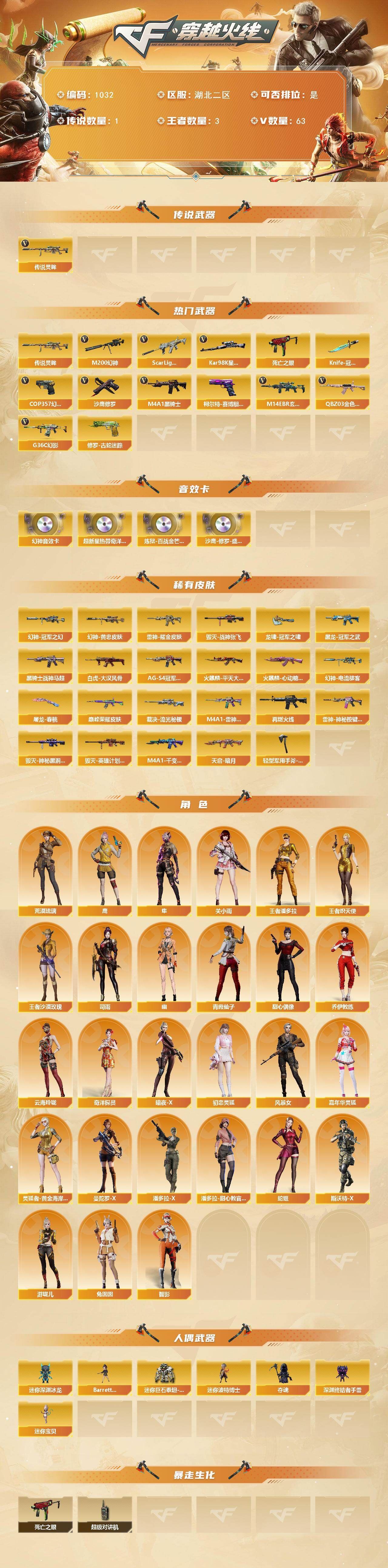 【传说武器】:传说灵眸【热门武器】:传说灵眸,G36C-幻影,QBZ03-金色蔷薇,M14EBR-玄武,Scar Light-白虎,M200-幻神,修罗-古蛇迷踪,死亡之眼,Kar98K-星神,M4A1-黑骑士,COP 357-幻灵,沙鹰-修罗*5,柯尔特-赛博朋克*2,Knife-冠军之刃*2【音效卡】:AN94-超新星-热带奇洋音效卡,M200-幻神音效卡,炼狱-百战金芒-庆典舞曲音效卡,沙鹰-修罗-盛典舞曲音效卡【皮肤】:M200-幻神-黄忠皮肤,幻神-冠军之幻,幻神-电流骇客 皮肤,白虎-大汉风骨,QBZ03-巅峰荣耀皮肤,裁决-流光秘银,雷神-耀金皮肤,M4A1-雷神-巅峰荣耀皮肤,M4A1-再燃火线,雷神-神秘按键 皮肤,火麒麟-平天大圣,火麒麟-心动糖果,毁灭-战神张飞,毁灭-神秘黑洞皮肤,毁灭-英雄计划 皮肤,M4A1-千变-孔明皮肤,黑龙-冠军之武,黑骑士-战神马超,黑骑士-AG-S4冠军典藏,天启-暗月,屠龙-春桃 皮肤,龙啸-冠军之啸,轻型军用手斧-再燃火线【角色】:鹰,荒漠琉璃,关小雨,隼,司雨,王者潘多拉,王者炽天使,王者沙漠玫瑰,奇洋探员,乔伊教练,云海玲珑,暗夜-X,初恋灵狐,风暴女,嘉年华灵狐,灵狐者-黄金海岸,曼陀罗-X,潘多拉-X,潘多拉-甜心教官,青霞仙子,蛇姬,斯沃特-X,甜心偶像,兔囡囡,幽,游珑儿,智影【人偶武器】:迷你宝贝,迷你深渊冰龙,迷你波特博士,夺魂,深渊终结者手雷,Barrett-夜玫瑰,迷你巨石泰坦-魔花研究所【暴走生化】:死亡之眼,超级对讲机【挑战大师】:激光毁灭者III-白马银枪,激光毁灭者III,神圣爆裂者-末日III*2【英雄级武器】:AK47-火麒麟*2,M4A1-黑龙,M4A1-雷神,M4A1-黑骑士,AN94-超新星,M4A1-龙血,Scar Light-白虎,M14EBR-玄武,G36C-幻影,超新星-热带奇洋,QBZ03-金色蔷薇,烈火-动感闪耀,AWM-天龙,Barrett-毁灭,AWM-裁决,M200-幻神,Kar98K-星神,王者之光-觉醒版,炼狱-百战金芒,烈龙-云海游龙,沙鹰-修罗*5,COP 357-幻灵,天神-动感闪耀,修罗-古蛇迷踪,屠龙,龙啸,幻灵之锋*4,屠龙-动感闪耀,龙啸-热带奇洋,麒麟刺-百战金芒,王者之锋-觉醒版*2,高爆手雷-雷暴,高爆手雷-幻灵*6,手雷-云海游龙,高爆手雷-古蛇迷踪,闪光弹-幻灵*7,闪光弹-云龙*2,烟雾弹-幻灵,烟雾弹-云龙,烟雾弹-古蛇迷踪【道具】:CFS限定背包,云海游龙炫彩背包,古蛇迷踪炫彩背包,奇洋探员-海龟背包,热带奇洋炫彩背包,百战金芒炫彩背包,背包-洛丽塔,超级背包,女皇终结者-魔龙之吻,绿色巨人,灵魂忍者,变异宝贝,迷雾幽灵,夺命之镰,防化服*3,金色流光-枪王排位*2,星辰流光-枪王排位,巅峰赛先锋-金色流光,流光-鎏金之域,枪王排位28赛季金色流光,枪王排位29赛季金色流光,萌萌小葵表情,热带奇洋表情,动感闪耀表情,云海游龙表情,EP战队名片,EP战队喷图,EP战队击杀图标,防弹头盔*4,防弹衣*4,C4工具钳*4,手雷包*4,;Knife-冠军之刃,隼,王者沙漠玫瑰,QBZ03-金色蔷薇,G36C-幻影,M200-幻神,Scar Light-白虎,