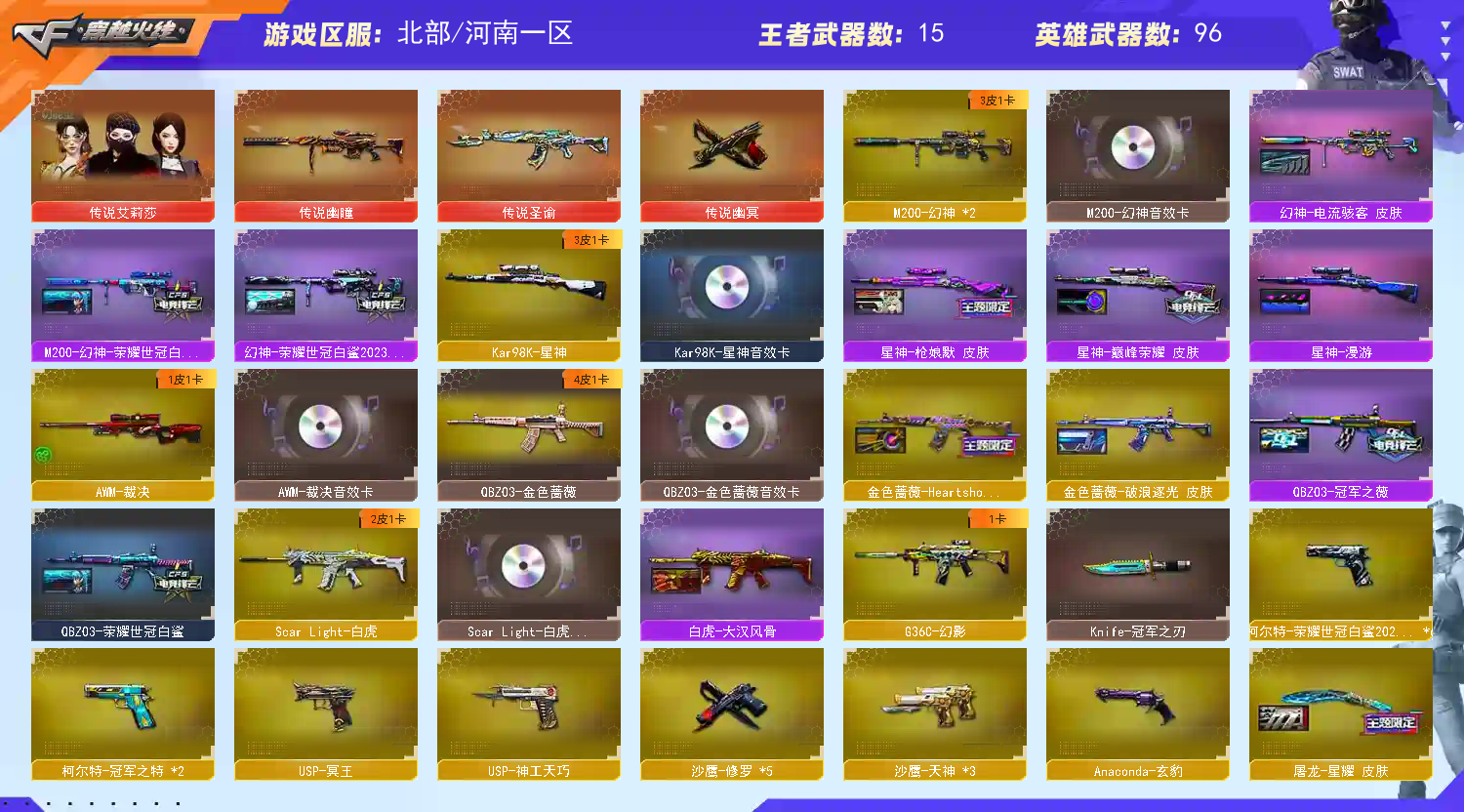 ★收藏好评! 由于异地登录保护机制,部分客户在使用客户端自动上号时会出现密码错误,注意本号密码不会错误,请多尝试5-6次!本账号已经过虚拟财产认定,请各位科技大神高抬贵手。请素质租号,文明游戏,谢谢大家配合!!;柯尔特-荣耀世冠白鲨2023,传说幽冥,柯尔特-冠军之特,炽芒蝶刃,Knife-冠军之刃,传说艾莉莎,QBZ03-金色蔷薇,