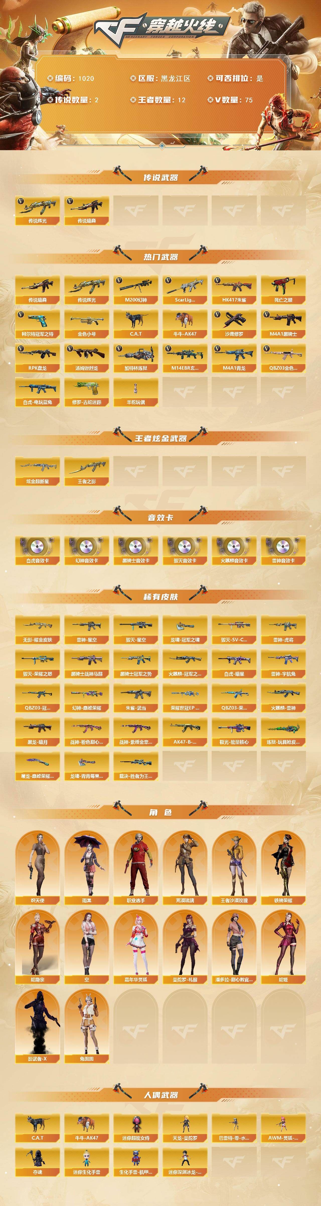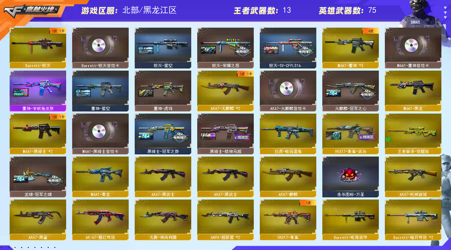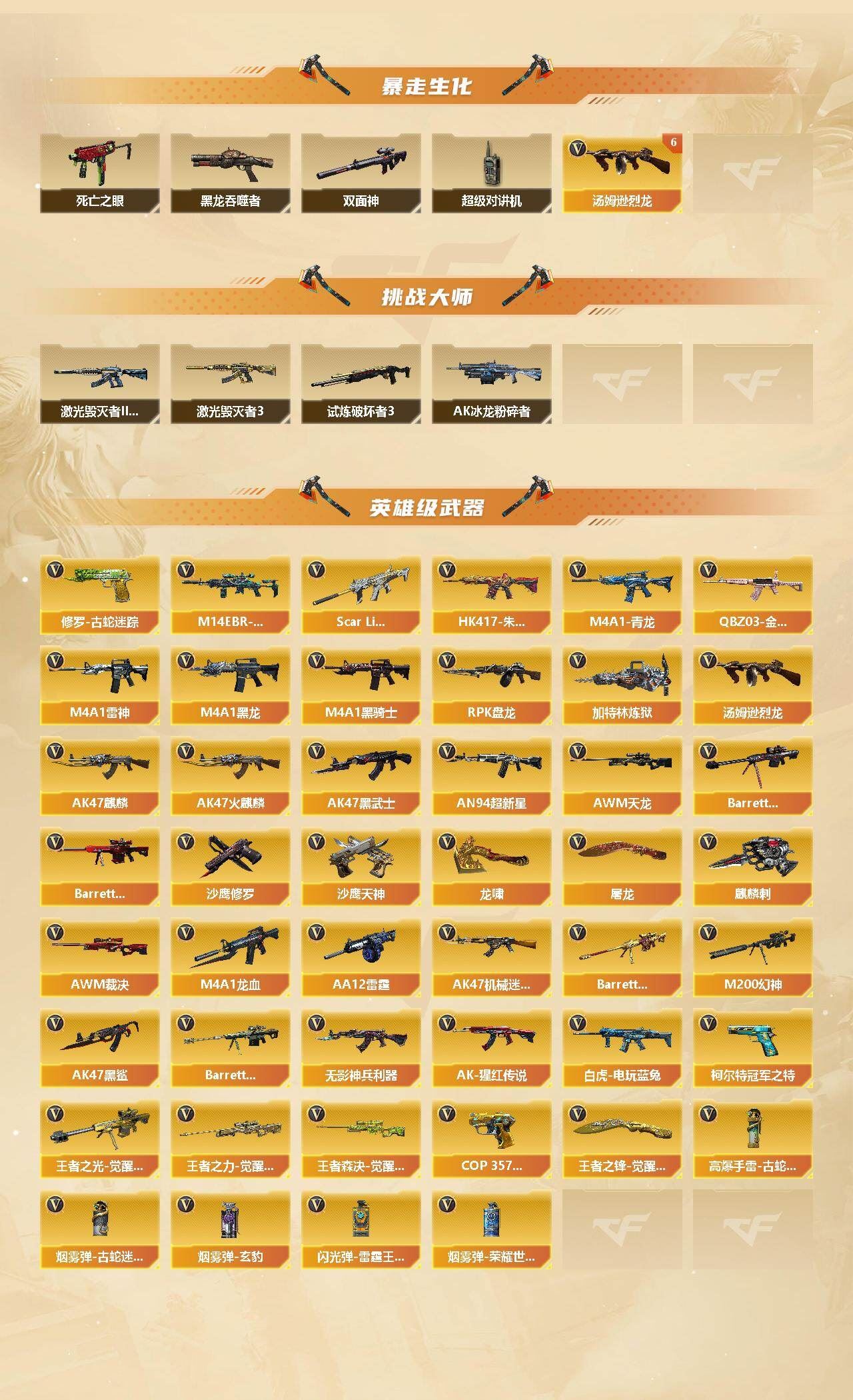 【传说暗裔,传说辉光】【QBZ03-金色蔷薇,M14EBR-玄武,Scar Light-白虎,HK417-朱雀,M4A1-青龙,M200-幻神,修罗-古蛇迷踪,死亡之眼,白虎-电玩蓝兔,柯尔特-冠军之特,金色小号,C.A.T,牛牛-AK47,M4A1-黑骑士*2,汤姆逊-烈龙*6,RPK-盘龙*2,加特林-炼狱*4】【AK47-火麒麟*2,AK47-麒麟,M4A1-黑龙,M4A1-雷神*3,M4A1-黑骑士*2,AK47-黑武士,AN94-超新星*2,AK47-机械迷城,AK47-黑鲨,M4A1-龙血,M4A1-青龙,HK417-朱雀,Scar Light-白虎,M14EBR-玄武,无影-神兵利器,QBZ03-金色蔷薇,AK-47-猩红传说,白虎-电玩蓝兔,AWM-天龙,Barrett-毁灭,Barrett-极光*2,AWM-裁决,M200-幻神,Barrett-朱雀,Barrett-电竞装甲,王者之光-觉醒版,王者之力-觉醒版,王者森决-觉醒版,RPK-盘龙*2,加特林-炼狱*4,汤姆逊-烈龙*6,AA-12-雷霆,沙鹰-修罗*3,沙鹰-天神,COP 357-雷霆王者-觉醒版,柯尔特-冠军之特,修罗-古蛇迷踪,屠龙*2,龙啸*2,麒麟刺*3,王者之锋-觉醒版,高爆手雷-古蛇迷踪,闪光弹-雷霆王者-觉醒版,烟雾弹-古蛇迷踪,烟雾弹-玄豹,烟雾弹-荣耀世冠EP*2】【M200-幻神音效卡,AK47-火麒麟音效卡,M4A1-雷神音效卡,M4A1-黑骑士音效卡,Barrett-毁灭音效卡,Scar Light-白虎音效卡】【幻神-巅峰荣耀,幻神-荣耀世冠EP 皮肤,Scar Light-白虎-暗星,QBZ03-冠军之薇,QBZ03-荣耀世冠EP 皮肤,裁决-胜者为王 皮肤,雷神-星空,雷神-虎将,雷神-宇航兔皮肤,火麒麟-雷神,火麒麟-冠军之心,毁灭-荣耀之怒,毁灭-星空,毁灭-SV-CFPLS16冠军,黑龙-暗月,黑骑士-冠军之势,黑骑士-战神马超,无影耀金皮肤,HK417-朱雀-武当,战神-粉色甜心皮肤,战神-紫绶金章皮肤,AK47-B-常胜将军-孙权,极光-能量核心】【雨棠,荒漠琉璃,王者沙漠玫瑰,蛇隐宗,炽天使,空,嘉年华灵狐,曼陀罗-礼服,潘多拉-甜心教官,蛇姬,铁骑荣耀,兔囡囡,影武者-X,职业选手】【人偶武器:天龙-曼陀罗,巴雷特-零-水下丽影,AWM-灵狐-15周年嘉年华,C.A.T,牛牛-AK47,夺魂,迷你生化手雷,生化手雷-机甲核心*2,迷你深渊冰龙-王绿豆*2,迷你超能女侍】【BS战队炫彩背包,CFS限定背包,古蛇迷踪炫彩背包,超级背包,女皇终结者-魔龙之吻,妩媚妖姬,绿色巨人,灵魂忍者,变异宝贝,迷雾幽灵,夺命之镰,防化服*2,金色流光-枪王排位*2,巅峰赛先锋-金色流光,枪王排位28赛季金色流光,枪王排位29赛季金色流光,热带奇洋特效,古蛇迷踪特效,蛇隐宗表情,电玩兔兔表情,EP战队名片,EP战队喷图,EP战队击杀图标,C4-沙漠,防弹头盔*2,防弹衣*2,C4工具钳*2,手雷包*2】;柯尔特-冠军之特,王者沙漠玫瑰,RPK-盘龙,QBZ03-金色蔷薇,M200-幻神,Scar Light-白虎,传说暗裔,