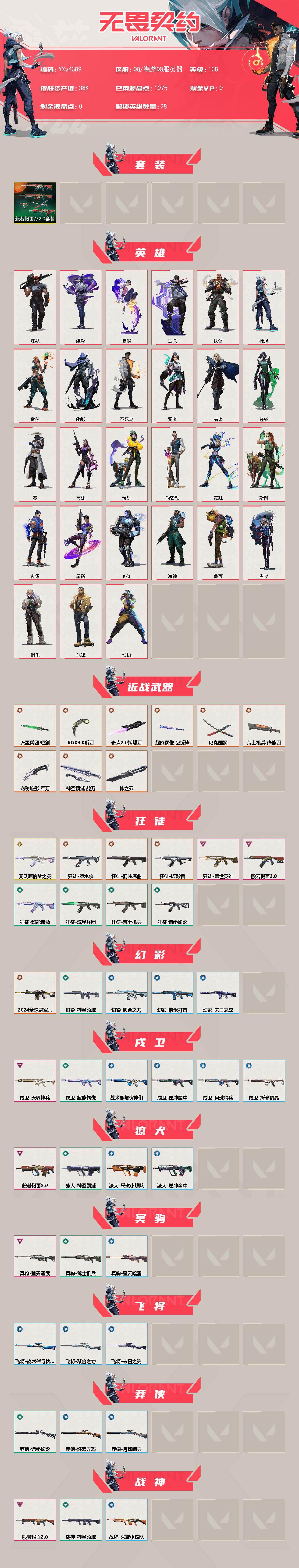 冻结三分钟内解除,短信通知重新上即可!喜欢收藏不迷路、游戏异常进小黑屋、时间不够请提前续租或者不要开局 【套装】:般若假面//2.0套装 【英雄】:幻棱,炼狱,维斯,暮蝶,钛狐,壹决,铁臂,捷风,雷兹,幽影,不死鸟,贤者,猎枭,蝰蛇,零,芮娜,奇乐,尚勃勒,霓虹,斯凯,夜露,星礈,K/O,海神,盖可,黑梦,钢锁 【近战武器】:近战武器-神之刃,近战武器-奇点//2.0 蝴蝶刀,近战武器-RGX 11z Pro//3.0 爪刀,近战武器-鬼丸国纲,近战武器-流星兵团 短剑,近战武器-超能偶像 应援棒,近战武器-荒土机兵 热能刀,近战武器-诡秘蛇影 军刀,近战武器-神圣领域 战刀 【狂徒】:狂徒-艾沃莉的梦之翼,狂徒-混沌序曲,狂徒-塑水宗,狂徒-噬影者,狂徒-般若假面//2.0,狂徒-盖世英雄,狂徒-超能偶像,狂徒-荒土机兵,狂徒-流星兵团,狂徒-诡秘蛇影 【幻影】:幻影-2024全球冠军赛,幻影-神圣领域,幻影-聚合之力,幻影-纳米击,幻影-末日之翼 【戍卫】:戍卫-天界神兵,戍卫-超能偶像,戍卫-逆冲蛮牛,戍卫-战术熊与伙伴们,戍卫-月球哨兵,戍卫-折光棱晶 【獠犬】:獠犬-般若假面//2.0,獠犬-神圣领域,獠犬-采蜜小蜂队,獠犬-逆冲蛮牛 【冥驹】:冥驹-堕天遗武,冥驹-荒土机兵,冥驹-星云暗涌 【飞将】:飞将-聚合之力,飞将-战术熊与伙伴们,飞将-末日之翼 【莽侠】:莽侠-诡秘蛇影,莽侠-纤云弄巧,莽侠-月球哨兵 【战神】:战神-般若假面//2.0,战神-神圣领域,战神-采蜜小蜂队 【奥丁】:奥丁-西部未来,奥丁-流星兵团,奥丁-纳米击,奥丁-末日之翼 【判官】:判官-超能偶像,判官-诡秘蛇影,判官-采蜜小蜂队,判官-纳米击x 【雄鹿】:雄鹿-逆冲蛮牛,雄鹿-月球哨兵 【骇灵】:骇灵-荒土机兵,骇灵-流星兵团,骇灵-星云暗涌 【蜂刺】:蜂刺-聚合之力,蜂刺-纤云弄巧,蜂刺-星云暗涌,蜂刺-折光棱晶 【标配】:标配-黯夜怪谈,标配-超能偶像,标配-荒土机兵,标配-战术熊与伙伴们,标配-折光棱晶 【正义】:正义-奇点,正义-塑水宗,正义-超限闪存,正义-纳米击,正义-纤云弄巧,正义-月球哨兵 【鬼魅】:鬼魅-天界神兵,鬼魅-流星兵团,鬼魅-诡秘蛇影,鬼魅-采蜜小蜂队,鬼魅-星云暗涌 【狂怒】:狂怒-般若假面//2.0,狂怒-神圣领域,狂怒-聚合之力,狂怒-逆冲蛮牛,狂怒-战术熊与伙伴们 【短炮】:短炮-纤云弄巧,短炮-末日之翼 【卡面】:终章:激斗汉堡 卡面,进入射程 卡面,分崩离析 卡面,纳米击 卡面,抑制技术 卡面,激斗汉堡 卡面,瓦娃雪糕 P2 卡面,从黄昏到黎明 卡面,荒土机兵 卡面,银弹猎手 卡面,逆冲蛮牛 卡面,《双城之战》拥抱 卡面,精灵大战 卡面,欢迎来到底城 卡面,南瓜盛典 卡面,修车达人 卡面,正义的化身 卡面,终章:生意人麦宝 卡面,铁之华 卡面,失而复得 卡面,时间到 卡面,最高舞台 卡面,复活专家 卡面,归乡 // 蝰蛇 卡面,超能偶像 卡面,生意人麦宝 卡面,声感陷阱设计图 卡面,钢锁工牌 卡面,战术小伙伴的夏日 卡面,采蜜小蜂队 卡面,聚合之力 卡面,梦幻奶茶 卡面,趁热吃 卡面,西装暴徒 卡面,失控边缘 卡面,哨卫者之领域 卡面,暮蝶工牌 卡面,战术熊与伙伴们 卡面,源能反应 卡面,流星兵团 卡面,纤云弄巧 卡面,暂别喧嚣 卡面,打造专属狂徒 卡面,零点嗅探设计图 卡面,无畏契约GO!一卷:芮娜 卡面,清除名单 卡面,无畏契约GO!一卷:零 卡面,《双城之战》金克丝 卡面,势不可挡//K/O 卡面,代号红色 卡面,新兵报到 卡面,V契约 卡面,无畏契约 卡面 【喷漆】:小小心意 喷漆,战“素”兔 喷漆,宇宙的指引 喷漆,请求重启 喷漆,逆冲蛮牛 喷漆,纳米击 喷漆,鼻尖上的蝴蝶 喷漆,简笔画黯兽 喷漆,独守蝰腹 喷漆,他们将落荒而逃 喷漆,通缉:战术鹅 喷漆,荒土机兵 喷漆,别挡我吃球! 喷漆,嗨宝南瓜灯 喷漆,嘭! 喷漆,都算到了 喷漆,控场勿近 喷漆,小丑猫 喷漆,熊抱 喷漆,高丽风情小蛙 喷漆,又被闪了 喷漆,终极羞辱 喷漆,超级粉丝 喷漆,黯兽卖萌 喷漆,捷风差距 喷漆,惊声尖叫 喷漆,五人成星 喷漆,超能偶像 喷漆,放我出去 喷漆,掩护我 喷漆,大佬发枪 喷漆,边缘试探 喷漆,拼一枪 喷漆,聚合之力 喷漆,采蜜小蜂队 喷漆,梦幻小队 喷漆,五个全都齐了 喷漆,加油!加油! 喷漆,开心到爆炸 喷漆,皮蛋萌舞 喷漆,我觉得不行 喷漆,头号粉丝 喷漆,吸一口快乐 喷漆,永远的答案 喷漆,再来一次? 喷漆,别挡我的路! 喷漆,我的刀呢? 喷漆,当然可以 喷漆,流星兵团 喷漆,战术熊与伙伴们 喷漆,禁止喷漆 喷漆,纤云弄巧 喷漆,买装还是存钱 喷漆,胜利属于无畏契约 喷漆,GLHF 喷漆,无畏契约 喷漆 【挂饰】:第九季:超凡 挂饰,终章:猫猫木乃伊 挂饰,荒土机兵 挂饰,悠闲鸡块 挂饰,猫猫木乃伊 挂饰,水壶 挂饰,纳米击 挂饰,逆冲蛮牛 挂饰,可爱糖糖 挂饰,伞绳 挂饰,《双城之战》小蛋糕 挂饰,第九季//第三幕 纪念币 挂饰,工具腰带 挂饰,熔岩灯 挂饰,第九季//第二幕 纪念币 挂饰,终章:这瓜保熟 挂饰,炼狱雪糕 挂饰,糖葫芦 挂饰,袖珍捷风 挂饰,冲上云霄 挂饰,超能偶像 挂饰,迷你浓缩 挂饰,这瓜保熟 挂饰,Z世代特饮 挂饰,采蜜小蜂队 挂饰,第九季//一幕 纪念币 挂饰,聚合之力 挂饰,终章:迷你机甲 挂饰,犯困的布鲁诺 挂饰,战术河童 挂饰,招财猫熊 挂饰,迷你机甲 挂饰,荧光棒 挂饰,章鱼烧先生 挂饰,流星兵团 挂饰,云开见日 挂饰,第八季//第三幕 纪念币 挂饰,第八季//第二幕 纪念币 挂饰 ,天外飞客 挂饰,无畏契约 纪念币 挂饰;西部未来 奥丁,噬影者 狂徒,天界神兵 戍卫,混沌序曲 狂徒,塑水宗 狂徒,2024全球冠军赛