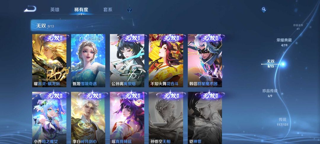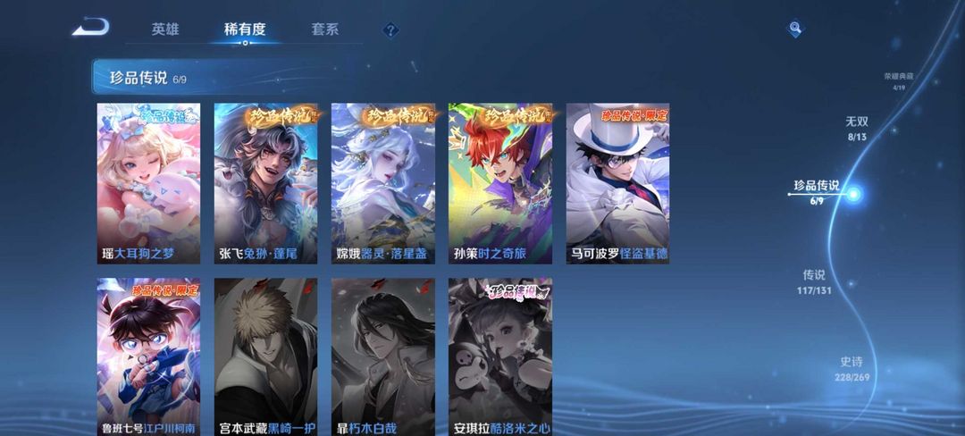 640皮★5典藏8无双★6珍品传说★瑶大耳狗之梦★火舞花合斗★雪镜奇缘★曜璃龙剑★张飞珍品传说