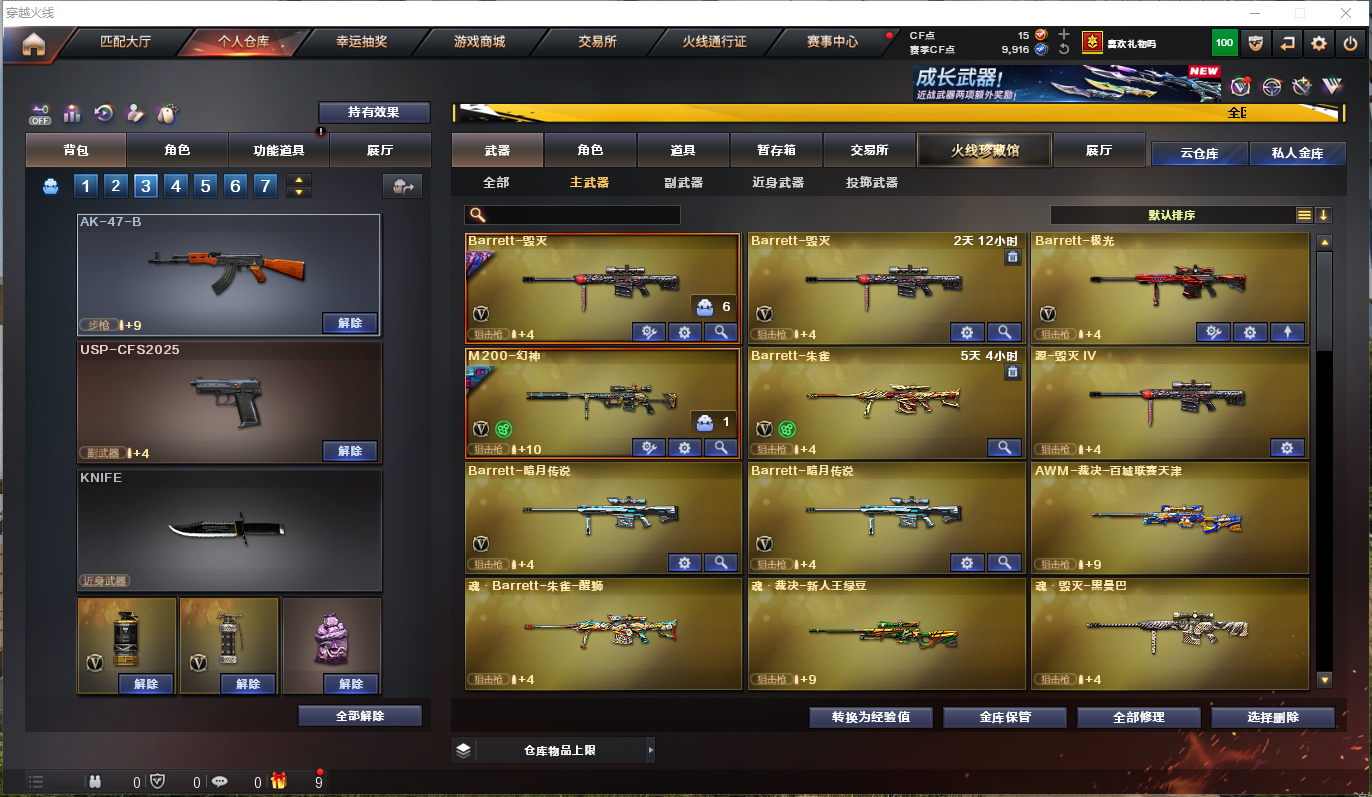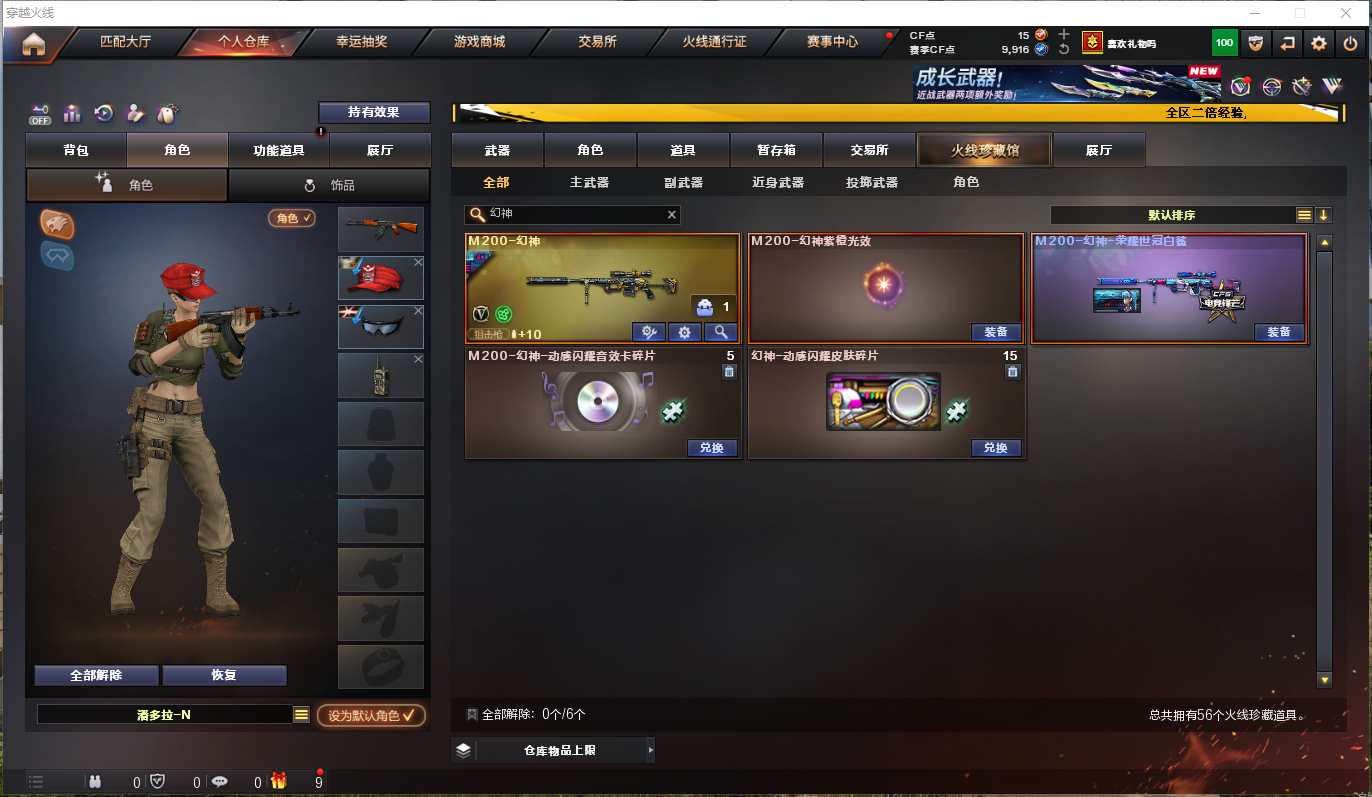 【M200-幻神带幻神-荣耀世冠白鲨皮肤】【白虎之魄】【四防王者-迷迭香】狙击枪:【M200-幻神】【毁灭】【极光】【Barrett-暗月传说×2】【AWM-裁决-百城联赛天津】步枪:【白虎之魄】【王者之魄】【火麒麟】【雷神】【黑骑士】【AK47-黑鲨】【M4A1-龙血】【QBZ03-天罚】【无影-神兵利器】【机械迷城-穹宇】【烈火-动感闪耀】【黑骑士-海王×2】手枪:【COP357-幻灵】【天神-动感闪耀】刀具:【屠龙×2 麒麟刺 幻灵之锋×2 屠龙-动感闪耀 王者之锋 王者之啸 王者之击 龙啸-烈火龙威】手雷:【幻灵高爆手雷套×3 神工天巧高爆手雷套×3 动感闪耀手雷 幻灵闪光弹手雷套×4】音效卡:【黑骑士音效卡】角色:【四防王者-迷迭香】【零 乔伊教练 北极狐-X 潘多拉-N】皮肤:【M200-幻神-荣耀世冠白鲨】【黑骑士-破浪10年】【火麒麟-百城】【毁灭-墨兰 毁灭-直播专属】;M200-幻神,