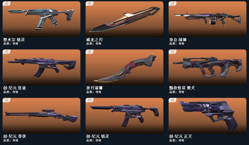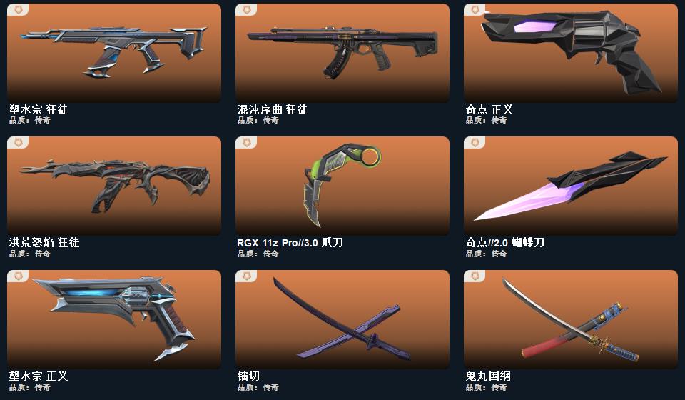 无畏契约★(创纪元套装/般若假面2.0套装)/皮肤92/创·纪元-狂徒,创·纪元-莽侠,创·纪元-骇灵,创·纪元-正义,镭切,般若假面//2.0-狂徒,般若假面//2.0-獠犬,般若假面//2.0-战神,般若假面//2.0-狂怒,鬼丸国纲,神圣领域-战刀,荒土机兵-热能刀,超限闪存-匕首,神罚-军刀,夜刃诡镰,奇点//2.0-蝴蝶刀,RGX-11z-Pro//3.0-爪刀