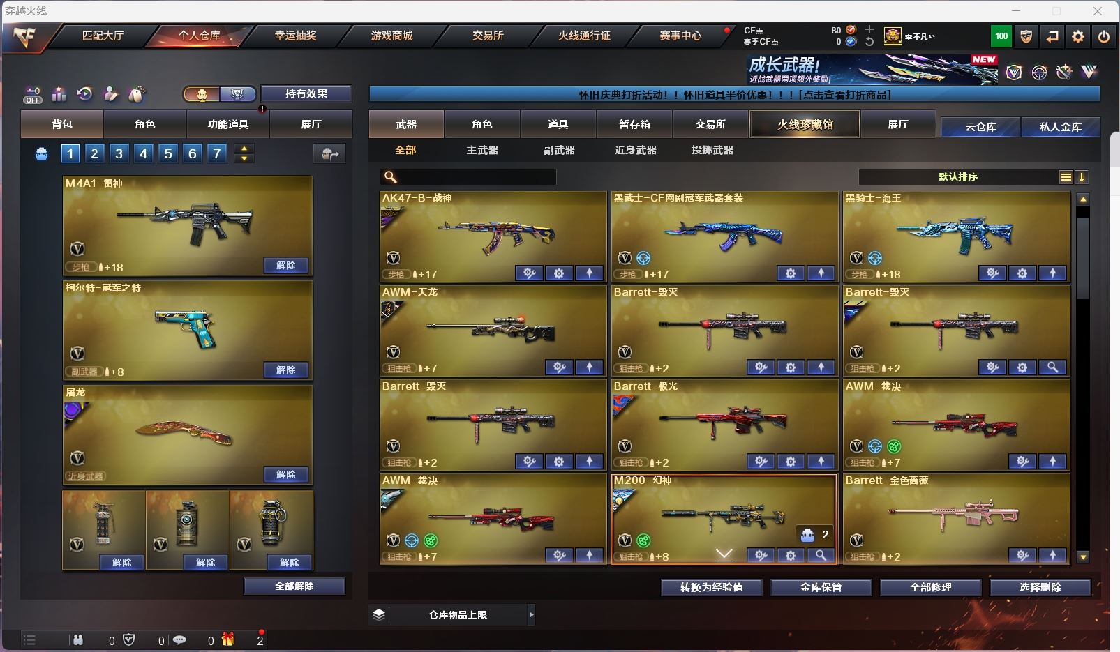 【亮点解析 幻神3皮带卡 生化满配】【m200幻神+音效卡+荣耀世冠ep+荣耀世冠白鲨+ag17冠军+冠军之特】【王者幻神】【6盘龙 炼狱*3 6烈龙 斯太尔枪娘暗刃】【传说光耀】【qbz金色蔷薇+荣耀世冠ep+巅峰荣耀+荣耀世冠白鲨】【朱雀】【火麒麟+卡+even】【黑龙+卡】【雷神+卡+荣耀之魄】【黑骑士+卡+冠军之势】【毁灭+卡+冠军之怒+ag15冠军】【极光】【裁决 +叶芒苍灵】【雷霆套 夜魔套】【武器:雷霆 青龙 王者之魄 王者之势 王者之戮 夜魔 】【9手枪:修罗*4 天神 雷霆 夜魔 幻灵 冠军之特 】【20刀具:屠龙*4 龙啸 擎天*3 麒麟刺*3 尼泊尔雷霆 斩神刀雷暴 夜魔 幻灵之峰 王者之锋*2 王者之啸 王者之击 王者之刺 】【12雷套:雷霆雷*6 夜魔雷*5 雷暴雷】【小人枪:火麒麟绝迹 cop白鲨 】【音效卡:幻神音效卡 毁灭音效卡 黑骑士音效卡 雷神音效卡 火麒麟音效卡 黑龙音效卡 】【四防角色:王者春 王者零国色天香 王者魅影 】;柯尔特-冠军之特,RPK-盘龙,QBZ03-金色蔷薇,M200-幻神,