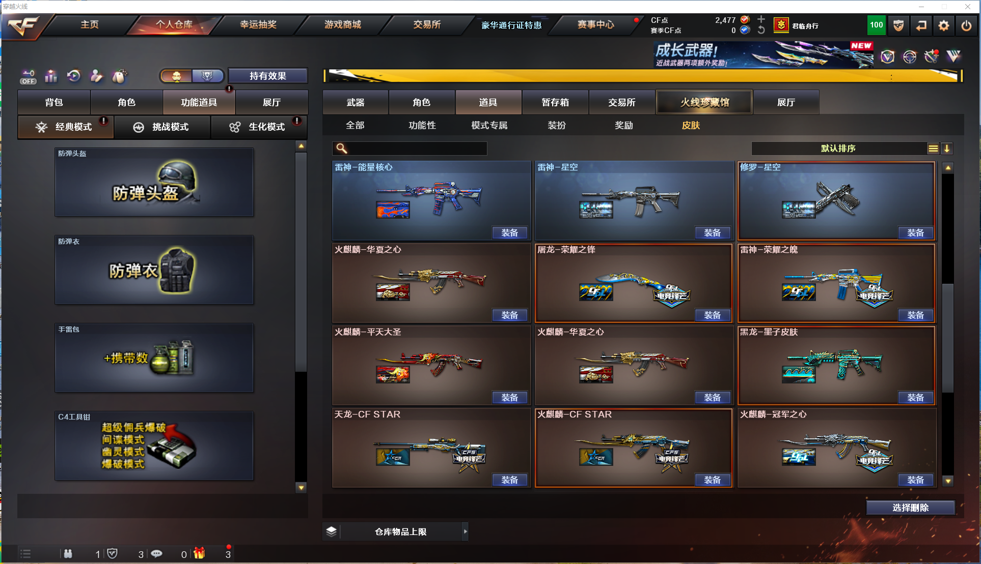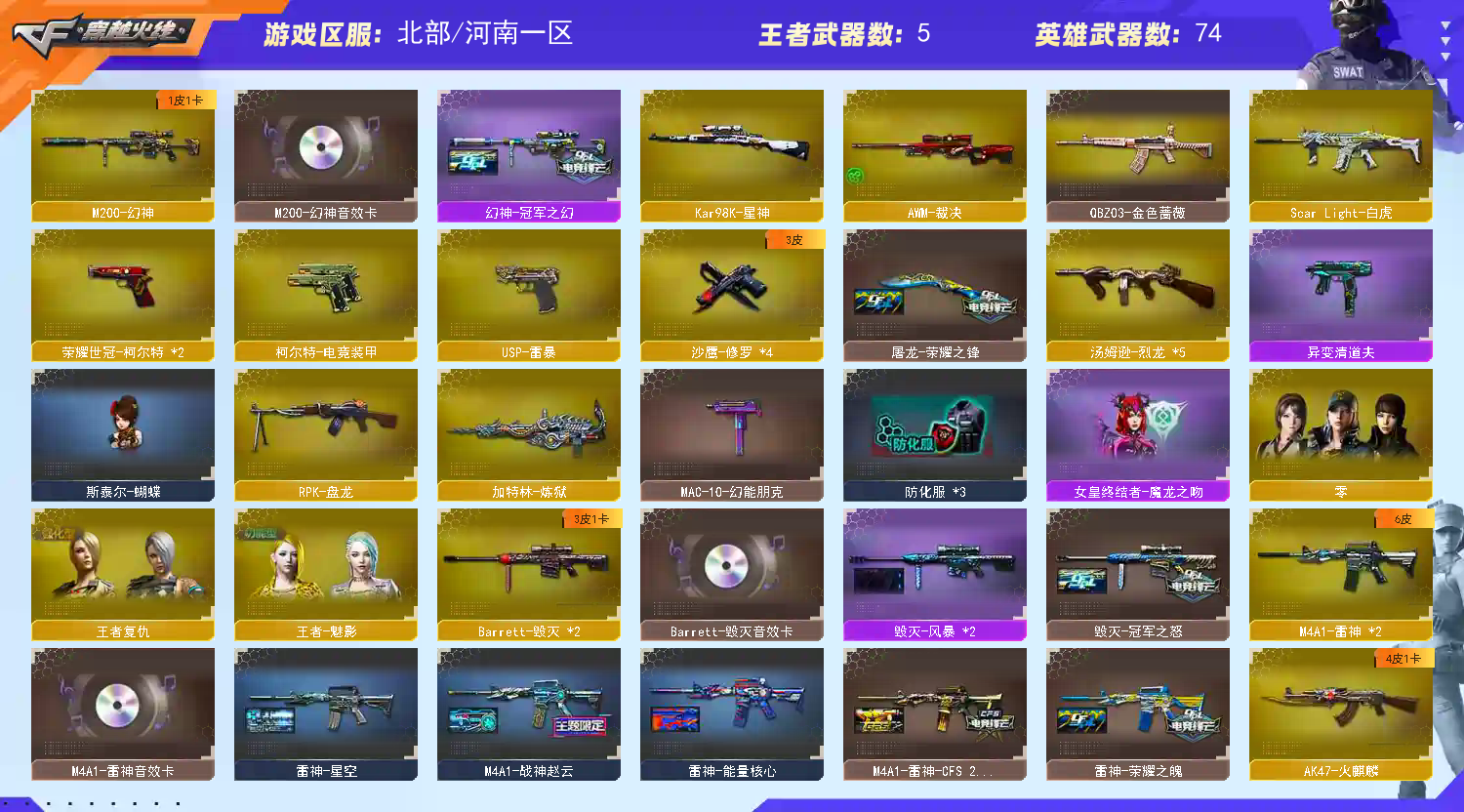 【m200-幻神+幻神音效卡+冠军之幻皮肤】【98k星神】【scar-白虎】【金色蔷薇】【荣耀世冠套装】【雷神+雷神音效卡+荣耀之魄】【火麒麟+火麒麟音效卡+冠军之心】【毁灭+毁灭音效卡+冠军之怒】【黑骑士+黑骑士音效卡】【7烈龙+盘龙+炼狱+斯泰尔蝴蝶+死亡之眼+异变清道夫】【王者之心/王者之影/朱雀/裁决】【副武器:雷暴/2荣耀世冠-柯尔特/4修罗+冠军之魄/2天神/柯尔特-电竞装甲】【近身武器:5屠龙+荣耀之锋/6龙啸/2擎天/2荣耀世冠-龙啸】【手雷包:4*雷暴手雷包/电竞装甲手雷包】【角色:四防王者-魅影/职业经理/零/王者复仇/修道士】;