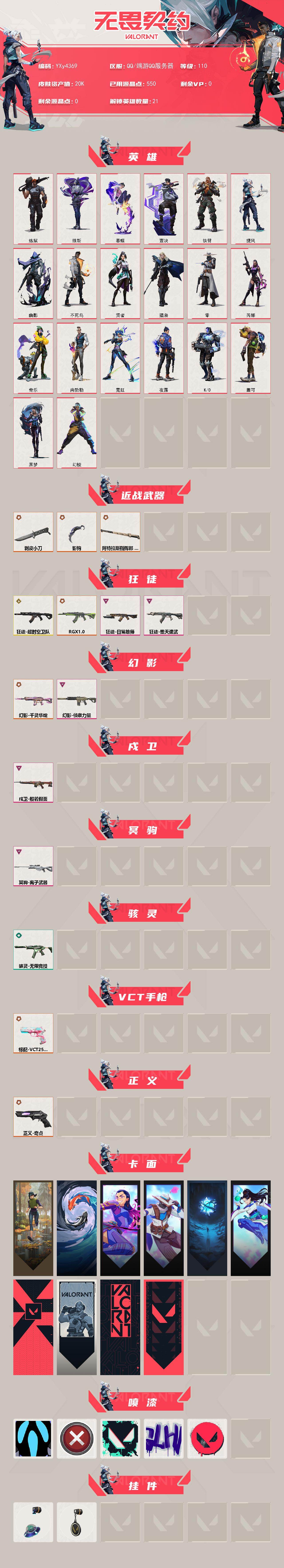冻结三分钟内解除,短信通知重新上即可!喜欢收藏不迷路、游戏异常进小黑屋、时间不够请提前续租或者不要开局 【英雄】:幻棱,炼狱,维斯,暮蝶,壹决,铁臂,捷风,幽影,不死鸟,贤者,猎枭,零,芮娜,奇乐,尚勃勒,霓虹,夜露,K/O,盖可,黑梦 【近战武器】:近战武器-影钩,近战武器-剥皮小刀,近战武器-阿特拉斯指挥部 甩棍 【狂徒】:狂徒-超时空卫队,狂徒-RGX 11z Pro,狂徒-堕天遗武,狂徒-日冕雄师 【幻影】:幻影-千灵华绽,幻影-侦察力量 【戍卫】:戍卫-般若假面 【冥驹】:冥驹-离子武器 【骇灵】:骇灵-无限竞技 【VCT手枪】:标配-VCT25 x BLG 【正义】:正义-奇点 【卡面】:归乡 // 蝰蛇 卡面,红鳞松叶 卡面,无畏契约GO!一卷:芮娜 卡面,无畏契约GO!一卷:零 卡面,无垠星环 卡面,无畏契约GO!一卷:贤者 卡面,代号红色 卡面,新兵报到 卡面,V契约 卡面,无畏契约 卡面 【喷漆】:惊声尖叫 喷漆,买装还是存钱 喷漆,胜利属于无畏契约 喷漆,GLHF 喷漆,无畏契约 喷漆 【挂饰】:天外飞客 挂饰,无畏契约 纪念币 挂饰;剥皮小刀,侦察力量 幻影,RGX 11z Pro 狂徒,堕天遗武 狂徒,离子武器 冥驹,奇点 正义,