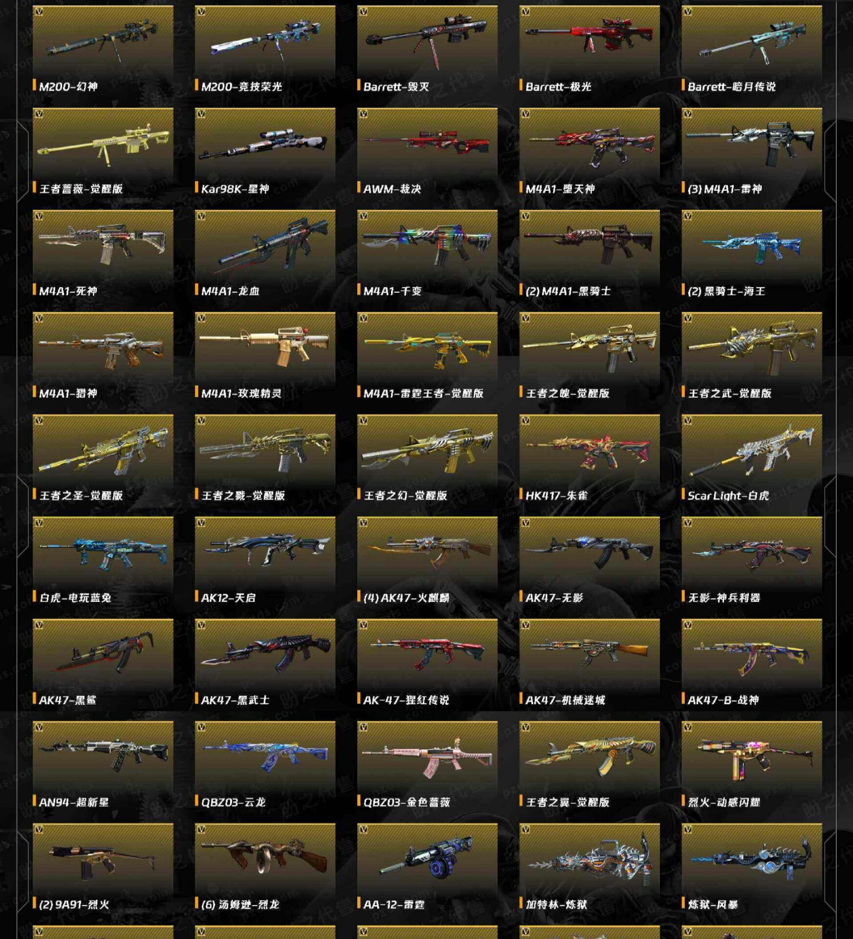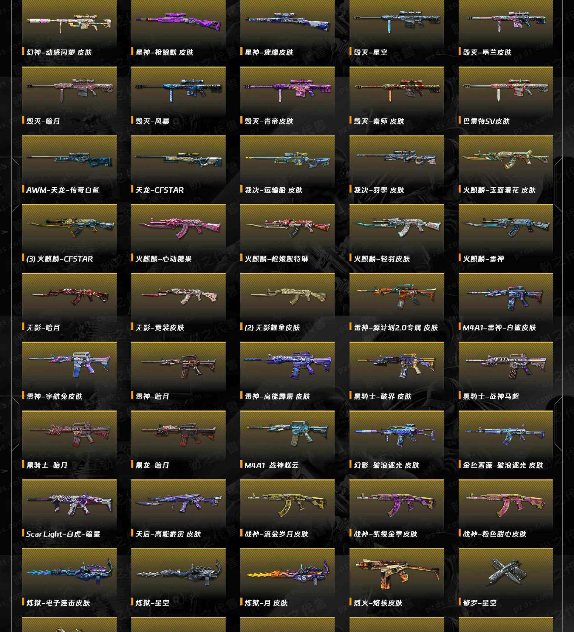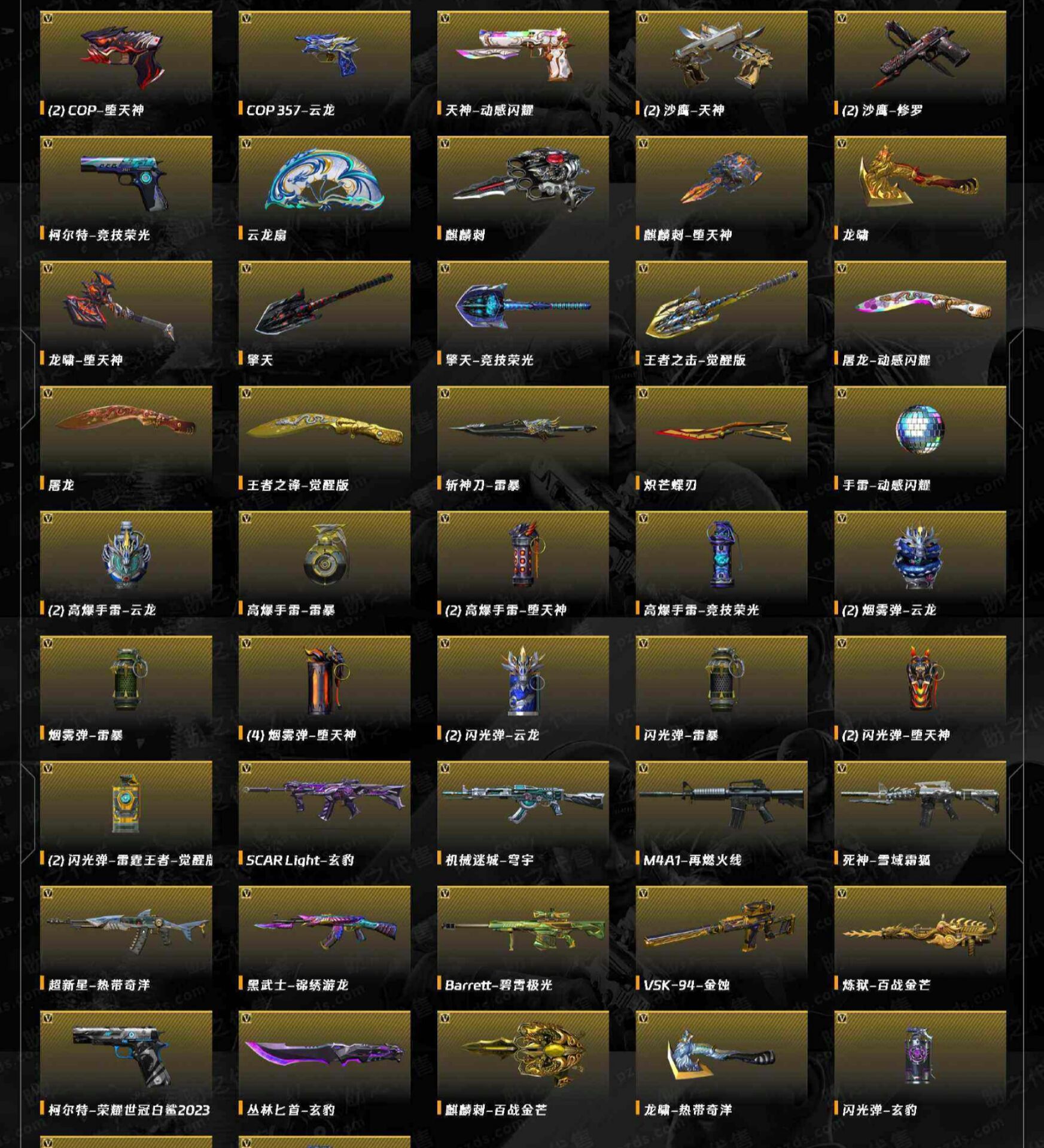 音效卡:幻神 星神 裁决 毁灭 极光 qbz金色蔷薇 雷神 hk417朱雀 黑骑士 副武器:cop堕天神*2 cop云龙 柯尔特荣耀世冠ep 柯尔特荣耀世冠白鲨 usp王者雷暴;USP-雷暴王者,柯尔特-荣耀世冠白鲨2023,炽芒蝶刃,隼,QBZ03-金色蔷薇,G36C-幻影,M200-幻神,