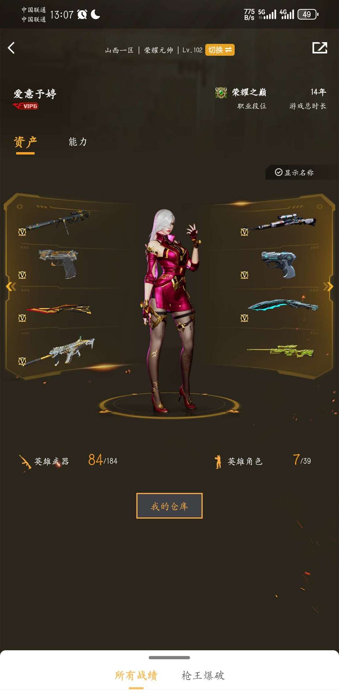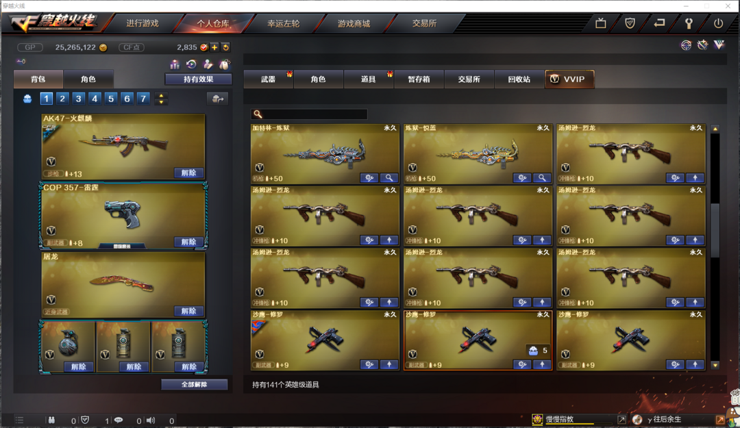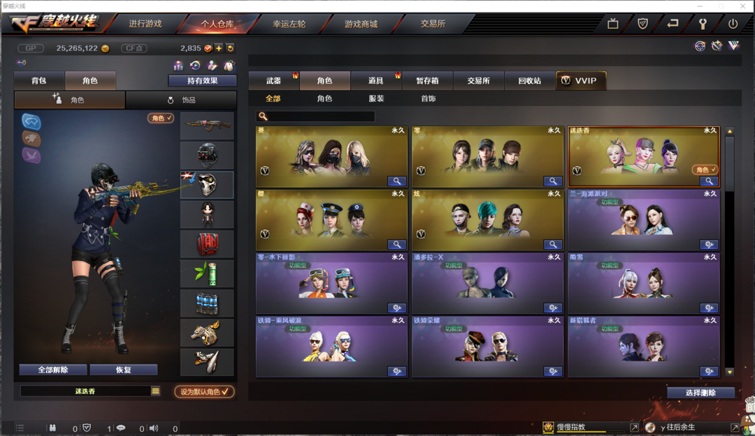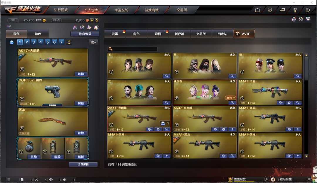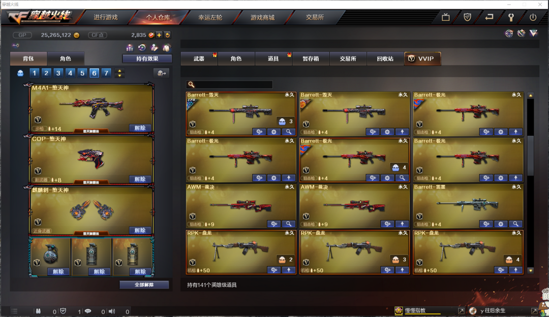 【昵称】峋觅 【角色】传说影煞 传说星骇 王者刀锋 妮妮 王者救世主 零 樱、炫、迷迭香 【主武白鲨EP幻神套 G36 加利尔天袭 M4A1-千变、AK47-火麒麟、M4A1-黑龙、M4A1-雷神、AK47-无影、M4A1-死神、AK47-黑武士、AN94-超新星、M4A1-武圣、M4A1-雷霆、M4A1-堕天神、M4A1-玫瑰精灵、QBZ03-金色蔷薇、9A-91-烈火、王者之影、王者之武、王者之势、AK47-战神、AWM-天龙、Barrett-毁灭、Barrett-极光、AWM-裁决、Barrett-雷霆、M200-幻神、Barrett-朱雀、6盘龙、2炼狱。7烈龙、斯泰尔蝴蝶、 【副武】沙鹰-修罗、沙鹰-天神、COP357-雷霆、USp-雷暴、COP-堕天神、沙鹰-幻兽 【近身】屠龙、龙啸、擎天、麒麟刺、尼泊尔-雷霆、斩神刀-雷暴 、麒麟刺-堕天神、龙啸-堕天神、女皇利刃-幻兽、水晶宝珠 【投掷】雷霆手雷套、雷暴手雷套、堕天神手雷套、幻兽手雷套、 【音效】火麒麟音效卡、毁灭音效卡、雷神音效卡、黑骑士音效卡、 【道具】步枪弹匣、冲锋枪弹匣、永久防弹衣永久防弹头盔永久C4工具钳永久