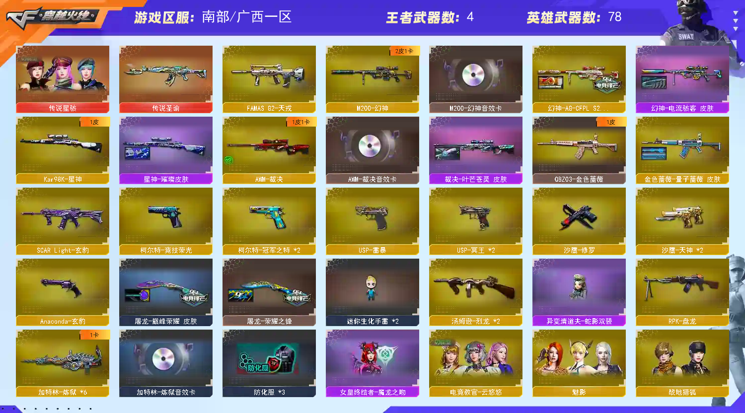 【亮点解析 传说角色 幻神三件套 裁决三件套 】【四防传说星骇 】【m200幻神+音效卡+ag24冠军+电流骇客+冠军之特*2】【98k星神+璀璨】【m200竞技荣光套+usp雷暴 +四防云悠悠】【6炼狱+卡 烈龙*2 盘龙 异变清道夫-蛇影双骄 死亡之眼 】【传说圣谕】【scar玄豹】【qbz金色蔷薇】【朱雀】【火麒麟+卡】【黑龙】【雷神+卡+荣耀之魄】【黑骑士+卡】【毁灭+卡+荣耀之怒 】【裁决+卡 +叶芒苍灵】【玄豹套】【武器:天戎 荣耀世冠雷神 王者猎神 】【10手枪:修罗 天神*2 usp雷暴 usp冥王*2 玄豹 冠军之特*2】【10刀具:屠龙 擎天 麒麟刺*2 竞技荣光*3 玄豹 王者之击 王者冰锋 】【8雷套:竞技荣光*7 玄豹雷】【小人枪:雷神精英刀锋 cop白鲨 异变清道夫-蛇影双骄】【音效卡:炼狱音效卡 黑骑士音效卡 毁灭音效卡 裁决音效卡 火麒麟音效卡 雷神音效卡 幻神音效卡 】【四防角色:云悠悠 王者瞳闭月羞花 职业经理 葵赛博朋克】-;USP-雷暴,柯尔特-冠军之特,传说星骇,电竞教官-云悠悠,RPK-盘龙,QBZ03-金色蔷薇,M200-幻神,