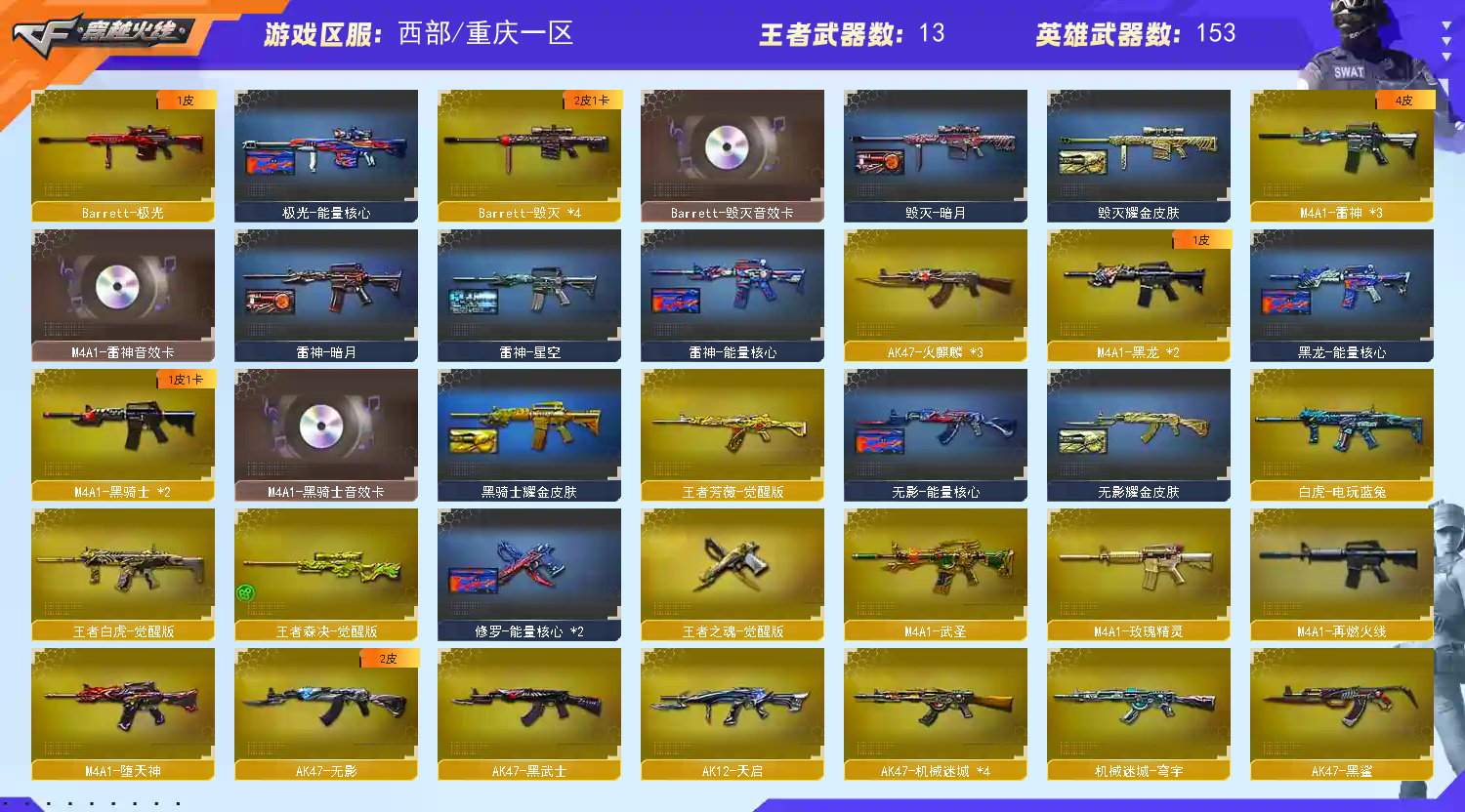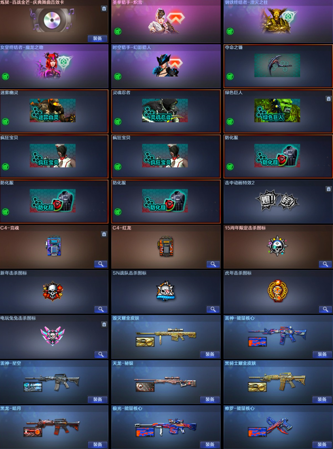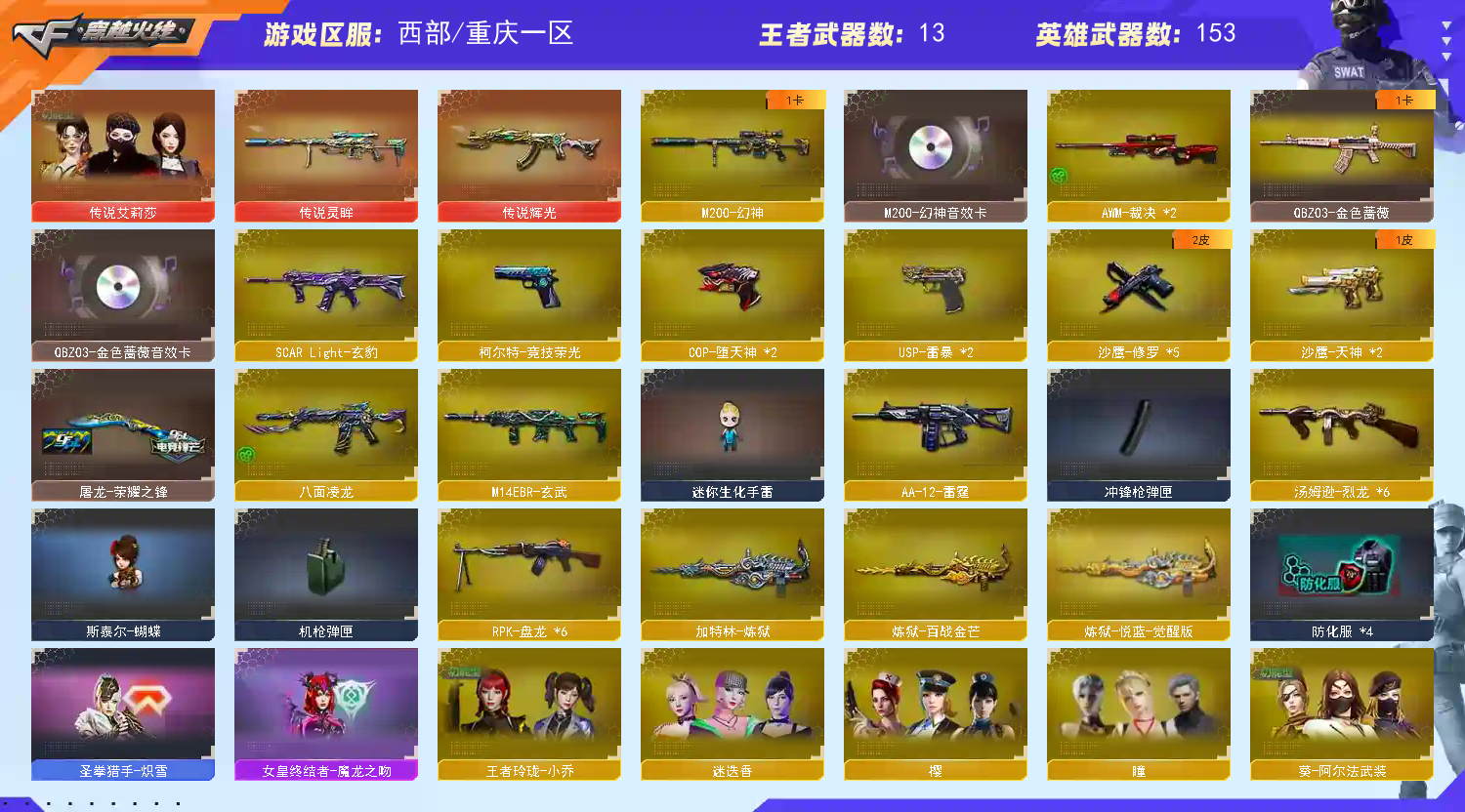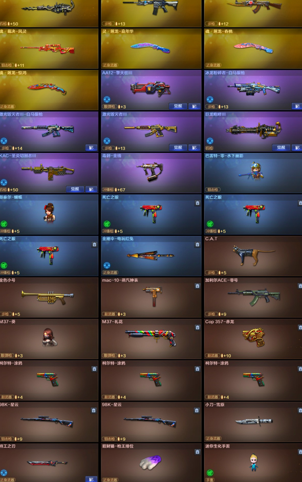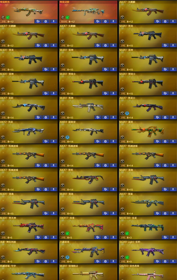 【稀有武器】:传说辉光/传说灵眸/M200-幻神/八面凌龙/M14EBR-玄武/HK417-朱雀/AK47-雷暴/M4A1-堕天神/USP-雷暴(2)/COP-堕天神(2)/柯尔特-竞技荣光/QBZ03-金色蔷薇/AK47-火麒麟(3)/M4A1-黑龙(2)/M4A1-雷神(3)/M4A1-黑骑士(2)/AK47-无影/AK47-黑武士/白虎-电玩蓝兔/Barrett-毁灭(4)/Barrett-极光/AWM-裁决(2)/RPK-盘龙(6)/加特林-炼狱/汤姆逊-烈龙(6)/AA-12-雷霆/斩神刀-雷暴/麒麟刺-堕天神/龙啸-堕天神 【王者武器】:王者之心-觉醒版/王者之魄-觉醒版/王者白虎-觉醒版/王者芳薇-觉醒版/王者森决-觉醒版 【热门角色】:传说艾莉莎/迷迭香/王者玲珑-小乔/潘多拉-X/兔囡囡 【热门音效卡】:M200-幻神音效卡/QBZ03-金色蔷薇音效卡/M4A1-雷神音效卡/Barrett-毁灭音效卡/M4A1-黑骑士音效卡 【热门皮肤】:屠龙-荣耀之锋 【其他亮点】:斯泰尔-蝴蝶/金刚伞-电玩红兔/八面凌龙;USP-雷暴,传说艾莉莎,RPK-盘龙,QBZ03-金色蔷薇,M200-幻神,传说灵眸,