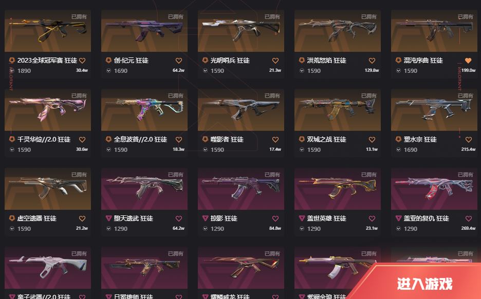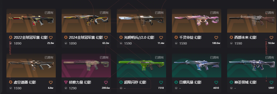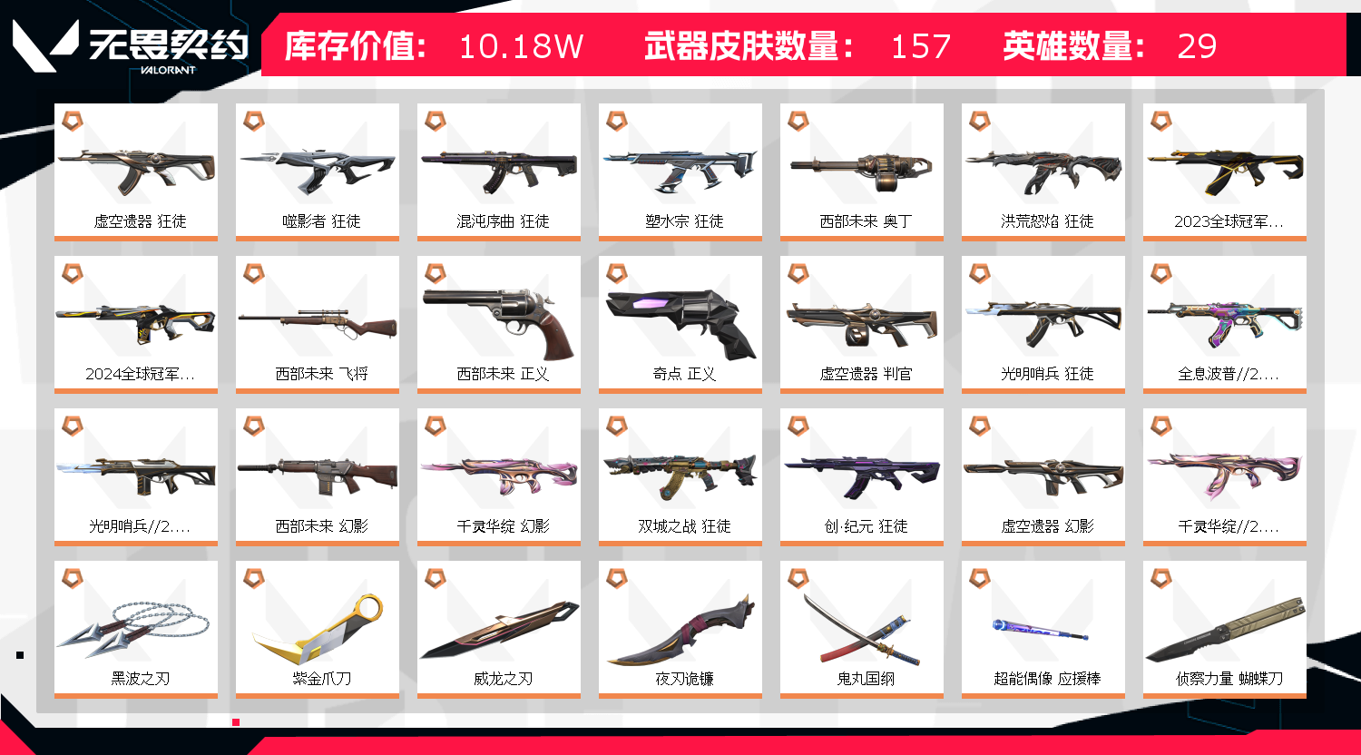 10w库存22套23套24冠军;西部未来 奥丁,黑波之刃,紫金爪刀,威龙之刃,盖亚的复仇 狂徒,虚空遗器 狂徒,掠影 戍卫,