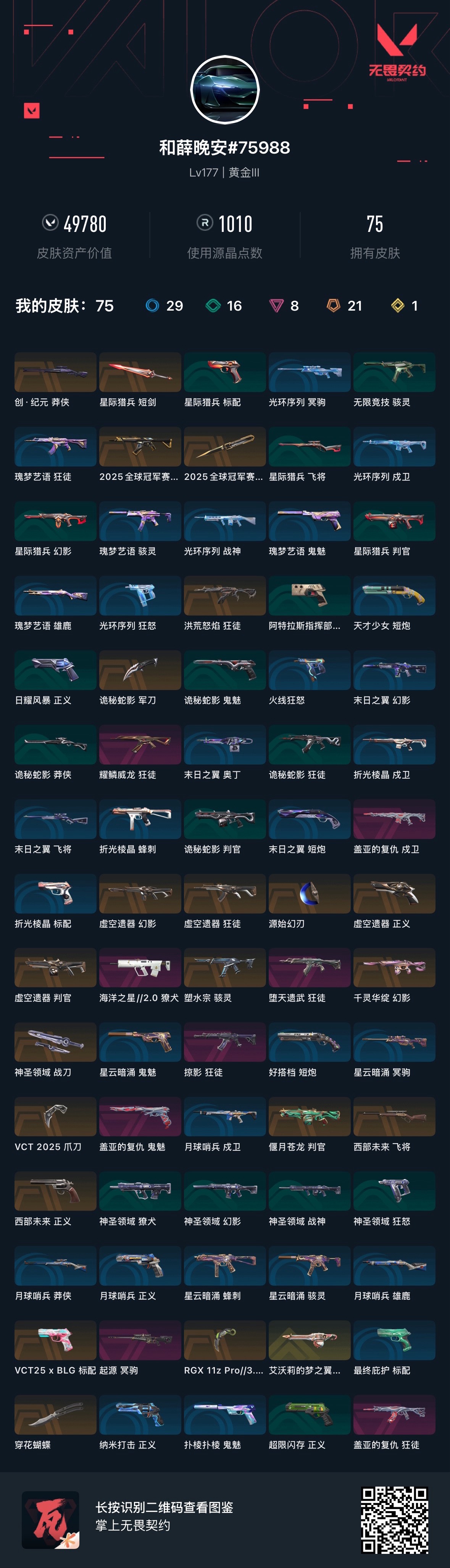 允许 英雄28 武器皮肤数量75 别改游戏名 号主有时登陆WeGame打三角洲;艾沃莉的梦之翼 奥丁,VCT 2025 爪刀,偃月苍龙 判官,盖亚的复仇 狂徒,虚空遗器 狂徒,洪荒怒焰 狂徒,掠影 狂徒,