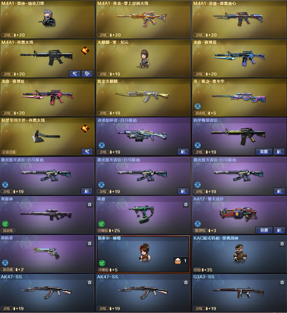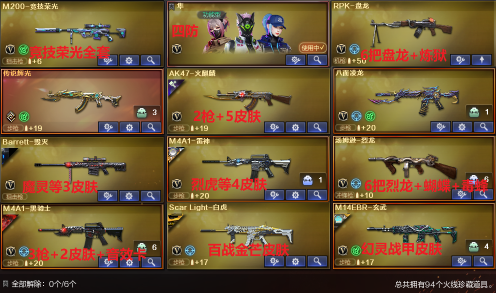 生化性价比✅四防隼+6烈龙蝴蝶+6盘龙炼狱✅传说辉光+八面凌龙✅竞技荣光全套✅白虎玄武✅3黑擎天柱✅全弹匣 稀有武器:传说辉光、八面凌龙、烈龙X6+斯泰尔蝴蝶、烈龙云海游龙、盘龙X6+炼狱、炼狱风暴、炼狱百战金芒、M200竞技荣光、擎天竞技荣光、Scarlight白虎、M14玄武、火麒麟X2、黑龙、雷神、黑骑士X3、死神、黑武士、无影神兵利器、黑武士锦绣游龙、超新星热带奇洋、金色蔷薇古蛇迷踪、死神雪域霜狐、机械迷城穹宇、HK朱雀电竞之星、玫瑰精灵、烈火、烈火动感闪耀、黑骑士海王X2、雷神葫芦兄弟、白虎电玩蓝兔、毁灭、Barrett金色蔷薇、暗月传说X3、修罗、天神动感闪耀、修罗古蛇迷踪、龙啸、擎天、麒麟刺、幻灵之锋X2、屠龙动感闪耀、擎天云海游龙、龙啸热带奇洋、丛林匕首玄豹、麒麟刺百战金芒、屠龙电竞之星、龙啸烈火龙威、竞魂无影、碧霄极光、龙血赛博蓝、龙血赛博玫、冰龙粉碎者-白马银枪、机甲撕裂者、激光毁灭者-白马银枪X3、双面神、毒蜂、擎天柱、巡航者 稀有角色:隼(四防:生化背包变更+捕食者之眼+生化觉醒狂暴化+佣兵觉醒无需换弹)、研、樱、王者-零-国色天香(四防)、王者樱-热浪之夏、零纪元、战地猎狐、幻面灵狐、葵-阿尔法武装、奇洋探员、乔伊教练、蛇影宗、修道士、雪域霜狐、云海玲珑、超能女侍-觉、芳心审判者、幻影猎手-战灵 音效卡:黑骑士音效卡X2、修罗古蛇迷踪音效卡、死神雪域霜狐音效卡、炼狱百战金芒音效卡、麒麟刺百战金芒音效卡、朱雀电竞之星竞星悦动音效卡、屠龙电竞之星竞星悦动音效卡 稀有皮肤:白虎百战金芒皮肤、玄武幻灵战甲皮肤、黑骑士白马银枪皮肤/地狱火皮肤、毁灭魔灵皮肤/风暴皮肤/黑大圣皮肤、雷神动感闪耀皮肤/机甲刑天皮肤/暗月皮肤/烈虎皮肤、修罗星空皮肤、火麒麟平天大圣皮肤/雷神皮肤/轻羽皮肤/心动糖果皮肤/CFstar皮肤 王者炫金武器:王者之心、王者之影、王者之势、王者之击、王者之刺、炫金火麒麟 投掷套装:幻灵套X2、竞技荣光套、手雷动感闪耀、手雷云海游龙、手雷热带奇洋、手雷古蛇迷踪、烟雾弹古蛇迷踪 小人枪武器特殊武器:朱雀蛇影宗、火麒麟-零纪元、黑桃战神、迷你地狱终结者、猫猫手套、迷你生化手雷;隼,RPK-盘龙,Scar Light-白虎,