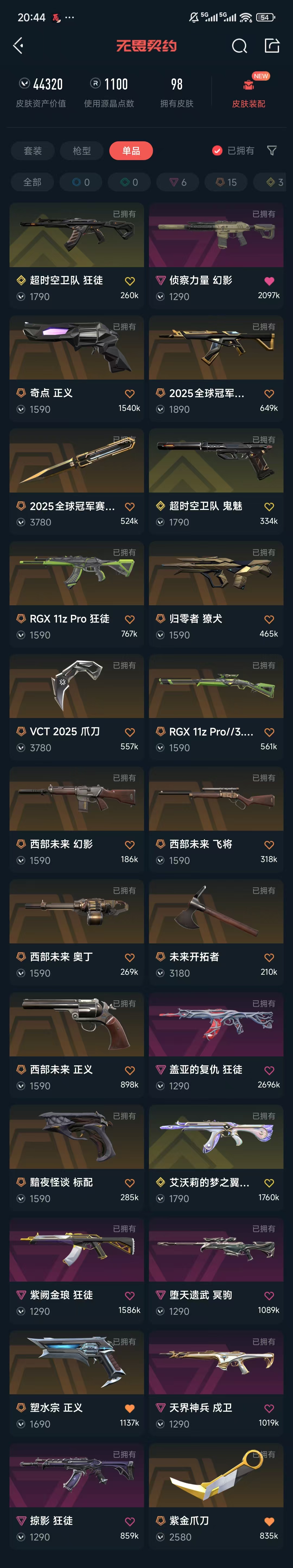 可排位 英雄28 武器皮肤数量98;西部未来 奥丁,紫金爪刀,VCT 2025 爪刀,归零者 獠犬,盖亚的复仇 狂徒,掠影 狂徒,侦察力量 幻影,