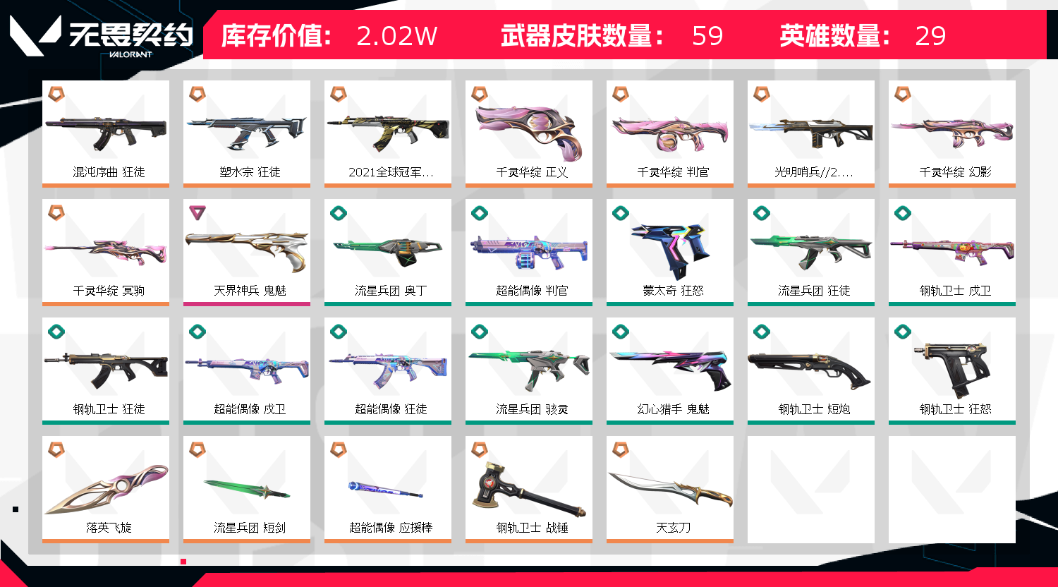 首页 > 租号大厅 > 无畏契约-wegame > wegame/wegame > 可排位 英雄28 武器皮肤数量58 🔥21冠军 🔥莲花套🔥天玄刀🔥天界鬼魅🔥塑水宗🔥混沌