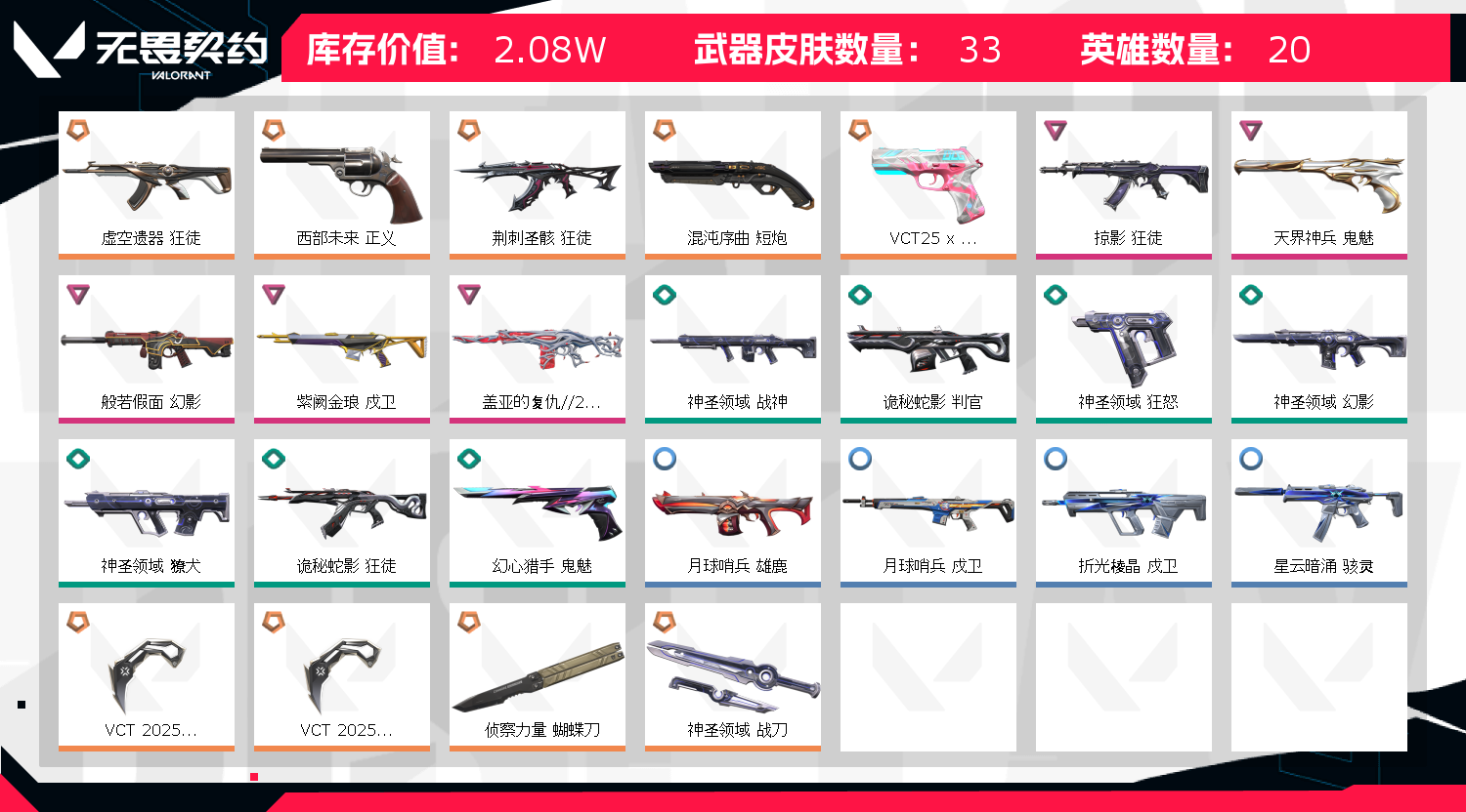 极品青铜❤荆棘圣骸狂徒❤VCT爪刀❤VCT标配❤天界神兵鬼魅❤边陲正义❤虚无狂徒❤掠夺狂徒❤紫阙琳琅戍卫❤假面幻影;VCT 2025 爪刀,虚空遗器 狂徒,掠影 狂徒,西部未来 正义,天界神兵 鬼魅,