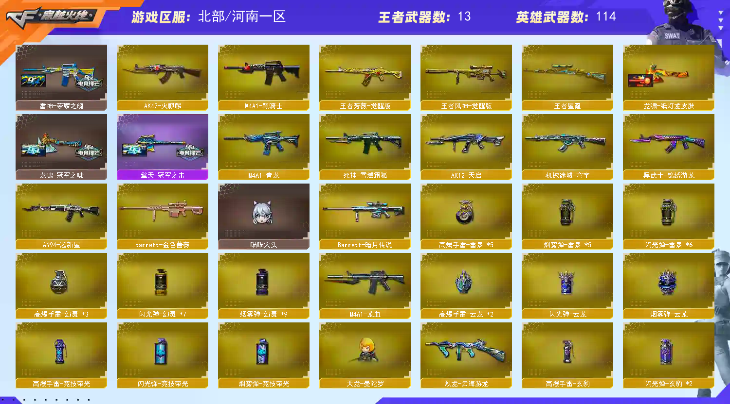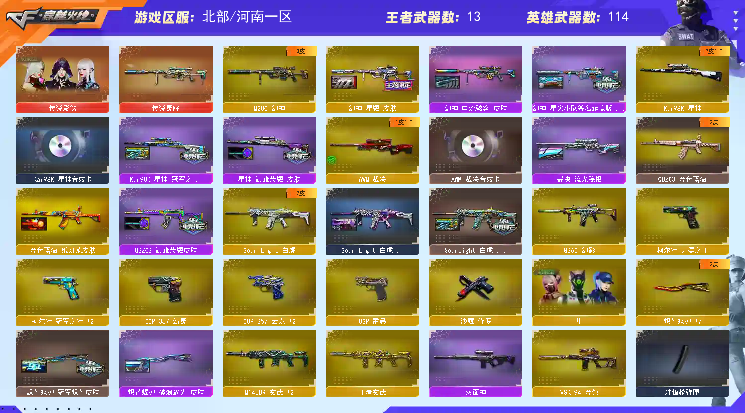本账号已经完成备案 开挂者 必将追究到底;USP-雷暴,柯尔特-无冕之王,柯尔特-冠军之特,炽芒蝶刃,传说影煞,隼,RPK-盘龙,