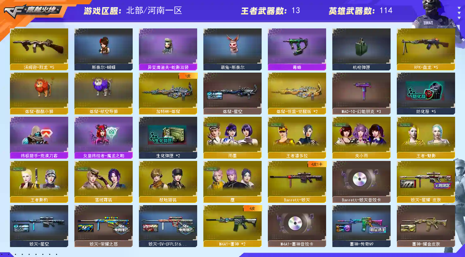 首页 > 租号大厅 > 穿越火线 > 网通区/河南一区 > 睡觉:7刀2皮3玄武+狮子➕5盘龙⚡️6把烈龙➕斯太尔蝴蝶⚡️斯太尔萌兔➕蛇影双骄⚡️毒蜂⚡️