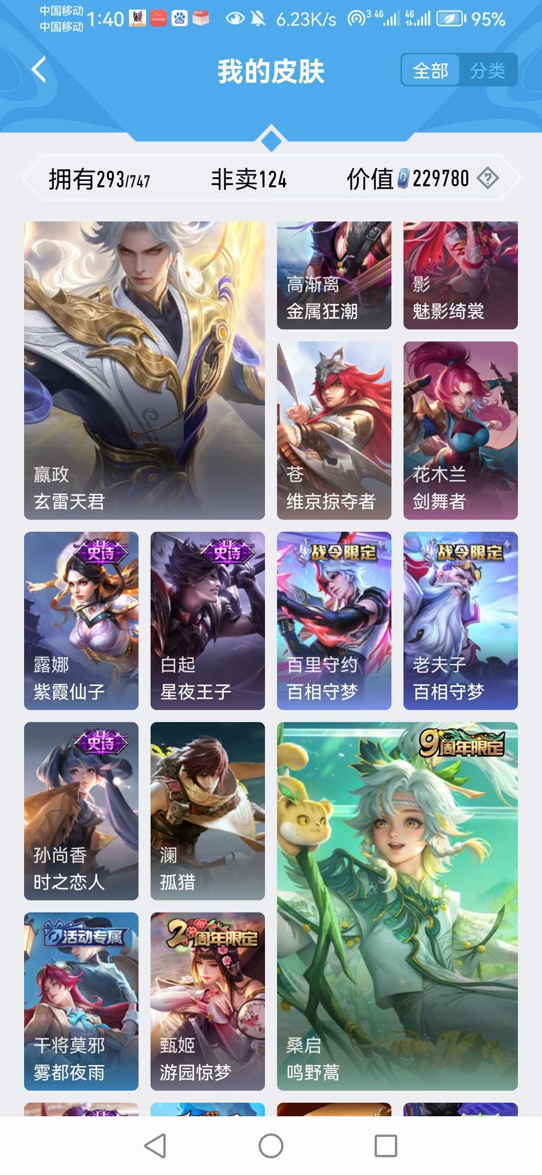 v10、12水555皮、死亡执政官、刘备星传说时之思念、小兵皮肤大耳狗甜茶、瑶无双真我赫兹、愿照·九州拓、怪盗基德、画中仙、至尊宝、凤求凰、神威、天魔缭乱
