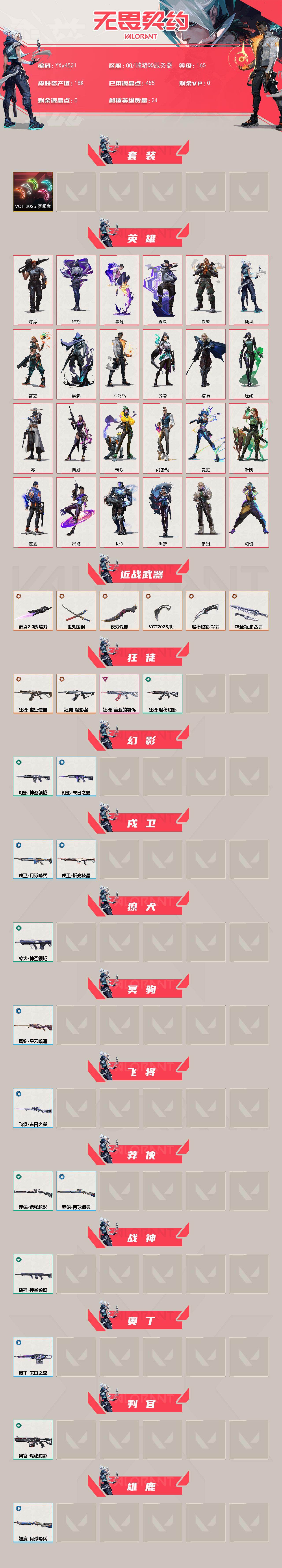 冻结三分钟内解除,短信通知重新上即可!喜欢收藏不迷路、游戏异常进小黑屋、时间不够请提前续租或者不要开局 【套装】:VCT 2025 赛季套装 【英雄】:幻棱,炼狱,维斯,暮蝶,壹决,铁臂,捷风,雷兹,幽影,不死鸟,贤者,猎枭,蝰蛇,零,芮娜,奇乐,尚勃勒,霓虹,斯凯,夜露,星礈,K/O,黑梦,钢锁 【近战武器】:近战武器-奇点//2.0 蝴蝶刀,近战武器-VCT 2025 爪刀,近战武器-鬼丸国纲,近战武器-夜刃诡镰,近战武器-诡秘蛇影 军刀,近战武器-神圣领域 战刀 【狂徒】:狂徒-虚空遗器,狂徒-噬影者,狂徒-盖亚的复仇,狂徒-诡秘蛇影 【幻影】:幻影-神圣领域,幻影-末日之翼 【戍卫】:戍卫-月球哨兵,戍卫-折光棱晶 【獠犬】:獠犬-神圣领域 【冥驹】:冥驹-星云暗涌 【飞将】:飞将-末日之翼 【莽侠】:莽侠-诡秘蛇影,莽侠-月球哨兵 【战神】:战神-神圣领域 【奥丁】:奥丁-末日之翼 【判官】:判官-诡秘蛇影 【雄鹿】:雄鹿-月球哨兵 【骇灵】:骇灵-星云暗涌 【蜂刺】:蜂刺-星云暗涌,蜂刺-折光棱晶 【标配】:标配-最终庇护,标配-折光棱晶 【正义】:正义-超限闪存,正义-月球哨兵 【鬼魅】:鬼魅-诡秘蛇影,鬼魅-星云暗涌 【狂怒】:狂怒-神圣领域 【短炮】:短炮-末日之翼 【卡面】:激斗汉堡 卡面,《双城之战》拥抱 卡面,欢迎来到底城 卡面,南瓜盛典 卡面,修车达人 卡面,正义的化身 卡面,声感陷阱设计图 卡面,梦幻奶茶 卡面,源能反应 卡面,打造专属狂徒 卡面,零点嗅探设计图 卡面,无畏契约GO!一卷:芮娜 卡面,清除名单 卡面,无畏契约GO!一卷:零 卡面,沙尘幻旅 卡面,代号红色 卡面,新兵报到 卡面,V契约 卡面,无畏契约 卡面 【喷漆】:嘭! 喷漆,都算到了 喷漆,控场勿近 喷漆,伤心心 喷漆,小丑猫 喷漆,熊抱 喷漆,捷风差距 喷漆,拼一枪 喷漆,我觉得不行 喷漆,我的刀呢? 喷漆,新潮流 喷漆,买装还是存钱 喷漆,无畏契约GO!一卷:捷风 喷漆,无畏契约GO!一卷:贤者 喷漆,胜利属于无畏契约 喷漆,GLHF 喷漆,无畏契约 喷漆 【挂饰】:《双城之战》小蛋糕 挂饰,第九季//第三幕 纪念币 挂饰,工具腰带 挂饰,熔岩灯 挂饰,第九季//第二幕 纪念币 挂饰,迷你浓缩 挂饰,Z世代特饮 挂饰,第九季//一幕 纪念币 挂饰,战术河童 挂饰,荧光棒 挂饰,第八季//第三幕 纪念币 挂饰,第八季//第二幕 纪念币 挂饰 ,天外飞客 挂饰,无畏契约 纪念币 挂饰;VCT 2025 爪刀,盖亚的复仇 狂徒,虚空遗器 狂徒,噬影者 狂徒,