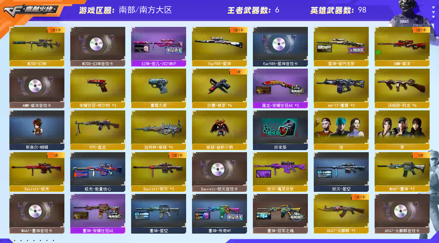 双全天花板幻神宠儿三件套星神三件套裁决带卡4把高质量手枪六烈蝴蝶4炼狱1盘龙生化满配主流三件套;荣耀世冠-柯尔特,RPK-盘龙,M200-幻神,Kar98K-星神,