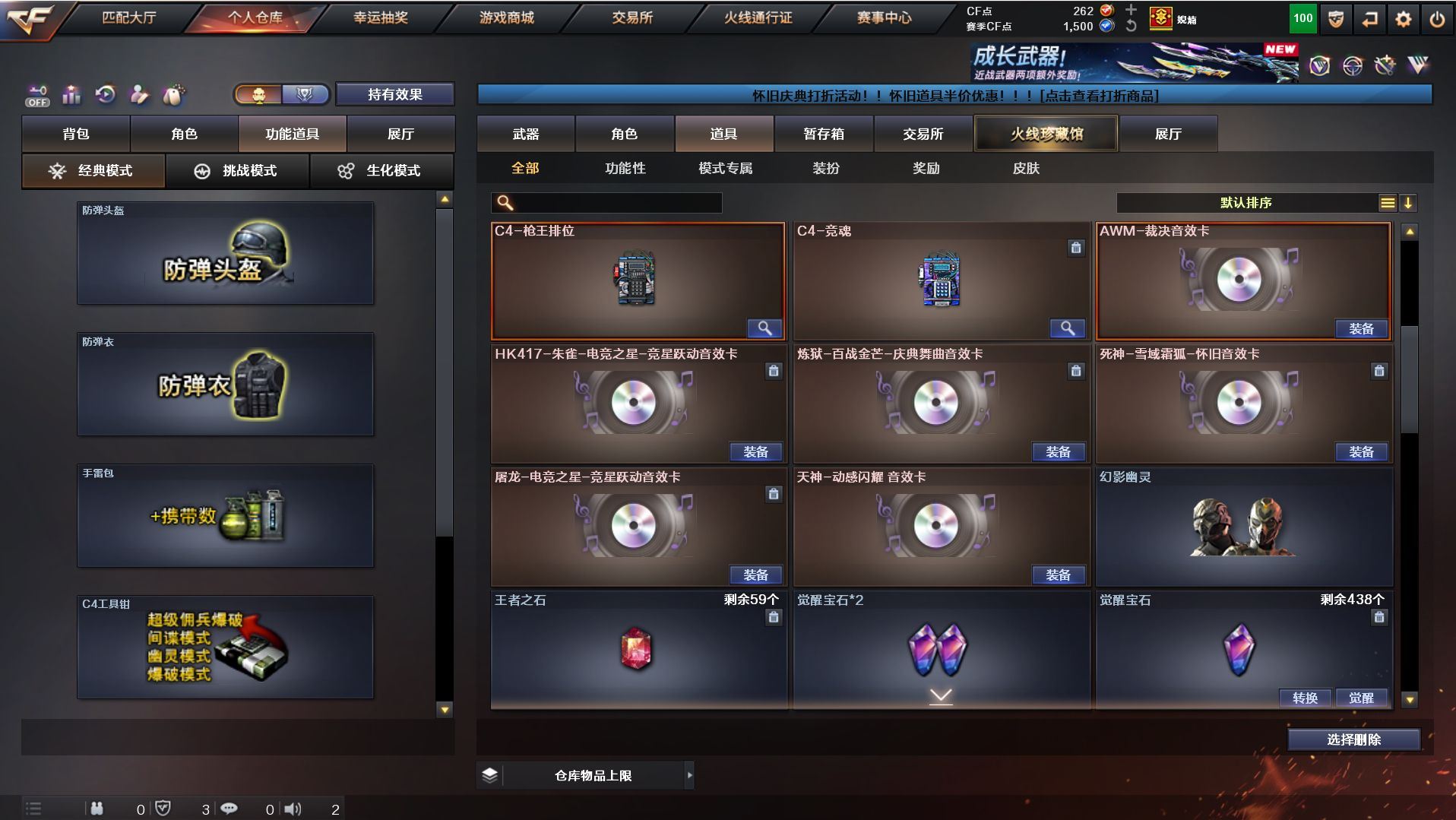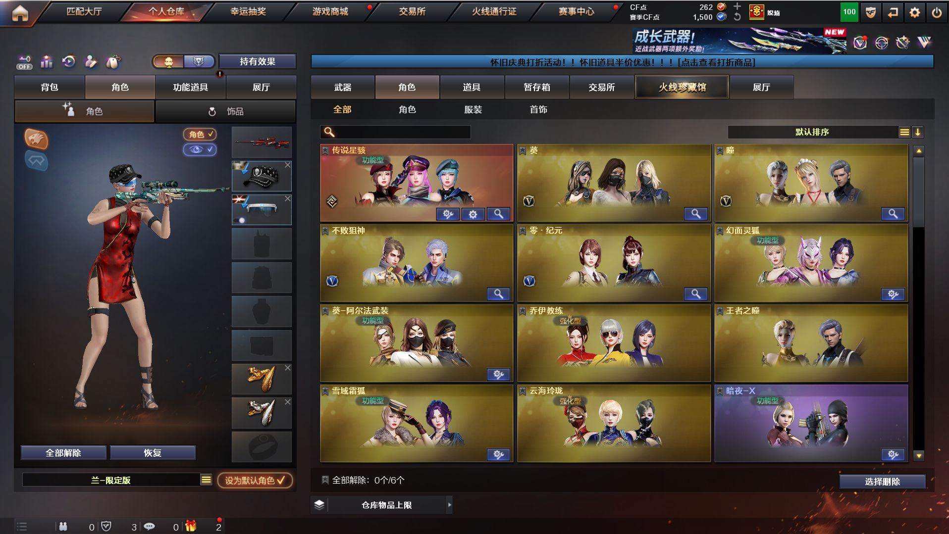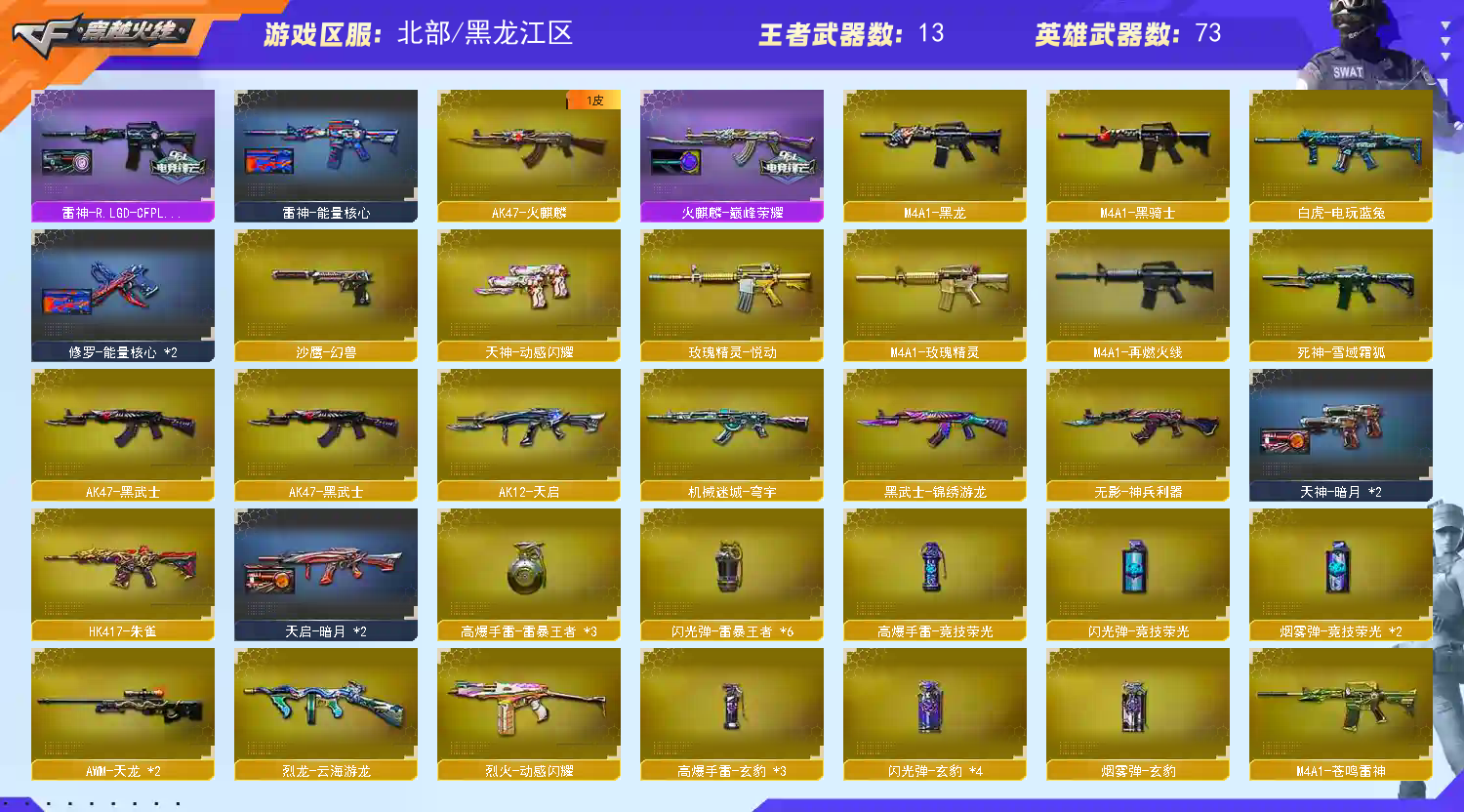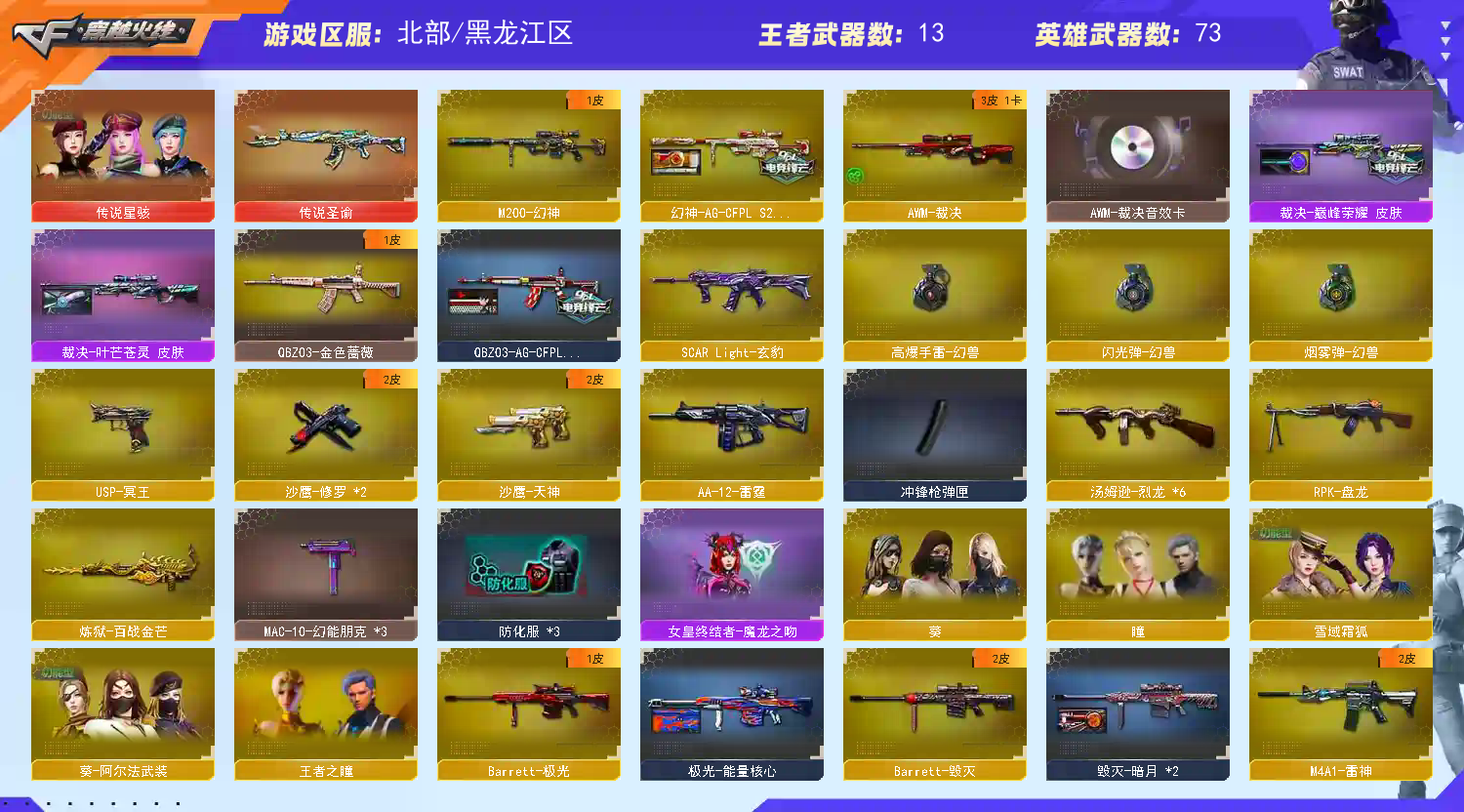 【传说武器】:传说圣谕【传说角色】:传说星骇【热门武器】:传说圣谕,QBZ03-金色蔷薇,HK417-朱雀,M200-幻神,死亡之眼,白虎-电玩蓝兔,M4A1-黑骑士,汤姆逊-烈龙*6,RPK-盘龙,沙鹰-修罗*2,高爆手雷-幻兽【王者炫金武器】:玫瑰精灵-悦动【音效卡】:天神-动感闪耀 音效卡,AWM-裁决音效卡,炼狱-百战金芒-庆典舞曲音效卡,死神-雪域霜狐-怀旧音效卡【皮肤】:幻神-AG-CFPL S24冠军 皮肤,QBZ03-AG-CFPLS19冠军,裁决-巅峰荣耀 皮肤,裁决-叶芒苍灵 皮肤,裁决-胜者为王 皮肤,雷神-能量核心,雷神-R.LGD-CFPLS18冠军,M4A1-再燃火线,火麒麟-巅峰荣耀,毁灭-暗月*2,毁灭-英雄计划 皮肤,黑龙-暗月,无影-暗月,无影-能量核心,天启-暗月*2,极光-能量核心,炼狱-星空,修罗-能量核心*2,天神-暗月*2,轻型军用手斧-再燃火线,龙啸-青青莓果 皮肤,麒麟刺-月皮肤【角色】:葵,瞳,王者之瞳,雪域霜狐,乔伊教练,云海玲珑,暗夜-X,初恋灵狐,风暴女,嘉年华灵狐,疾风,灵狐者-X,潘多拉-X,潘多拉-甜心教官,影武者-X,幽【人偶武器】:AWM-灵狐-15周年嘉年华*2,COP-旗袍,迷你波特博士,夺魂,迷你生化手雷,生化手雷-机甲核心*2,深渊终结者手雷*2,灵狐娃娃手雷【暴走生化】:死亡之眼,超级对讲机【挑战大师】:激光毁灭者III-白马银枪,神圣爆裂者-末日III【英雄级武器】:AK47-火麒麟,M4A1-黑龙,M4A1-雷神,M4A1-黑骑士,AK47-黑武士,AK12-天启,HK417-朱雀,无影-神兵利器,黑武士-锦绣游龙,死神-雪域霜狐,SCAR Light-玄豹,M4A1-玫瑰精灵,QBZ03-金色蔷薇,烈火-动感闪耀,白虎-电玩蓝兔,AWM-天龙*2,Barrett-毁灭,Barrett-极光,AWM-裁决,M200-幻神,RPK-盘龙,炼狱-百战金芒,汤姆逊-烈龙*6,烈龙-云海游龙,AA-12-雷霆,沙鹰-修罗*2,沙鹰-天神,沙鹰-幻兽,USP-冥王,天神-动感闪耀,屠龙*2,龙啸,擎天,麒麟刺,擎天-竞技荣光,屠龙-动感闪耀,擎天-云海游龙,女皇利刃-幻兽,麒麟刺-百战金芒,王者之锋-觉醒版,高爆手雷-幻兽,高爆手雷-竞技荣光,手雷-动感闪耀,手雷-云海游龙,高爆手雷-玄豹*3,闪光弹-幻兽,闪光弹-竞技荣光,闪光弹-玄豹*4,烟雾弹-幻兽,烟雾弹-竞技荣光*2,烟雾弹-玄豹,烟雾弹-荣耀世冠EP*2,M4A1-赤狱骑士,M4A1-苍鸣雷神【道具】:BS战队炫彩背包,CFS限定背包,云山科技背包,云海游龙炫彩背包,全能枪王背包,女皇终结者-背包,战舰背包,炫彩背包,百战金芒炫彩背包,超级背包,雪域霜狐炫彩背包,女皇终结者-魔龙之吻,救世主-黑桃战神,绿色巨人,灵魂忍者,变异宝贝,妖姬,迷雾幽灵,夺命之镰,防化服*3,金色流光-枪王排位*2,星辰流光-枪王排位,流光-再燃火线,枪王排位28赛季金色流光,枪王排位29赛季金色流光,语音特效-盛典烟火,语音特效-怀旧,雪域霜狐表情,萌萌小葵表情,动感闪耀表情,云海游龙表情,EP战队名片,EP战队喷图,EP战队击杀图标,防弹头盔*3,防弹衣*4,C4工具钳*4,手雷包*3【特殊枪械】:1黑骑士,6烈龙,1盘龙;传说星骇,RPK-盘龙,QBZ03-金色蔷薇,M200-幻神,传说圣谕,