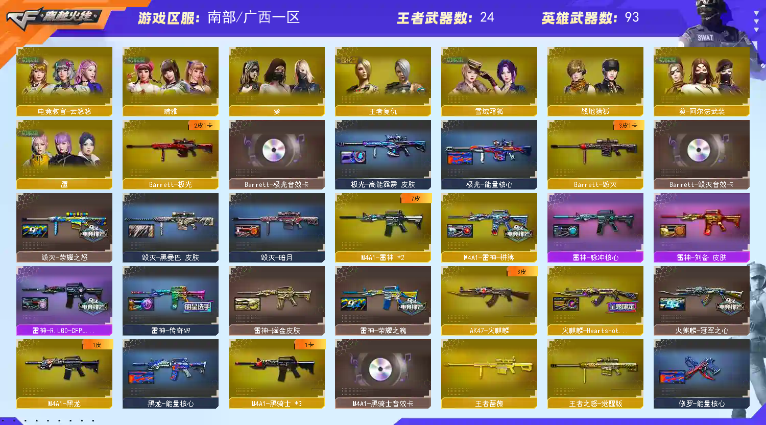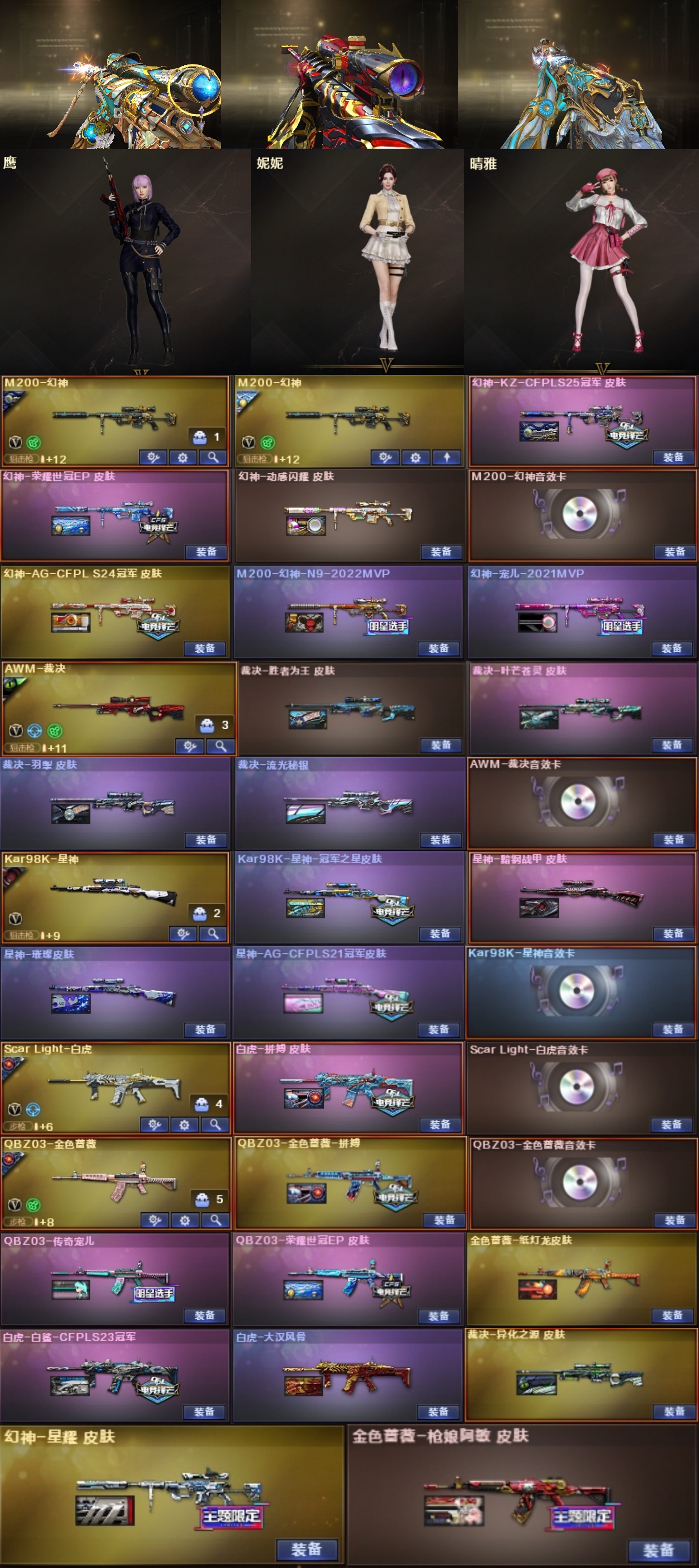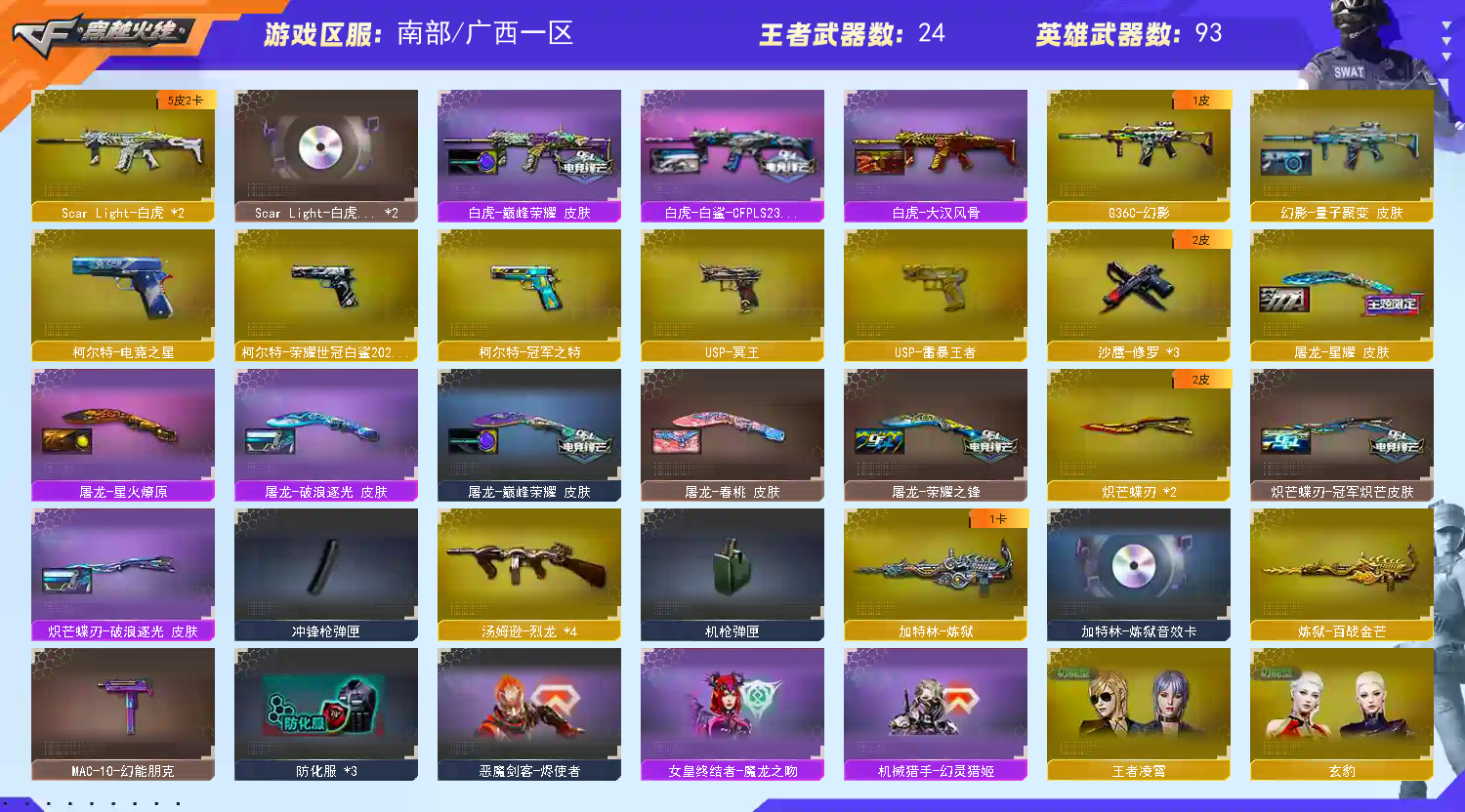 ★收藏好评! 由于异地登录保护机制,部分客户在使用客户端自动上号时会出现密码错误,注意本号密码不会错误,请多尝试5-6次!本账号已经过虚拟财产认定,请各位科技大神高抬贵手。请素质租号,文明游戏,谢谢大家配合!!;USP-雷暴王者,柯尔特-荣耀世冠白鲨2023,柯尔特-冠军之特,炽芒蝶刃,电竞教官-云悠悠,晴雅,妮妮,