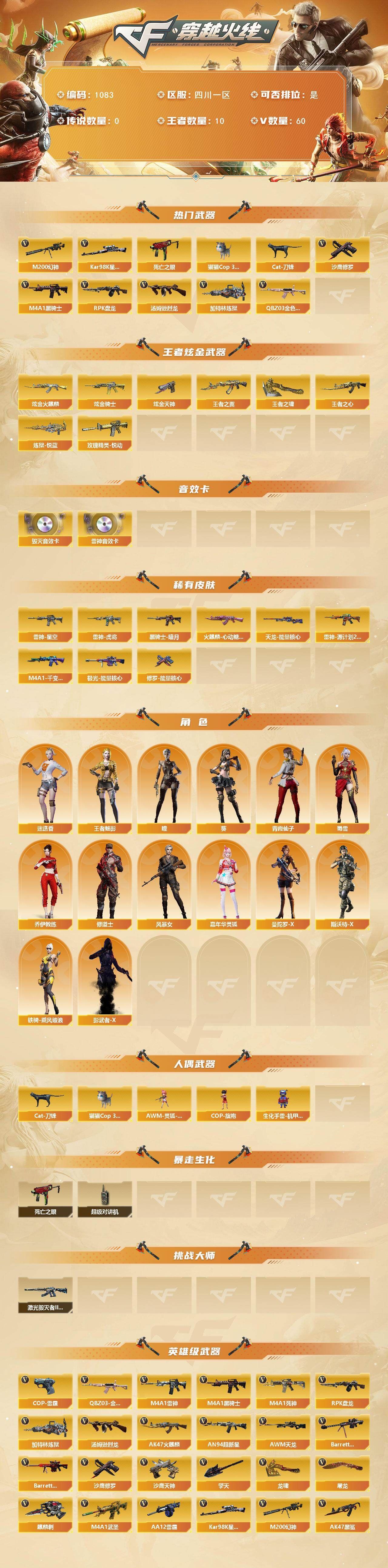 【热门武器】:QBZ03-金色蔷薇,M200-幻神,死亡之眼*2,Kar98K-星神,Cat-刀锋,M4A1-黑骑士,汤姆逊-烈龙*2,RPK-盘龙,加特林-炼狱,猫猫Cop 357,沙鹰-修罗*3【王者炫金武器】:王者之翼,玫瑰精灵-悦动,王者之心,炼狱-悦蓝,王者之啸*2,炫金火麒麟,炫金骑士,炫金天神*3【音效卡】:M4A1-雷神音效卡,Barrett-毁灭音效卡【皮肤】:雷神-星空,雷神-虎将,雷神-源计划2.0专属 皮肤,火麒麟-心动糖果,M4A1-千变-孔明皮肤,黑骑士-暗月,天龙-能量核心,极光-能量核心,修罗-能量核心【角色】:葵,瞳,迷迭香,王者-魅影,乔伊教练,修道士,风暴女,嘉年华灵狐,曼陀罗-X,青霞仙子,斯沃特-X,蜀雪,铁骑-乘风破浪,影武者-X【人偶武器】:AWM-灵狐-15周年嘉年华,COP-旗袍*3,Cat-刀锋,猫猫Cop 357,生化手雷-机甲核心【暴走生化】:死亡之眼*2,超级对讲机【挑战大师】:激光毁灭者III-白马银枪【英雄级武器】:AK47-火麒麟*2,M4A1-雷神*2,M4A1-黑骑士,M4A1-死神*2,AN94-超新星*2,M4A1-武圣,AK47-黑鲨*2,无影-神兵利器,QBZ03-金色蔷薇,王者之魄-觉醒版,王者之势-觉醒版,AK-47-猩红传说*2,AWM-天龙,Barrett-毁灭,Barrett-极光*3,M200-幻神,Kar98K-星神,RPK-盘龙,加特林-炼狱,汤姆逊-烈龙*2,烈龙-悦心-觉醒版,AA-12-雷霆,沙鹰-修罗*3,沙鹰-天神*2,COP-雷霆,Glock18-武圣,屠龙*8,龙啸*4,擎天*2,麒麟刺,王者之击-觉醒版,高爆手雷-雷霆*2,闪光弹-雷霆*2,烟雾弹-雷霆*2【道具】:冰冰背包-猛男专用,炫彩背包,超级背包,绿色巨人,灵魂忍者,变异宝贝,迷雾幽灵,夺命之镰,防化服*3,金色流光-枪王排位,流光-鎏金之域,枪王排位29赛季金色流光,防弹头盔*4,防弹衣*4,C4工具钳*3,手雷包*4【特殊枪械】:1黑骑士,2烈龙,1盘龙,1炼狱;RPK-盘龙,QBZ03-金色蔷薇,M200-幻神,Kar98K-星神,