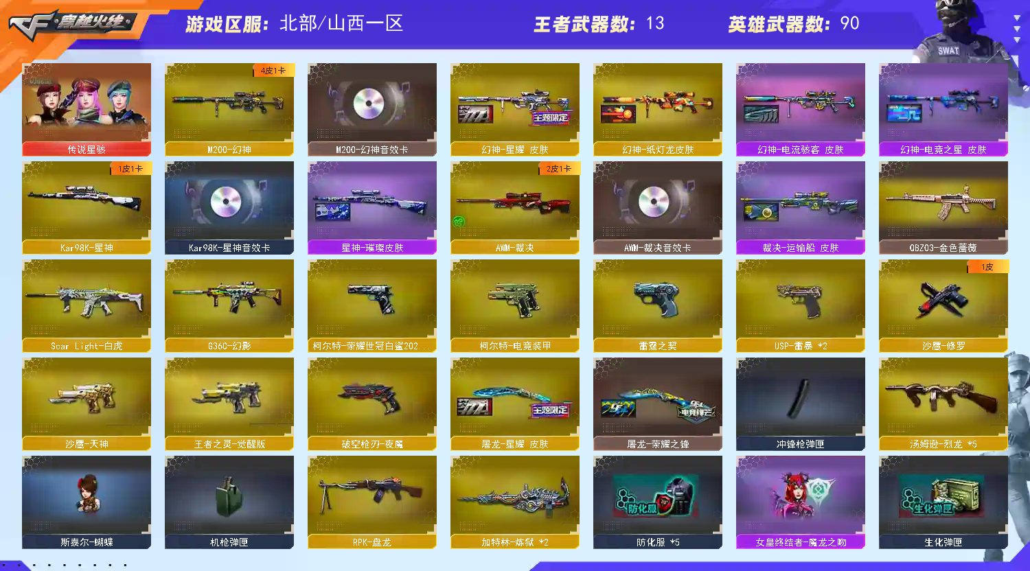 首页 > 租号大厅 > 穿越火线 > 网通区/山西一区 > 【北.部】天花板♥星骇幻神三件套♥裁决三件套♥星神三件套♥白虎qbz幻影♥满质量手枪满雷套♥主流带卡