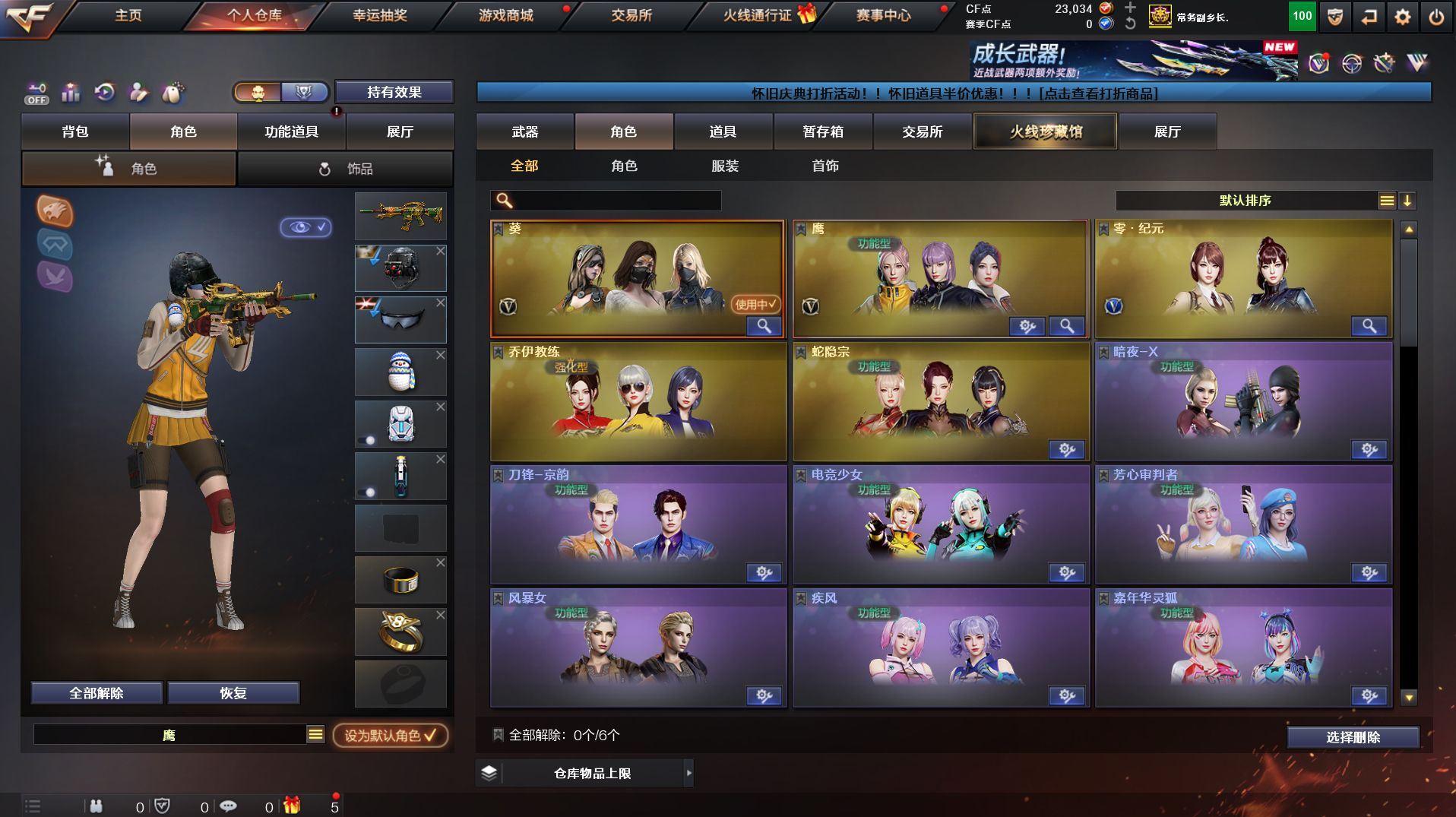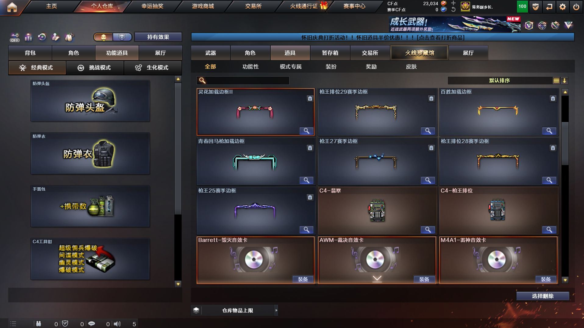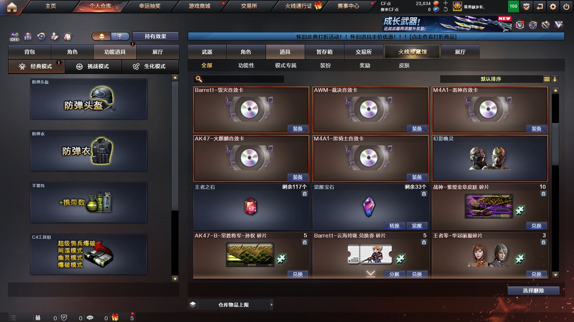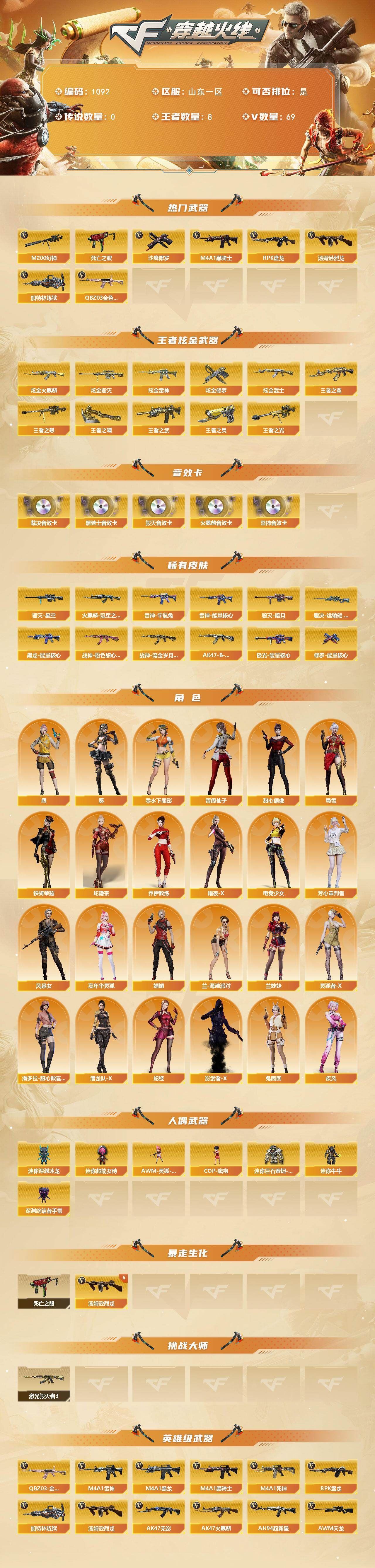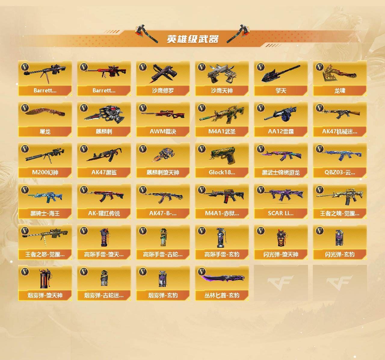QBZ03-金色蔷薇,M200-幻神,死亡之眼*2,M4A1-黑骑士*2,汤姆逊-烈龙*6,RPK-盘龙*2,加特林-炼狱,沙鹰-修罗*5【王者炫金武器】:王者之翼,王者之武,王者之光,王者之怒,王者之灵,王者之啸,炫金火麒麟,炫金雷神,炫金武士,炫金毁灭*2,炫金修罗【音效卡】:AK47-火麒麟音效卡,M4A1-雷神音效卡,M4A1-黑骑士音效卡,Barrett-毁灭音效卡,AWM-裁决音效卡【皮肤】:裁决-运输船 皮肤,雷神-能量核心,雷神-宇航兔皮肤,火麒麟-冠军之心,毁灭-暗月,毁灭-星空,黑龙-能量核心,战神-粉色甜心皮肤*2,战神-流金岁月皮肤,AK47-B-常胜将军-刘备,极光-能量核心,修罗-能量核心【角色】:葵,鹰,蛇隐宗,乔伊教练,暗夜-X,电竞少女,芳心审判者,风暴女,嘉年华灵狐,疾风,娟娟,兰-海滩派对,兰妹妹,零-水下丽影,灵狐者-X,潘多拉-甜心教官,潜龙队-X,青霞仙子,蛇姬,甜心偶像,蜀雪,铁骑荣耀,兔囡囡,影武者-X【人偶武器】:AWM-灵狐-15周年嘉年华,COP-旗袍,迷你深渊冰龙*2,迷你牛牛,深渊终结者手雷,迷你超能女侍,迷你巨石泰坦-魔花研究所【暴走生化】:死亡之眼*2【挑战大师】:激光毁灭者III【英雄级武器】:AK47-火麒麟,M4A1-黑龙,M4A1-雷神,M4A1-黑骑士*2,AK47-无影,M4A1-死神,AN94-超新星,M4A1-武圣*3,AK47-机械迷城,AK47-黑鲨,QBZ03-云龙,黑武士-锦绣游龙,SCAR Light-玄豹,QBZ03-金色蔷薇,王者之魄-觉醒版,AK-47-猩红传说*2,AK47-B-战神,黑骑士-海王,AWM-天龙,Barrett-毁灭,Barrett-极光,AWM-裁决,M200-幻神,王者之怒-觉醒版,RPK-盘龙*2,加特林-炼狱,汤姆逊-烈龙*6,AA-12-雷霆,沙鹰-修罗*5,沙鹰-天神,Anaconda-玄豹,Glock18-武圣*2,屠龙*3,龙啸,麒麟刺-堕天神*2,擎天*2,麒麟刺,丛林匕首-玄豹,高爆手雷-堕天神,高爆手雷-古蛇迷踪,高爆手雷-玄豹*3,闪光弹-堕天神,闪光弹-玄豹*2,烟雾弹-堕天神,烟雾弹-古蛇迷踪,烟雾弹-玄豹*2,M4A1-赤狱骑士【道具】:云山科技背包,战舰背包,炫彩背包,超级背包,女皇终结者-魔龙之吻,救世主-黑桃战神,绿色巨人,灵魂忍者,变异宝贝,迷雾幽灵,生化弹匣,夺命之镰,防化服*3,金色流光-枪王排位*2,星辰流光-枪王排位,流光-鎏金之域,枪王排位28赛季金色流光,枪王排位29赛季金色流光,电玩兔兔表情,防弹头盔*3,防弹衣*4,C4工具钳*6,手雷包*5【特殊枪械】:2黑骑士,6烈龙,2盘龙,1炼狱;RPK-盘龙,QBZ03-金色蔷薇,M200-幻神,
