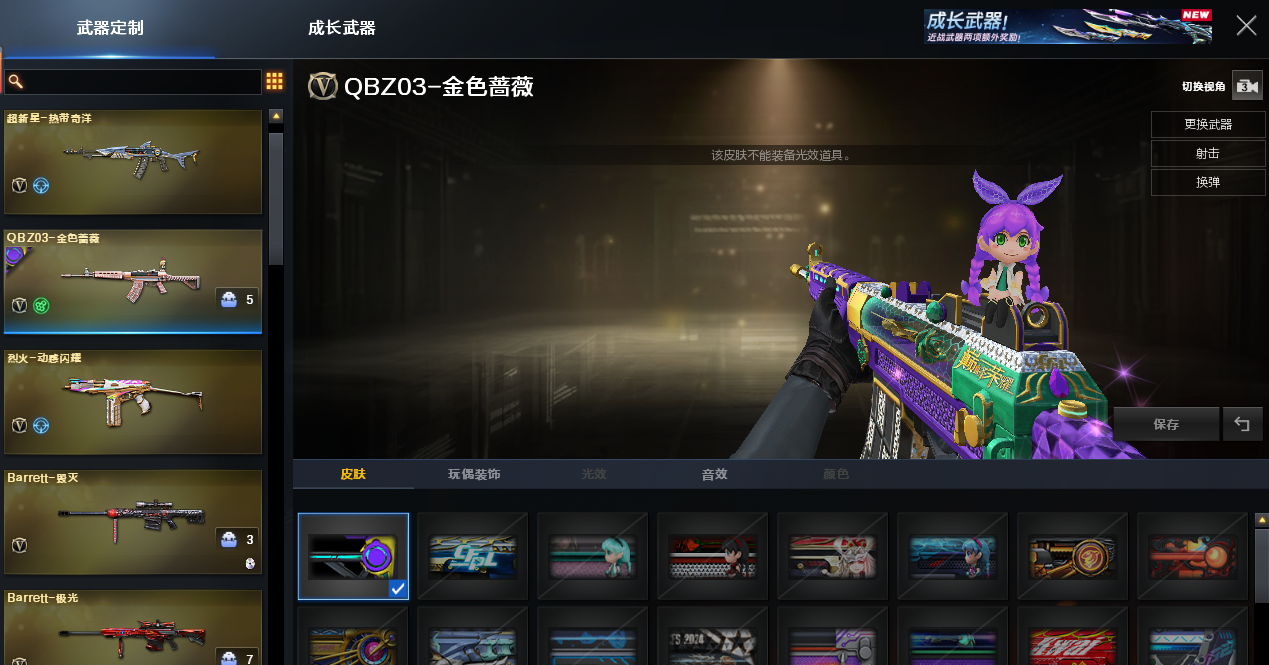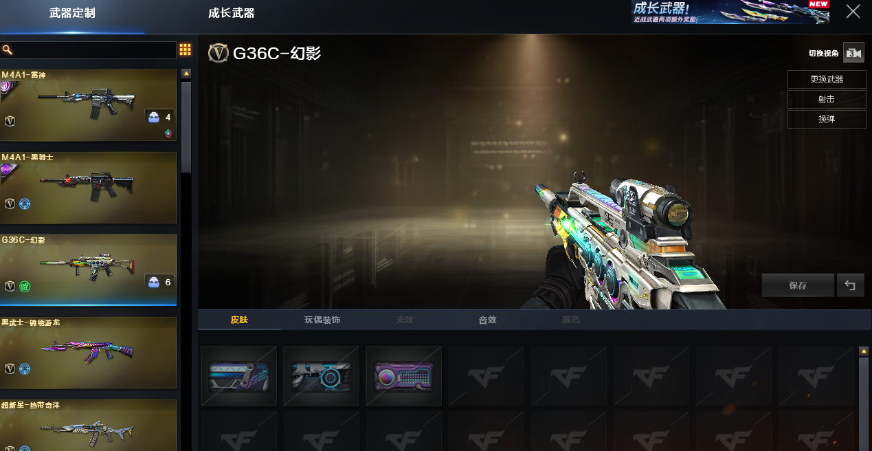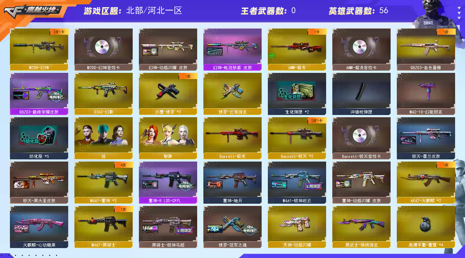 幻神电流骇客 动感闪耀皮肤+音效卡 毁灭墨兰 黑大圣皮肤+音效卡 雷神LGDCFPLS18冠军 战胜赵云皮肤+动感闪耀音效卡 QBZ巅峰荣耀皮肤 黑骑士战胜马超 幻能朋克皮肤;QBZ03-金色蔷薇,G36C-幻影,M200-幻神,