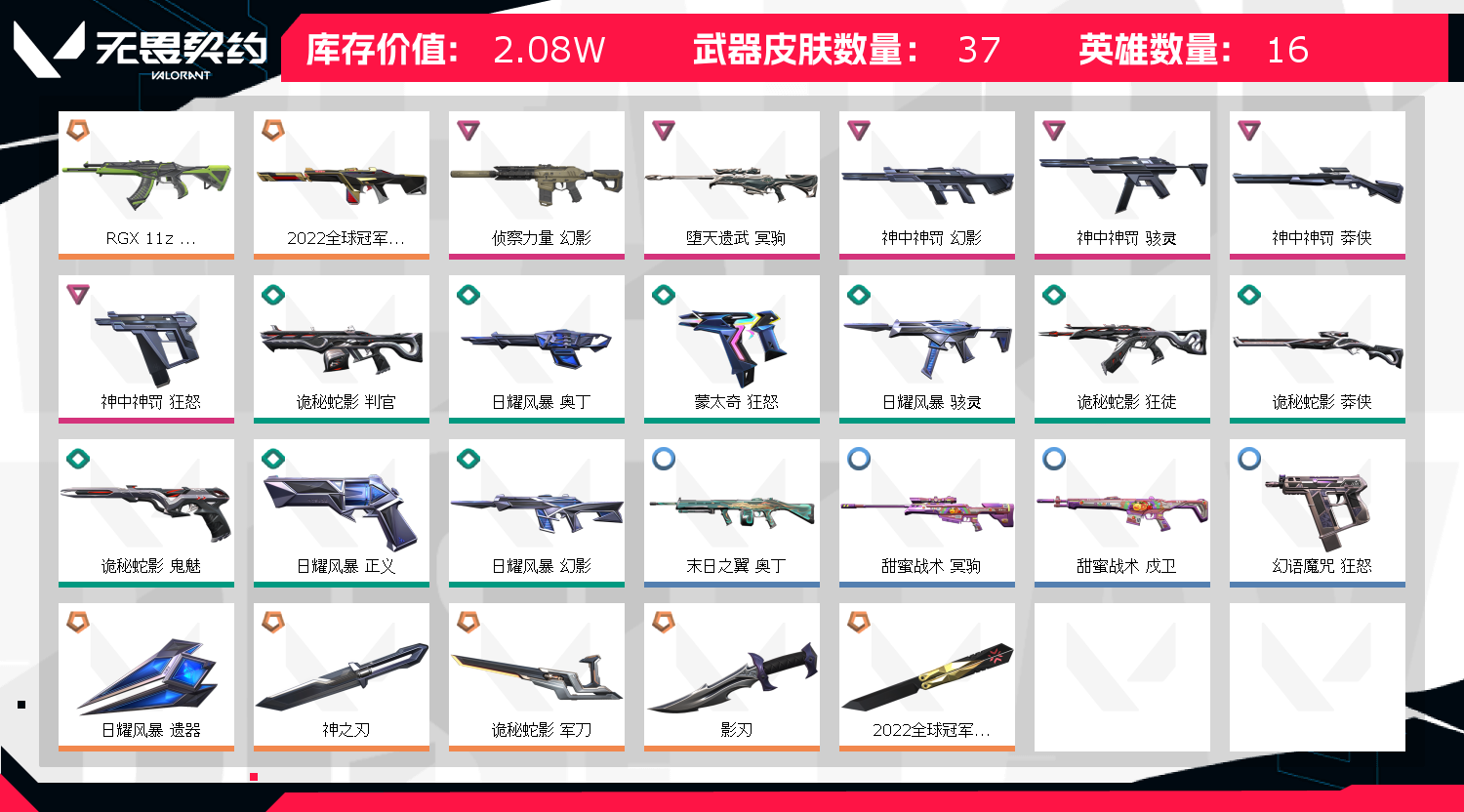 首页 > 租号大厅 > 无畏契约-wegame > wegame/wegame > 素材2w资产号⚡️22冠军套/神中神罚套⚡️显卡狂徒/侦查幻影/影刃/堕天大狙⚡️性价比拉满炸鱼必备