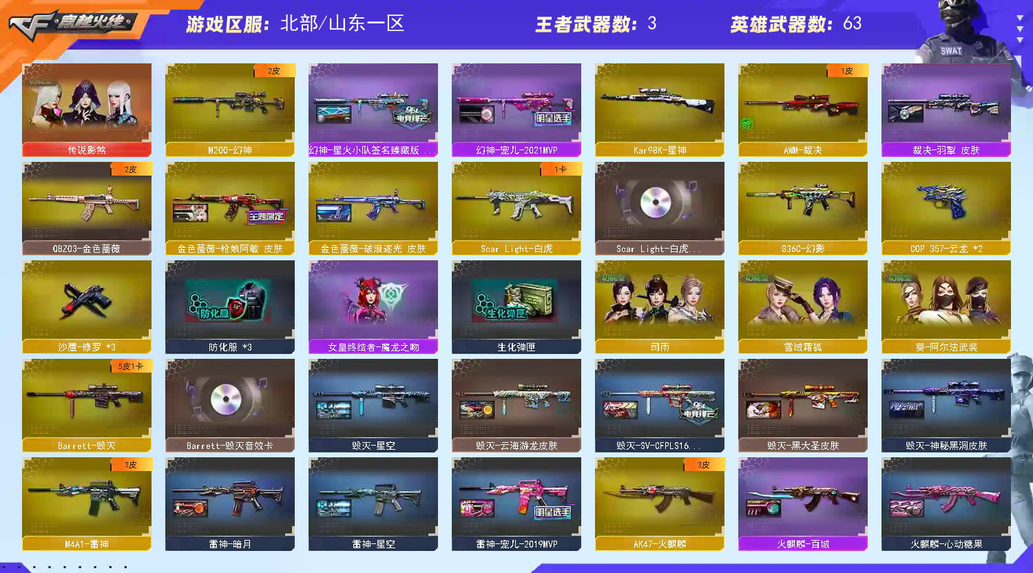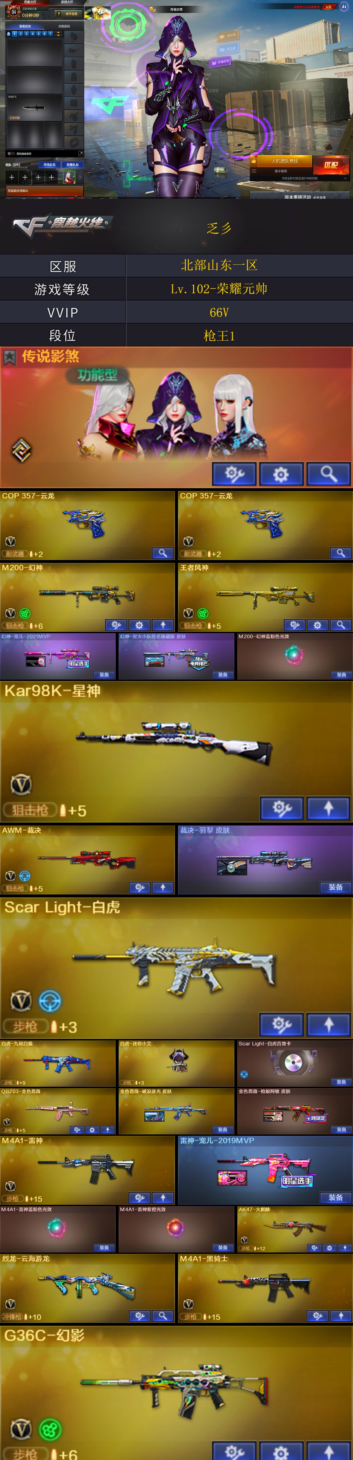 【商品标题】:北部山东一区-66V-可二次实名-【Lv.102-荣耀元帅】-【段位:枪王1】 【稀有武器】:M200-幻神/Kar98K-星神/G36C-幻影/ScarLight-白虎/天神-动感闪耀/COP357-云龙(2)/QBZ03-金色蔷薇/AK47-火麒麟/M4A1-黑龙/M4A1-雷神/M4A1-黑骑士/Barrett-毁灭/AWM-裁决/幻灵之锋(2) 【王者武器】:王者风神-觉醒版 【热门角色】:传说影煞/司雨/奇洋探员/乔伊教练/潘多拉-X/潘多拉 【热门音效卡】:Scar Light-白虎音效卡/Barrett-毁灭音效卡/M4A1-黑骑士音效卡 【热门皮肤】:幻神-宠儿-2021MVP/幻神-星火小队签名臻藏版皮肤/金色蔷薇-破浪逐光皮肤/裁决-羽掣皮肤/雷神-宠儿-2019MVP/金色蔷薇-枪娘阿敏皮肤 【其他亮点】:白虎-迷你小艾/白虎-九尾白狐/贝雷塔687-射手座 (截图展示段位不代表实际段位,如赛季更新等不可抗拒因素发生变化,其余道具看截图或咨询客服);传说影煞,QBZ03-金色蔷薇,G36C-幻影,M200-幻神,Scar Light-白虎,Kar98K-星神,