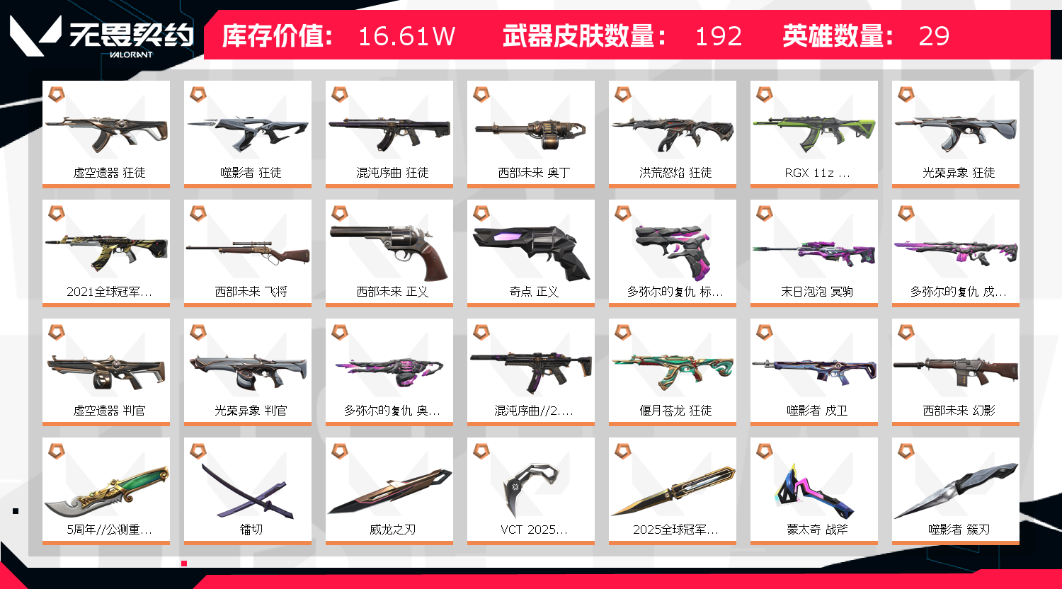 首页 > 租号大厅 > 无畏契约-wegame > wegame/wegame > 冻结协助稍等⚡️满红神话卡面➕赋能神话挂饰➕21冠军多弥尔⚡️超时空显卡洪荒20把狂徒➕侦察幻影