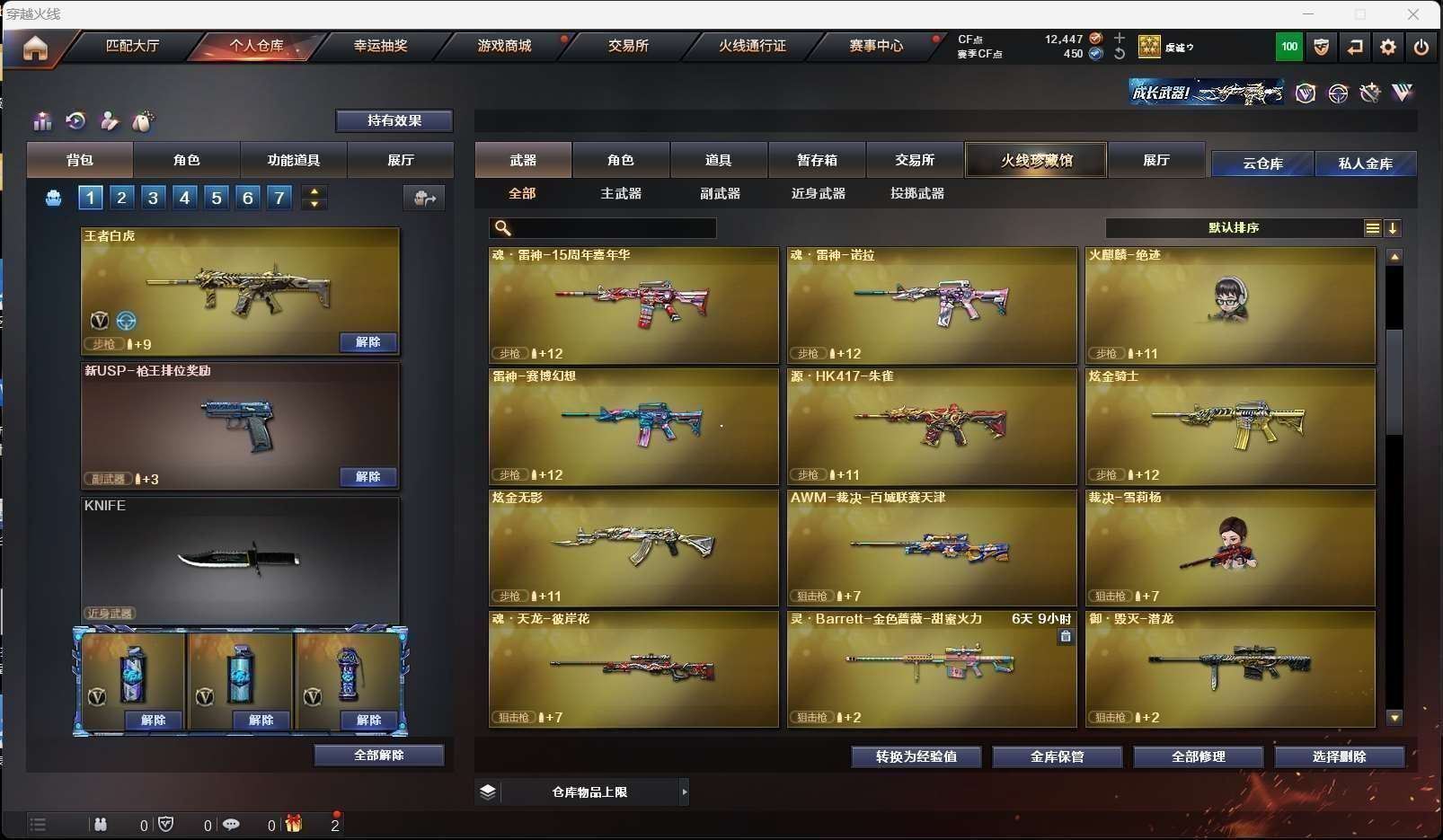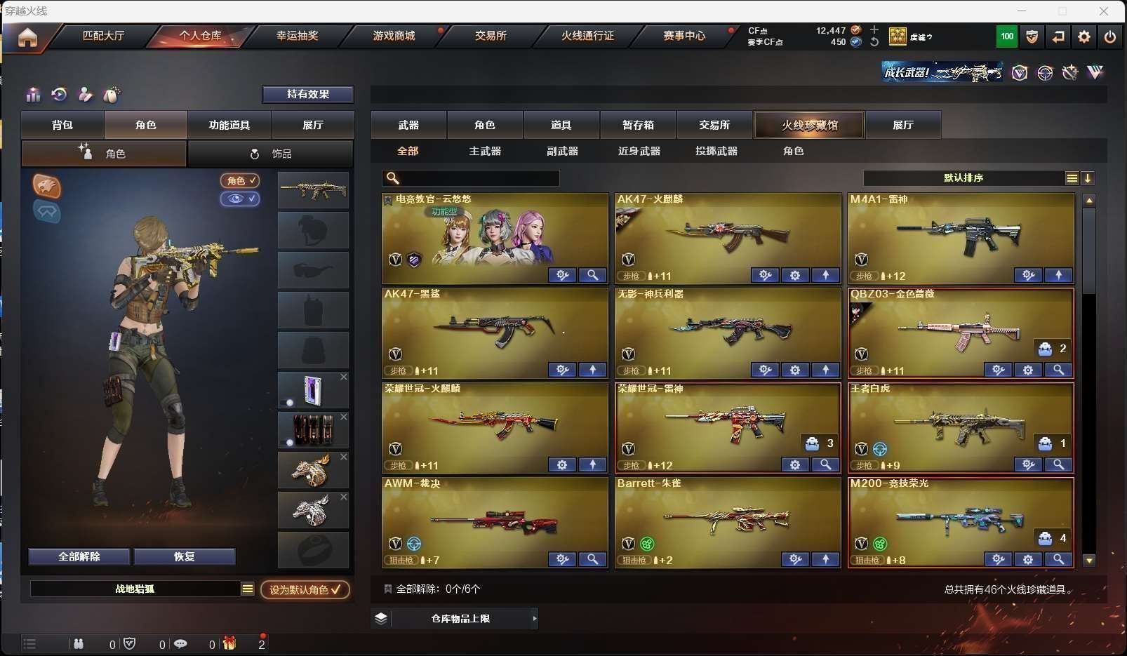 【竞技荣光套装+usp雷暴+云悠悠】【王者白虎】【qbz03金色蔷薇+qbz03ag皮肤】【荣耀世冠火麒麟 荣耀世冠雷神】【火麒麟 雷神 黑鲨神兵利器 barrett朱雀】——【usp雷暴 沙鹰天神 柯尔特竞技荣光】——【屠龙 麒麟刺 擎天竞技荣光 龙啸烈火龙威】——【竞技荣光投掷武器套装*6】——【热门武器/小人呛】——【火麒麟绝迹 炫金骑士 炫金无影 裁决雪莉杨 cop白鲨 黑桃战神 awm灵狐】——【角色】【4防云悠悠】【战地猎狐 乔伊教练】;USP-雷暴,电竞教官-云悠悠,QBZ03-金色蔷薇,