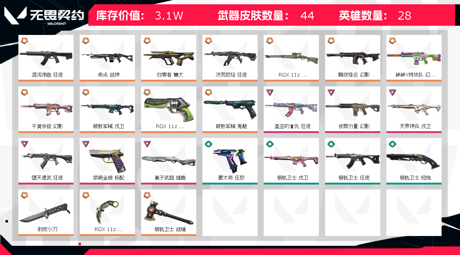 首页 > 租号大厅 > 无畏契约-wegame > wegame/wegame > 允许 英雄25 武器皮肤数量43,热门枪皮盖亚混沌侦查等,剥皮小刀显卡爪刀