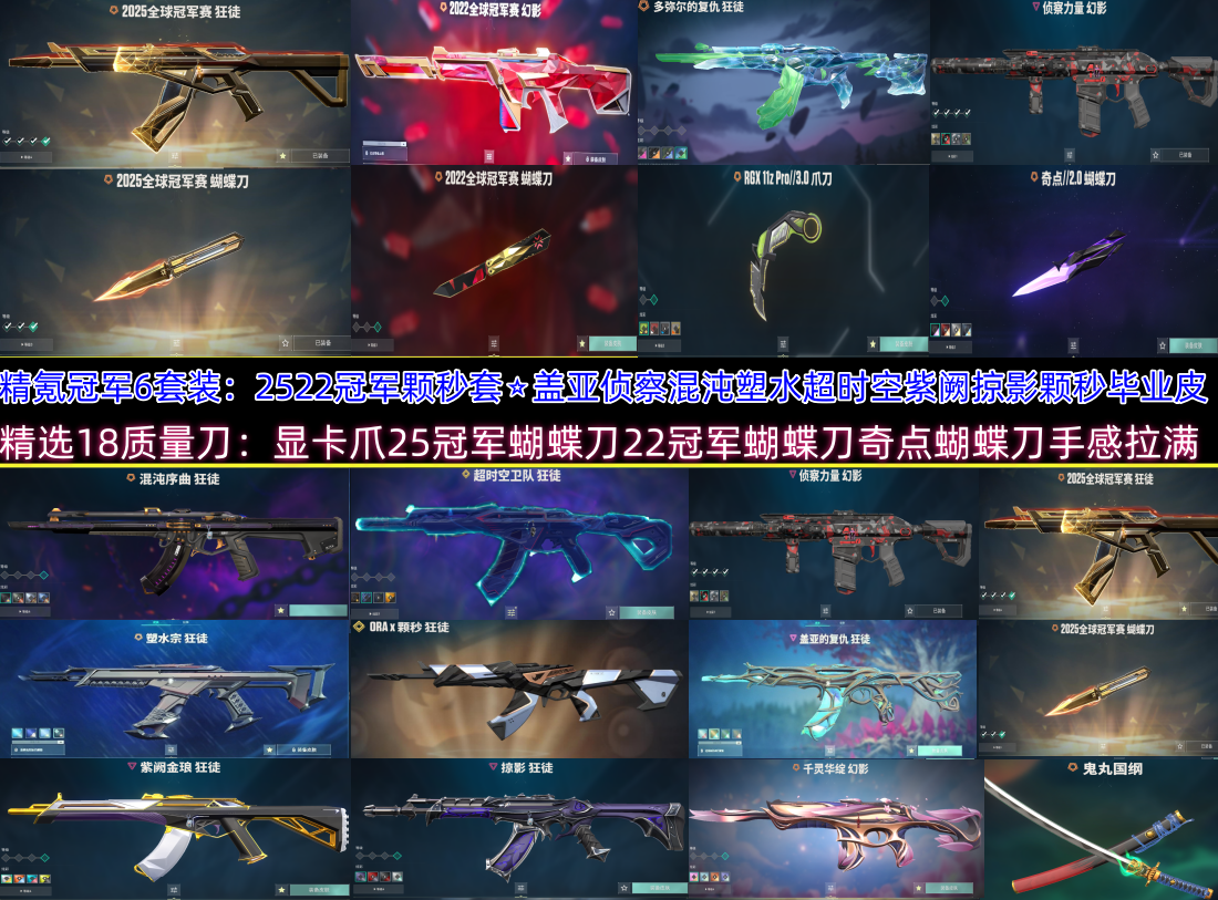 精氪冠军6套装:2522冠军颗秒套⭐盖亚侦察混沌塑水超时空紫阙掠影颗秒毕业皮 精选18质量刀:显卡爪25冠军蝴蝶刀22冠军蝴蝶刀奇点蝴蝶刀手感拉满;5周年//公测重制版 苍龙之刃,偃月苍龙 判官,盖亚的复仇 狂徒,掠影 戍卫,掠影 狂徒,侦察力量 幻影,紫阙金琅 狂徒,