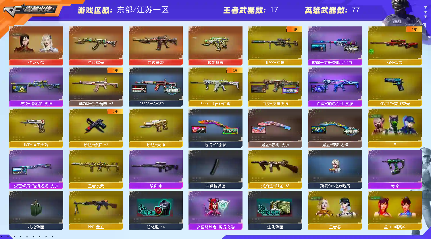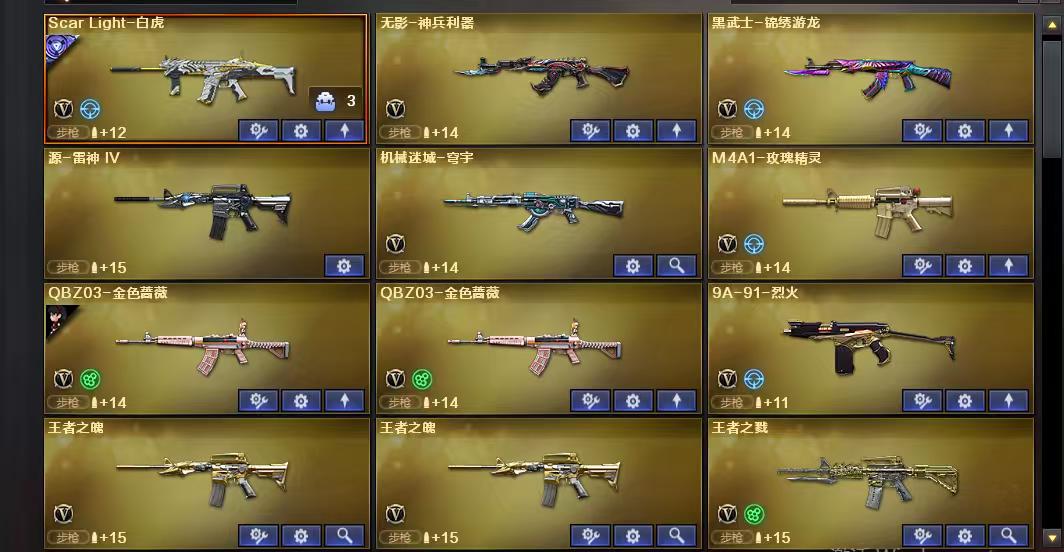 传说女帝四防;炽芒蝶刃,传说女帝,隼,RPK-盘龙,QBZ03-金色蔷薇,M200-幻神,Scar Light-白虎,