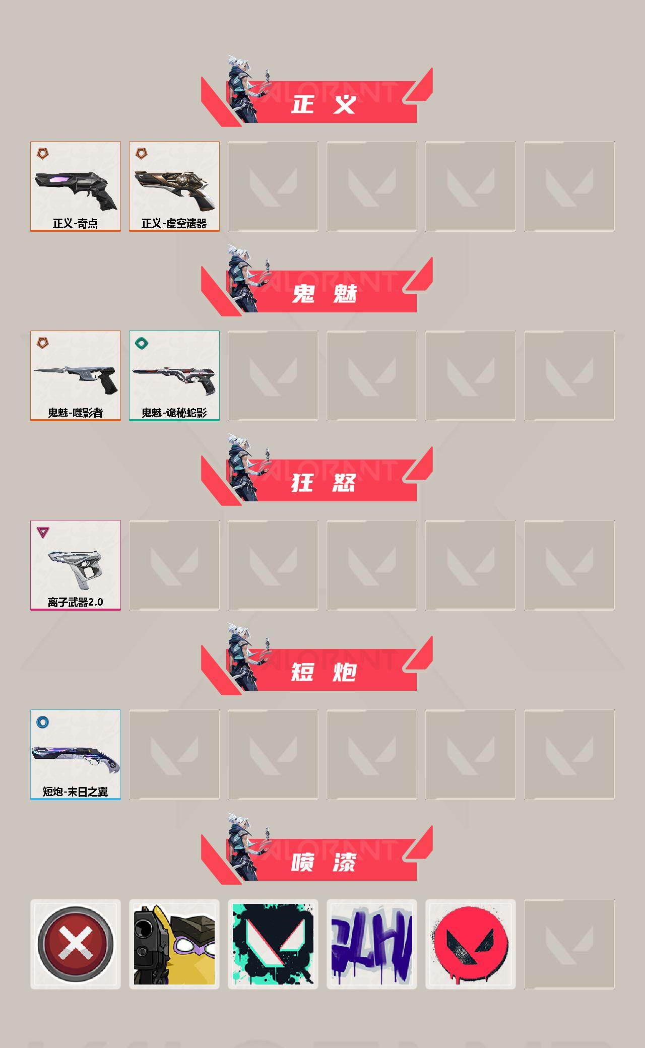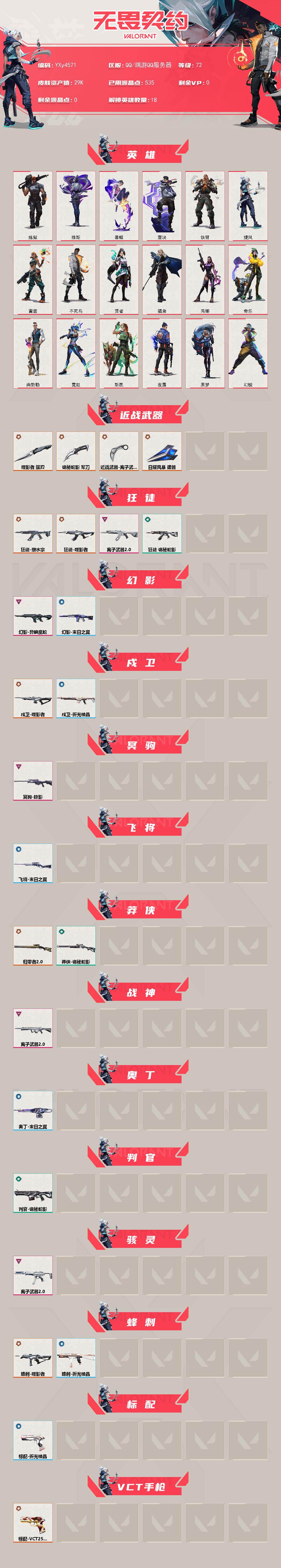 冻结三分钟内解除,短信通知重新上即可!喜欢收藏不迷路、游戏异常进小黑屋、时间不够请提前续租或者不要开局d 【套装】:噬影者套装,离子武器//2.0套装 【英雄】:幻棱,炼狱,维斯,暮蝶,壹决,铁臂,捷风,雷兹,不死鸟,贤者,猎枭,芮娜,奇乐,尚勃勒,霓虹,斯凯,夜露,黑梦 【近战武器】:近战武器-噬影者 簇刃,近战武器-离子武器//2.0 爪刀,近战武器-诡秘蛇影 军刀,近战武器-日耀风暴 遗器 【狂徒】:狂徒-塑水宗,狂徒-噬影者,狂徒-离子武器//2.0,狂徒-诡秘蛇影 【幻影】:幻影-异鳞魔蛇,幻影-末日之翼 【戍卫】:戍卫-噬影者,戍卫-折光棱晶 【冥驹】:冥驹-掠影 【飞将】:飞将-末日之翼 【莽侠】:莽侠-归零者//2.0,莽侠-诡秘蛇影 【战神】:战神-离子武器//2.0 【奥丁】:奥丁-末日之翼 【判官】:判官-诡秘蛇影 【骇灵】:骇灵-离子武器//2.0 【蜂刺】:蜂刺-噬影者,蜂刺-折光棱晶 【标配】:标配-折光棱晶 【VCT手枪】:标配-VCT25 x EDG 【正义】:正义-奇点,正义-虚空遗器 【鬼魅】:鬼魅-噬影者,鬼魅-诡秘蛇影 【狂怒】:狂怒-离子武器//2.0 【短炮】:短炮-末日之翼 【卡面】:树懒大作战 卡面,脚踝终结者 卡面 ,无畏契约GO!一卷:芮娜 卡面,无畏契约GO!一卷:零 卡面,无垠星环 卡面,《双城之战》金克丝 卡面,代号红色 卡面,新兵报到 卡面,V契约 卡面,无畏契约 卡面 【喷漆】:买装还是存钱 喷漆,放下武器 喷漆,胜利属于无畏契约 喷漆,GLHF 喷漆,无畏契约 喷漆 【挂饰】:动力机箱 挂饰,VCT x EDG 挂饰,天外飞客 挂饰,无畏契约 纪念币 挂饰;噬影者 狂徒,异鳞魔蛇 幻影,塑水宗 狂徒,离子武器//2.0 狂徒,奇点 正义,