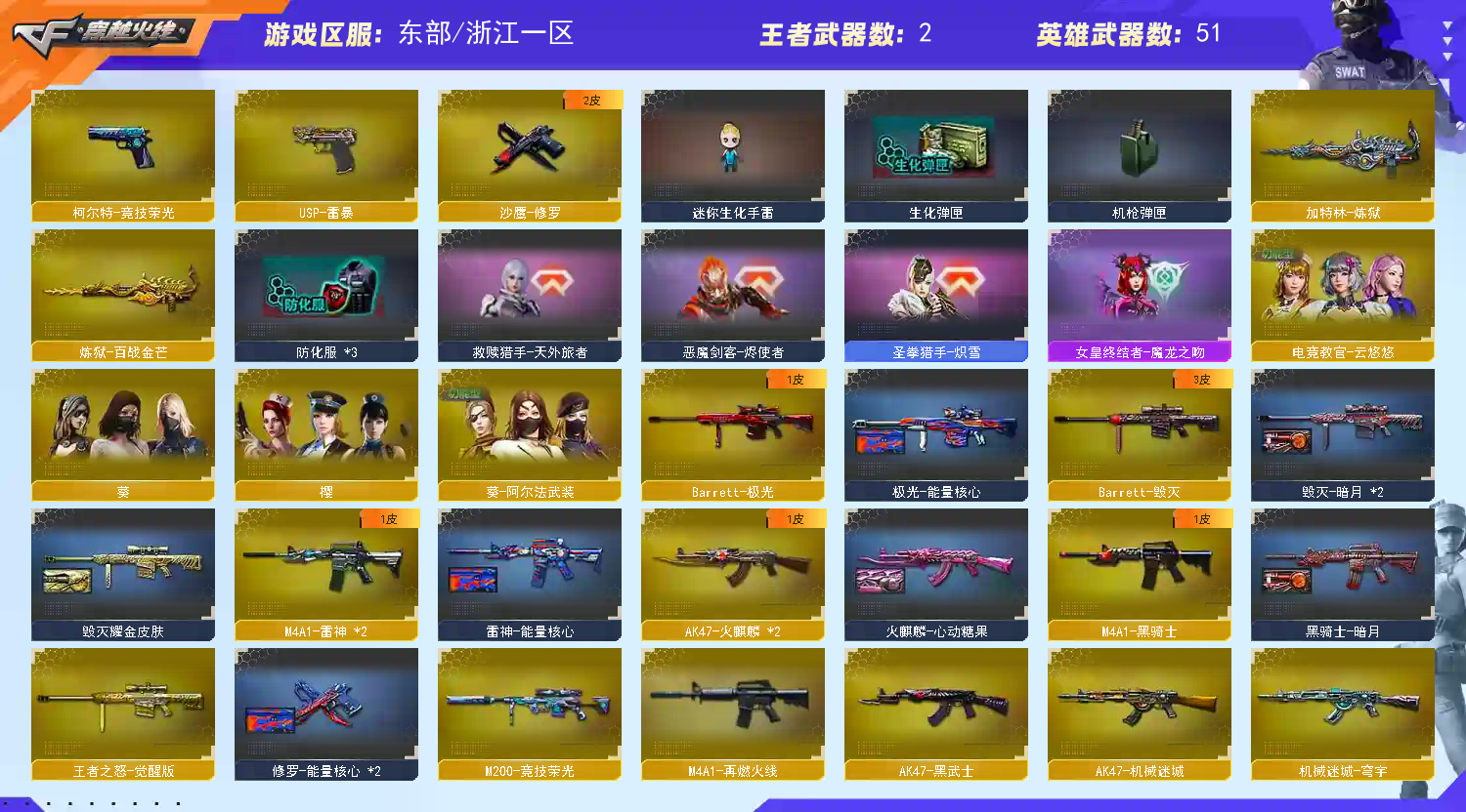 M200竞技荣光全套|USP雷暴|王者之怒|42V云悠悠竞技四防|DJ喵玩偶|雷神火麒麟|爆破全装号 东部战区合区大区(安徽一区、福建一区、上海一区、上海二区、浙江一区、浙江二区、江苏一区、江苏二区、教育大区、移动专区)登录的时候选择浙江一区 【编号】:ZJ279 【角 色】:电竞教官云悠悠、葵、樱、风暴女、救世主-X、蜀雪、铁骑荣耀、影舞者-X、8周年戒指、双蛇戒指、双龙戒指 【主 武】:M200竞技荣光、王者之怒、火麒麟X2、雷神、无影神兵利器、黑骑士、黑武士、机械迷城、猩红传说X7、战士、战神、天龙、毁灭、激光、暗月传说、炼狱、毁灭征服者、冰龙粉碎者、机甲撕裂者、激光毁灭者、圣炎切割者、深渊巨龙咆哮、神圣爆裂者、试炼破坏者、苍雷、金魔等各种活动武器 【副 武】:USP雷暴、柯尔特竞技荣光、修罗、天神CF网剧冠军、阐释者、COP小青龙、胜利之火、大黄蜂 【近 身】:屠龙、龙啸、麒麟刺、擎天竞技荣光X2、龙啸烈火龙威、金刚伞、丛林匕首-枪王排位、猫猫手套、激光短刃、冰火魔拳 【投 掷】:竞技荣光套装X2、迷你生化手雷、深渊终结者手雷、胜利之光、高爆手雷-雷蛇、高爆手雷-SS 【道 具】:DJ喵玩偶、15周年玩偶、关羽玩偶、14个背包、AC(防弹衣+防弹头盔)、C4工具钳、手雷包、挑战弹夹、夺命之镰、变异宝贝、灵魂忍者、生化弹夹、防化服、机枪弹夹、冲锋枪弹夹、散弹枪弹夹、手枪弹夹、狙击枪弹夹、步枪弹夹、减少停顿包;USP-雷暴,电竞教官-云悠悠,