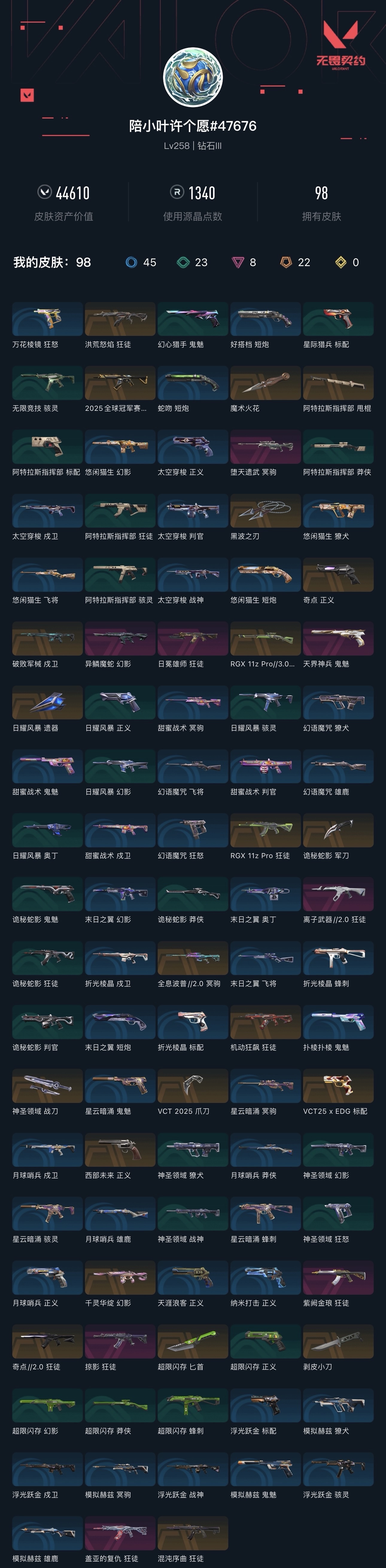全英雄能打排位热门毕业皮基本都有 不要挂机🚫 不要骂人🚫 R点可以留着会买新套装升级用;黑波之刃,剥皮小刀,VCT 2025 爪刀,盖亚的复仇 狂徒,洪荒怒焰 狂徒,掠影 狂徒,异鳞魔蛇 幻影,