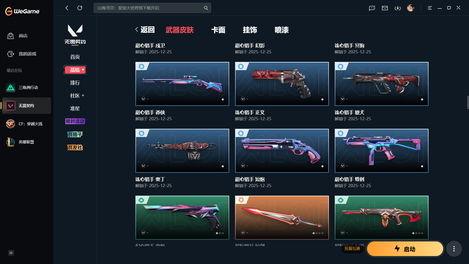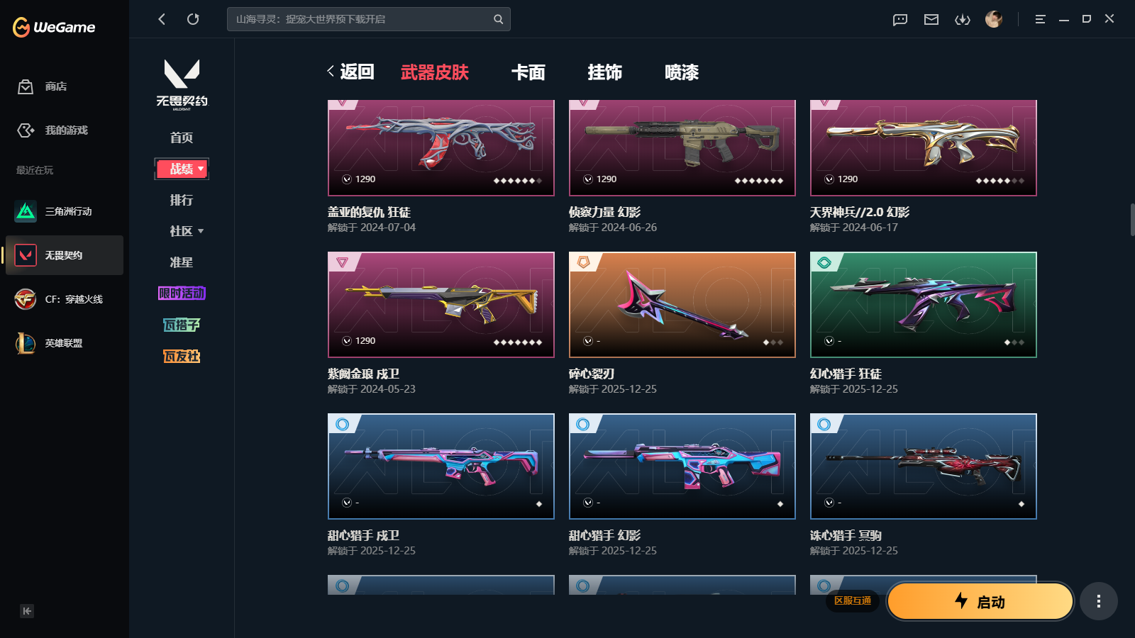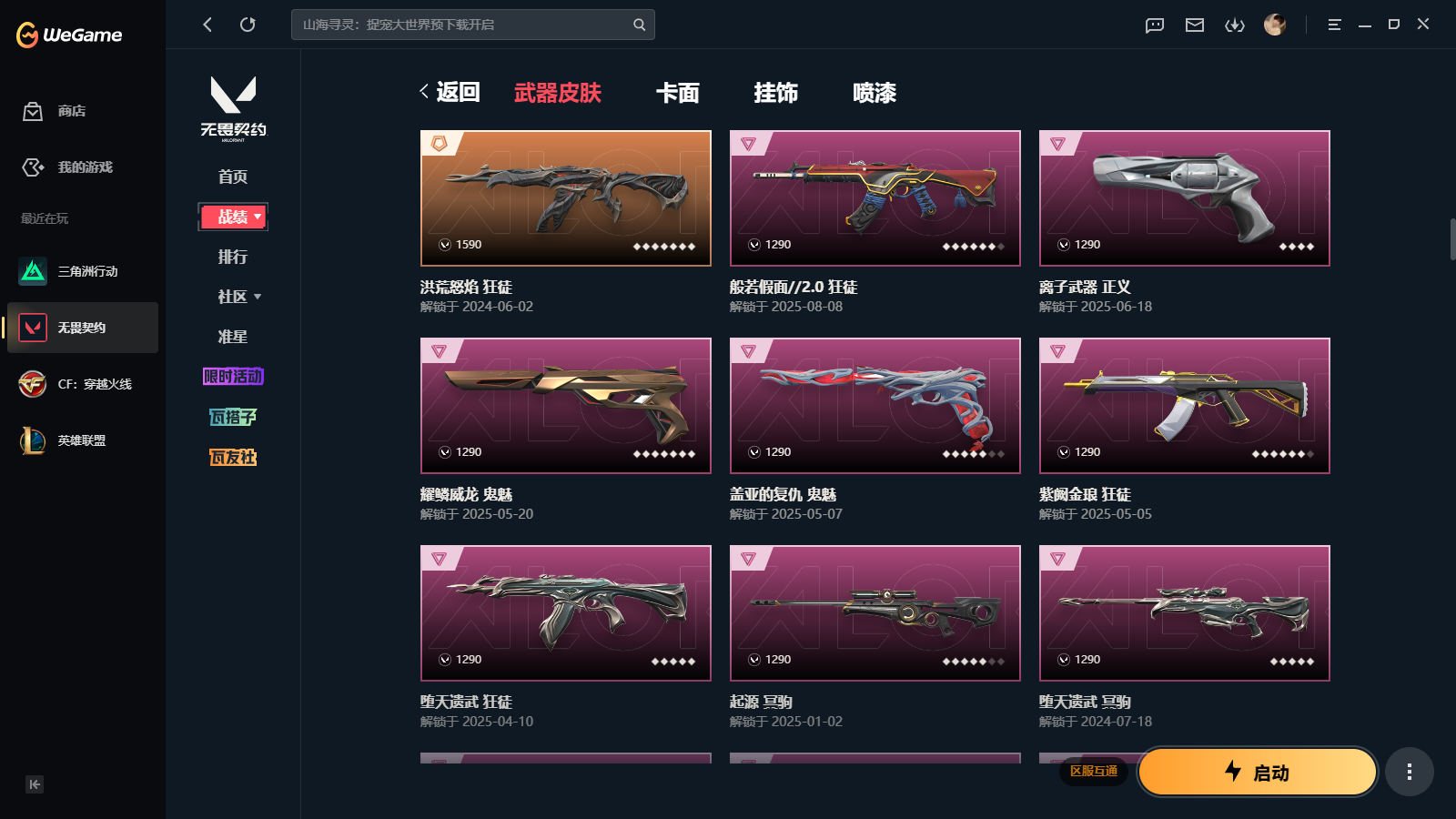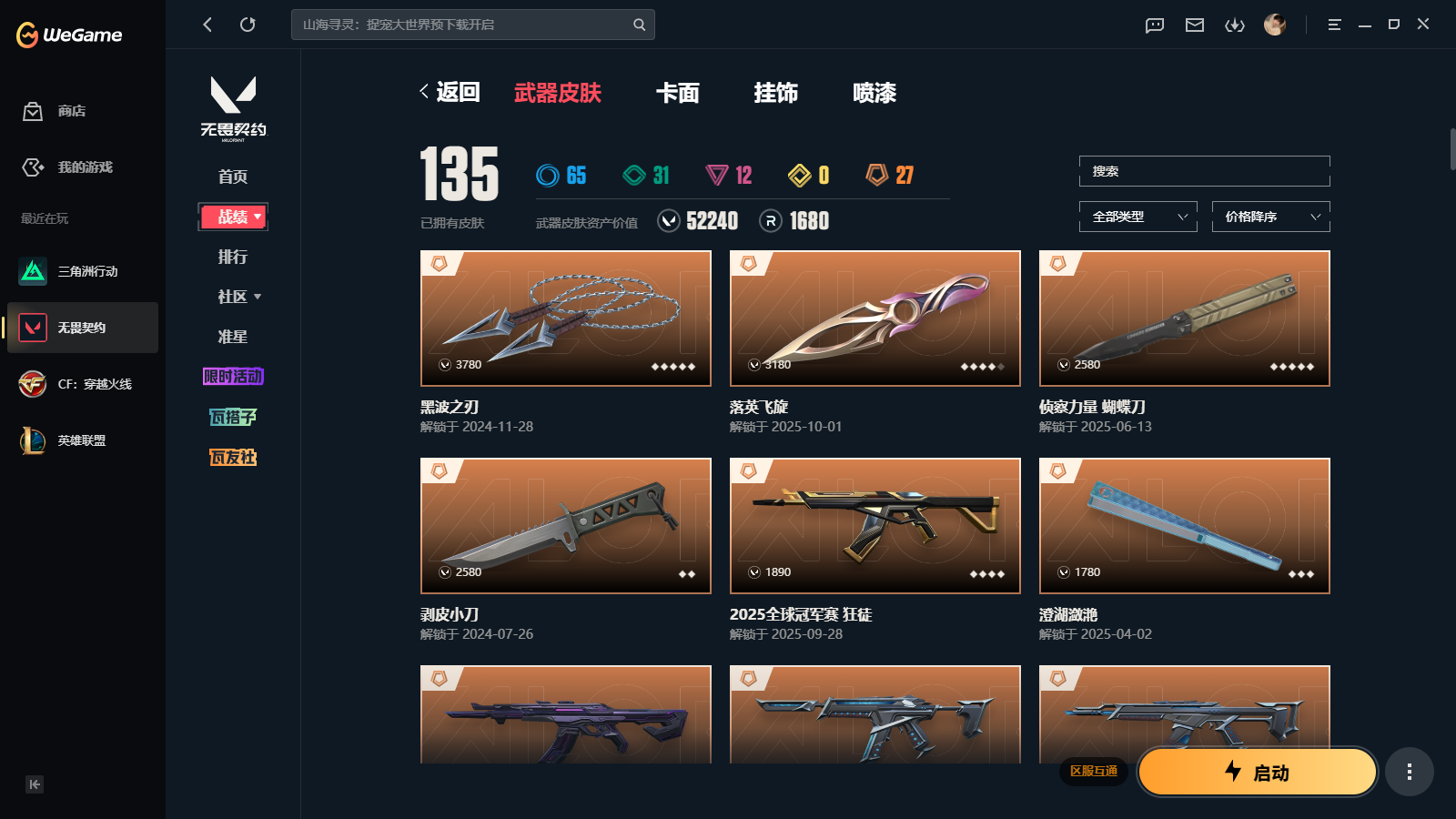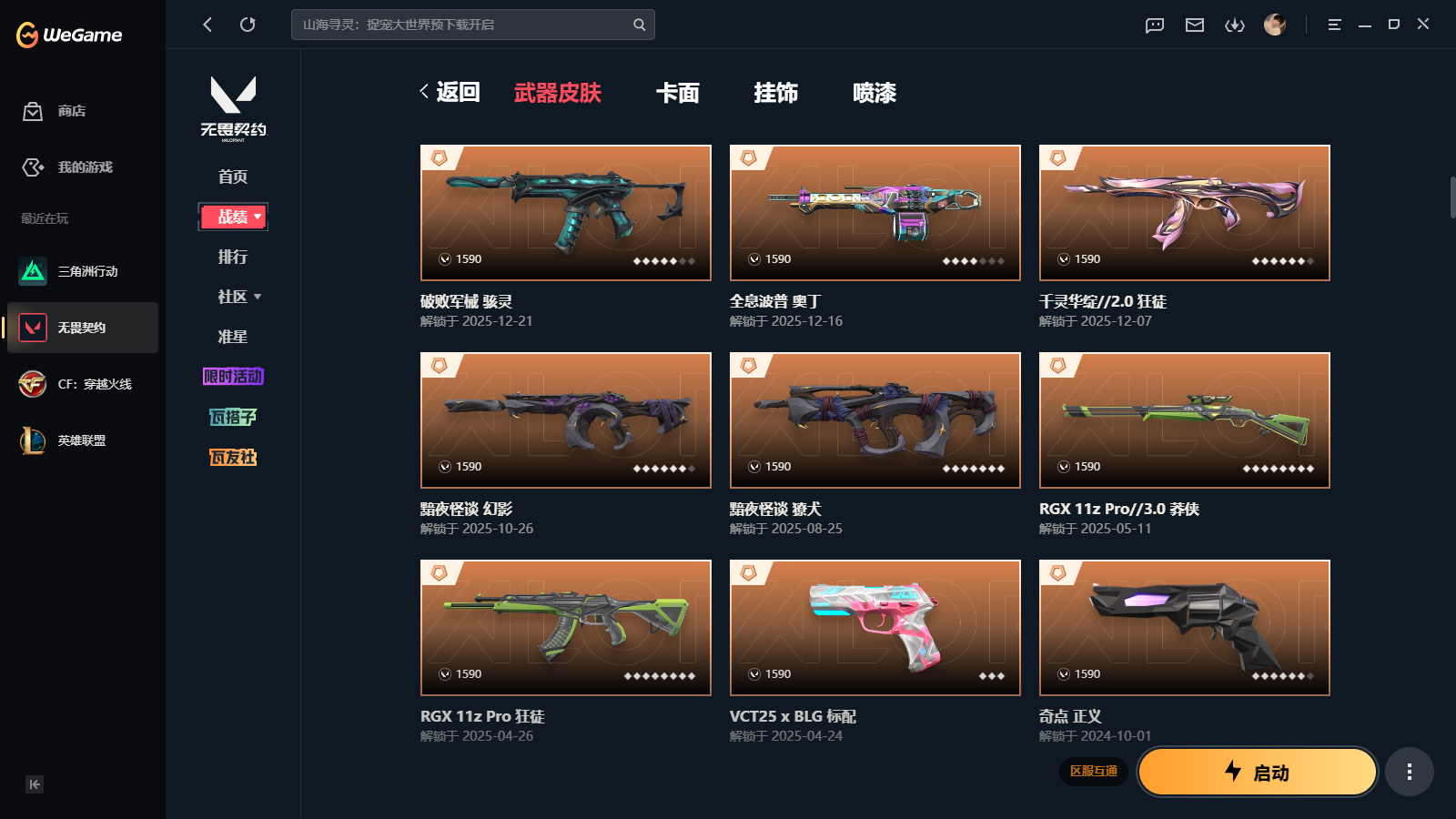 wegame无畏契约★135皮肤,黑波之刃 落英飞旋 侦查力量蝴蝶刀 2025冠军狂徒 塑水宗狂徒 千灵华绽2.0 黯夜怪谈 RGX3.0 莽侠 诛心猎手套装