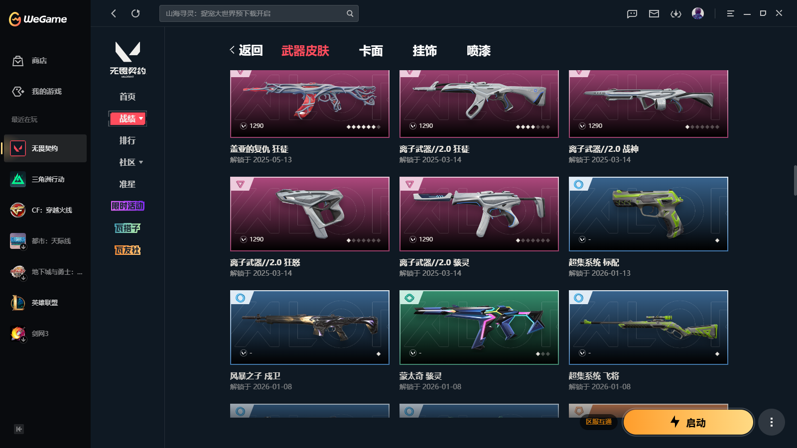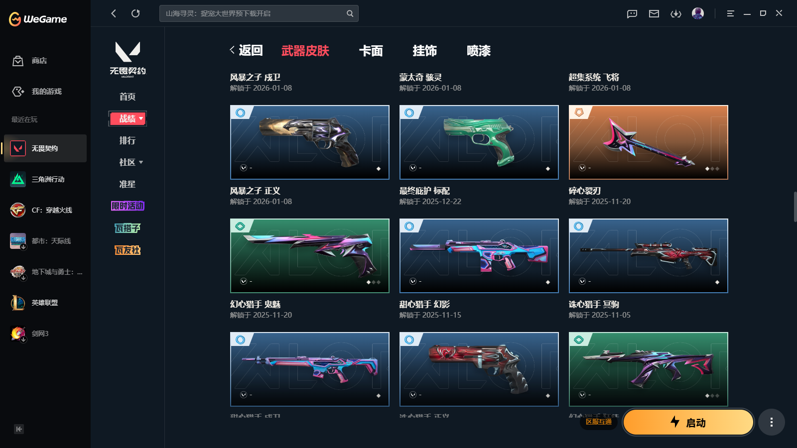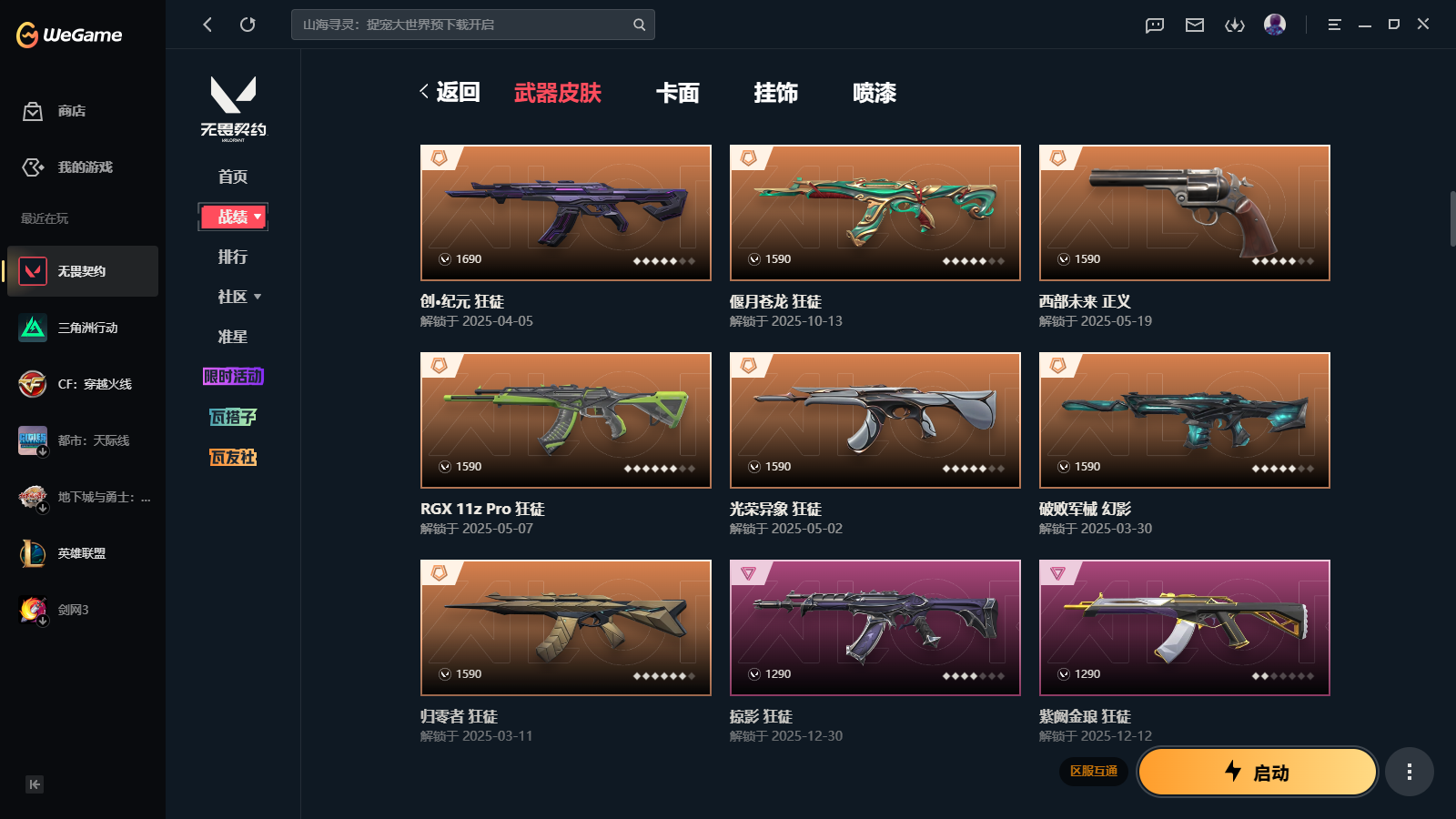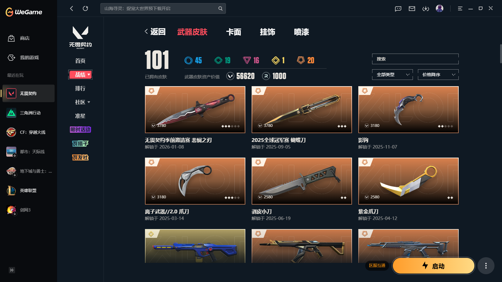 wegame无畏契约★101皮肤,无畏契约季前邀请赛悲悯之刃 2025冠军蝴蝶刀 2025冠军狂徒 影钩 离子武器2.0爪刀 源能者娱乐系统幻影 偃月苍龙狂徒