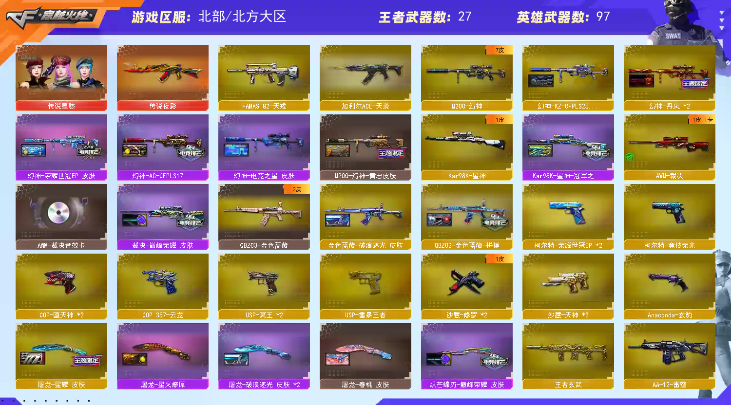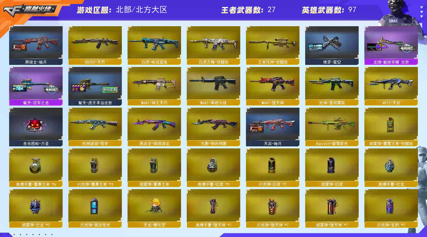 【商品标题】:北部北方大区-103V-可二次实名-【Lv.100.1-大元帅】-【段位:新锐1】杜绝鼠标宏!开挂!封号追责到底!!!! 【稀有武器】:传说夜影/M200-幻神/Kar98K-星神/QBZ03-天罚/M4A1-神工天巧/M4A1-堕天神/COP-堕天神(2)/柯尔特-竞技荣光/COP357-云龙/修罗-古蛇迷踪/QBZ03-金色蔷薇/AK47-火麒麟/M4A1-黑龙/M4A1-雷神/M4A1-黑骑士/白虎-电玩蓝兔/Barrett-毁灭(2)/AWM-裁决/AA-12-雷霆/炽芒蝶刃/麒麟刺-堕天神/龙啸-堕天神/擎天-竞技荣光/唐刀-神工天巧/云龙扇 【王者武器】:王者之魄-觉醒版/白虎之魄-觉醒版/王者风神-觉醒版 【热门角色】:迷迭香/魅影/奇洋探员/乔伊教练/蛇隐宗/王者空/新海豹突击队/潘多拉-X/兔囡囡/潘多拉 【热门音效卡】:AWM-裁决音效卡/QBZ03-天罚音效卡/M4A1-雷神音效卡 【热门皮肤】:幻神-AG-CFPLS17冠军/幻神-丹凤(2)/白虎-白鲨-CFPLS23冠军/裁决-巅峰荣耀皮肤/龙啸-巅峰荣耀皮肤/金色蔷薇-破浪逐光皮肤/屠龙-星火燎原/Kar98K-星神-冠军之星皮肤/雷神-R.LGD-CFPLS18冠军/擎天-冠军之击/屠龙-破浪逐光皮肤(2)/擎天-虎牙平台皮肤/屠龙-春桃皮肤 【其他亮点】:炼狱-迷你小钢/USP-雷暴-深海特遣队/柯尔特-赛博朋克/M14EBR-冠军金牛 (截图展示段位不代表实际段位,如赛季更新等不可抗拒因素发生变化,其余道具看截图或咨询客服);USP-雷暴王者,炽芒蝶刃,传说星骇,QBZ03-金色蔷薇,M200-幻神,加利尔ACE-天袭,Kar98K-星神,