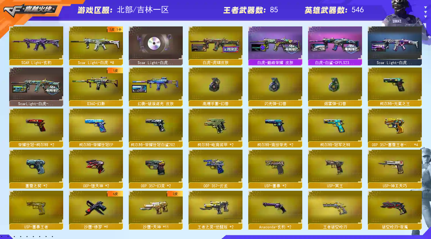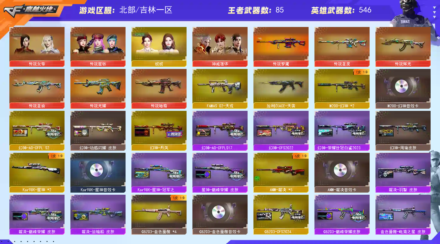 如果发现排位立即冻结!北部天花板✅8传说✅双幻神8件套✅双星神4件套✅加利尔✅6烈蝴蝶6盘泡泡象✅双炽芒3皮✅冠军之特✅八面九霄法玛斯幻影金蚀银翼 稀有武器:传说光耀、传说暗裔、传说辉光、传说圣谕、传说圣灵、传说梦魇、加利尔ACE天袭、M200幻神X2、98K星神X2、烈龙X9+蝴蝶、盘龙X9+7炼狱、炼狱百战金芒、炼狱惊涛骇浪、八面凌龙、九霄圣角、FAMAS G2天戎、G36C幻影、VSK金蚀、SCarlight玄豹、M200竞技荣光、雷暴、幻灵、堕天神、夜魔X2、神工天巧、Barrett电竞装甲、M14玄武、白虎X8、M4青龙X2、HK朱雀X3、QBZ金色蔷薇X4、QBZ天罚X3、QBZ银翼、千变、火麒麟X8、麒麟、黑龙X6、雷神X8、黑骑士X10、无影X5、死神X5、黑武士X6、天启X5、超新星X2、武圣X3、机械迷城X2、黑鲨X3、龙血X3、M4雷霆X2、金色蔷薇古蛇迷踪、死神雪域霜狐、机械迷城穹宇、朱雀-电竞之星、玫瑰精灵X4、猎神X2、烈火X3、黑武士-CF网剧冠军武器套装、黑骑士海王X3、荣耀世冠-火麒麟、荣耀世冠-雷神X2、白虎电玩蓝兔、天龙X3、毁灭X9、极光X3、裁决X5、Barrett雷霆、Barrett朱雀、Barrett金色蔷薇X2、暗月传说X6、A12雷霆、火狱乱世-超越MAX、地狱征服者-超越MAX、毒蜂、异变清道夫、黑龙吞噬者 修罗X9、天神X11、GLOCK武圣X2、COP雷霆X2、USP雷暴X2、COP堕天神X2、破空枪刃夜魔、柯尔特电竞装甲X2、COP幻灵X2、柯尔特竞技荣光X2、USP神工天巧、USP冥王、柯尔特荣耀世冠EP、柯尔特冠军之特、荣耀世冠柯尔特X2、柯尔特荣耀世冠白鲨2023、柯尔特无冕之王、修罗古蛇迷踪、Anaconda玄豹X2、沙鹰幻兽、天神-CF网剧冠军武器套装、USP竞魂、阐释者 炽芒蝶刃X2、荣耀世冠龙啸、屠龙X9、龙啸X8、擎天X5、麒麟刺X5、尼泊尔雷霆、斩神刀雷暴、麒麟刺堕天神、龙啸堕天神X4、马来剑夜魔、尼泊尔电竞装甲X2、幻灵之锋X、擎天竞技荣光X3、唐刀神工天巧、丛林匕首玄豹、麒麟刺百战金芒、屠龙电竞之星、女皇利刃幻兽、擎天-CF网剧冠军武器套装、龙啸烈火龙威X3 稀有角色:神威莲华、传说女帝(四防:减少闪光效果+免疫队友炸弹伤害+减少掉落伤害+副武器自动装弹)、传说星骇(四防:觉醒肾上腺素、防爆盾、紧急恢复、同归于尽)、妮妮、沙漠玫瑰(四防:生化背包变更+捕食者之眼+生化觉醒狂暴化+佣兵觉醒无需换弹)、电竞教官云悠悠(四防)、炫、毒蝰术士(四防)、荒漠琉璃、机械姬、荆棘(四防)、葵、零、凌霄(四防)、迷迭香、春、司雨、玄豹、迅捷虹猫(四防)、鹰(四防)、影豹(四防)、炫、魅影、王者救世主、王者葵貂蝉(四防)、王者魅影(四防)、王者惊若翩鸿(四防)、不败狙神、零纪元、战地猎狐、狐影、幻面灵狐、葵阿尔法武装、蛇影宗、修道士、雪域霜狐 音效卡:幻神音效卡、星神音效卡、天罚音效卡、玄武音效卡、炼狱音效卡、白虎音效卡、QBZ金色蔷薇音效卡、裁决音效卡、黑龙音效卡、极光音效卡、黑骑士音效卡、雷神音效卡、火麒麟音效卡、毁灭音效卡、死神雪域霜狐音效卡、昌龙怀旧音效卡、炼狱百战金芒庆典舞曲音效卡、碧霄极光音效卡、修罗盛典舞曲音效卡、屠龙电竞之星竞星悦动音效卡、朱雀电竞之星竞星悦动音效卡、竞魂超新星音效卡 稀有皮肤:幻神丹凤皮肤/周瑜皮肤/CFS2022皮肤/荣耀世冠白鲨2023皮肤/AG-CFPLS24冠军皮肤/动感闪耀皮肤/AG-CFPLS17冠军皮肤、星神冠军之星皮肤/巅峰荣耀皮肤、炽芒蝶刃破浪逐光皮肤/冠军炽芒皮肤/荣耀世冠白鲨2023皮肤、金蚀课桌奇兵皮肤、幻影破浪逐光皮肤、QBZ金色蔷薇-CFS2024皮肤/电竞之星皮肤、白虎虎啸皮肤/暗星皮肤/电玩粉兔皮肤/巅峰荣耀皮肤/白鲨CPLS23冠军皮肤/冠军之虎皮肤、裁决异化之源皮肤/羽掣皮肤/巅峰荣耀皮肤/运输船皮肤/胜者为王皮肤、黑骑士白马银枪皮肤/耀金皮肤/摸金教尉皮肤/CFS2021皮肤/暗月皮肤/冠军之势皮肤/AG-S4冠军典藏皮肤、毁灭魔灵皮肤/耀金皮肤/星空皮肤/冠军之怒皮肤/黑大圣皮肤/CFS2020皮肤/青帝皮肤/荣耀诗奴皮肤/神秘黑洞皮肤/CFS2018皮肤/风暴皮肤/暗月皮肤/SV-CFPLS16冠军皮肤/英雄计划皮肤、龙啸纸灯龙皮肤/冠军之啸皮肤/巅峰荣耀皮肤/青青莓果皮肤、黑龙冠军之武皮肤/暗月皮肤/能量核心皮肤/361皮肤、火麒麟百城皮肤/AG战队皮肤/雷神皮肤/CFstar皮肤/华夏之心皮肤/平天大圣皮肤/盘古皮肤/CFS2018皮肤/传奇EVEN皮肤/巅峰荣耀皮肤/荣耀世冠AG皮肤、雷神荣耀世冠AG皮肤/暗月皮肤/星空皮肤/能量核心皮肤/耀金皮肤/白鲨CFPLS14冠军皮肤/宠儿2019MVP皮肤/荣耀之魄皮肤/虎将皮肤/神秘按键皮肤、炼狱迷彩皮肤/星空皮肤、擎天冠军之击皮肤/秘银皮肤、死神机甲核心皮肤/秘银皮肤、屠龙惊鸿皮肤/巅峰荣耀皮肤/春桃皮肤/荣耀之锋皮肤/荣耀世冠AG皮肤、修罗百战金芒皮肤/能量核心皮肤/星空皮肤/耀金皮肤/冠军之魂皮肤/CFstar皮肤/CFS2018皮肤、极光高能霹雳皮肤/能量核心皮肤、烈龙星空皮肤、天龙秘银皮肤/能量核心皮肤/CFstar皮肤/传奇70KG皮肤、天启暗月皮肤、无影耀金皮肤/暗月皮肤/能量核心皮肤、千变孔明皮肤、黑武士典韦皮肤 王者炫金武器:王者之心、王者之影、王者之翼、王者之武、王者之魄、王者之势、王者之戮、王者之幻、王者之圣、超新星悦享、王者冰魄、王者之城、王者火魄、王者之烈、王者白虎、M4雷霆王者、COP雷霆王者X4、、雷霆王者之锋、QBZ王者蔷薇、王者风势、王者龙血、AK