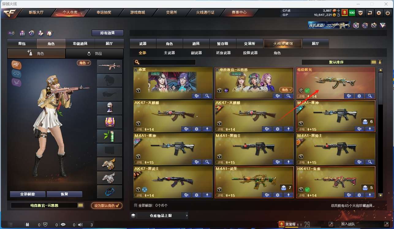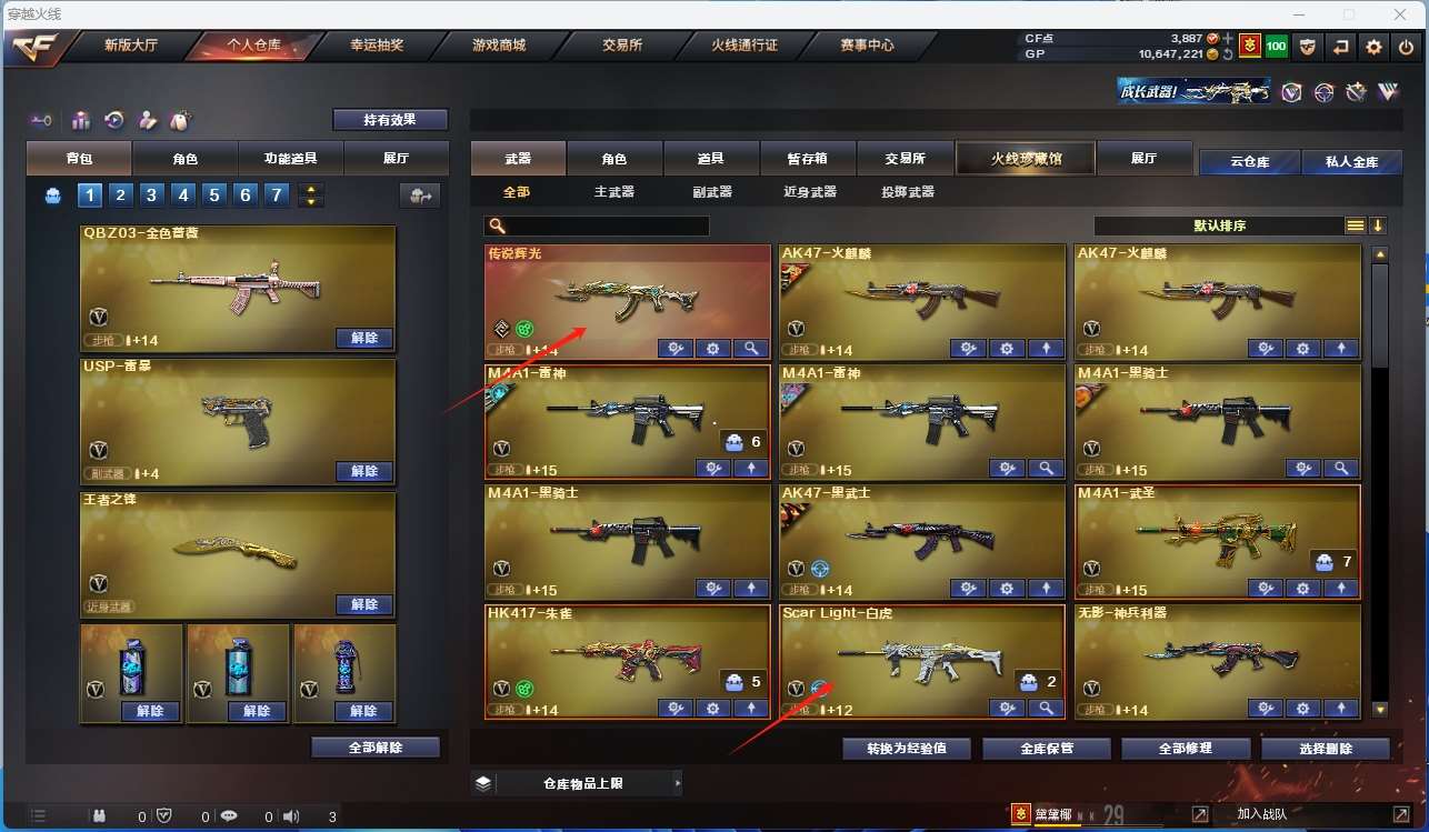 【传说辉光】【m200幻神+黄忠皮肤】【竞技荣光套装+usp雷暴】【scar白虎】【qbz03金色蔷薇+金色蔷薇音效卡】 【觉醒:王者之怒】 【hk417朱雀 火麒麟*2 雷神*2 黑骑士*2 黑武士 武圣 无影神兵利器 黑武士锦绣游龙 毁灭 极光】【高爆手雷雷霆 闪光丹雷霆 闪光丹雷暴 手雷云海游龙 盐雾蛋竞技荣光】【小人呛:cop旗袍】 【usp雷暴 修罗 天神 glock18武圣】 【屠龙 麒麟刺 王者之锋】【竞技荣光手雷套】 【角色 :四防电竞教官云悠悠 王者瞳闭月羞花 雨棠 新海豹突击队】【超级背包 虎牙炫彩背包 炫彩背包 粉红背包;USP-雷暴,电竞教官-云悠悠,妮妮,QBZ03-金色蔷薇,M200-幻神,Scar Light-白虎,