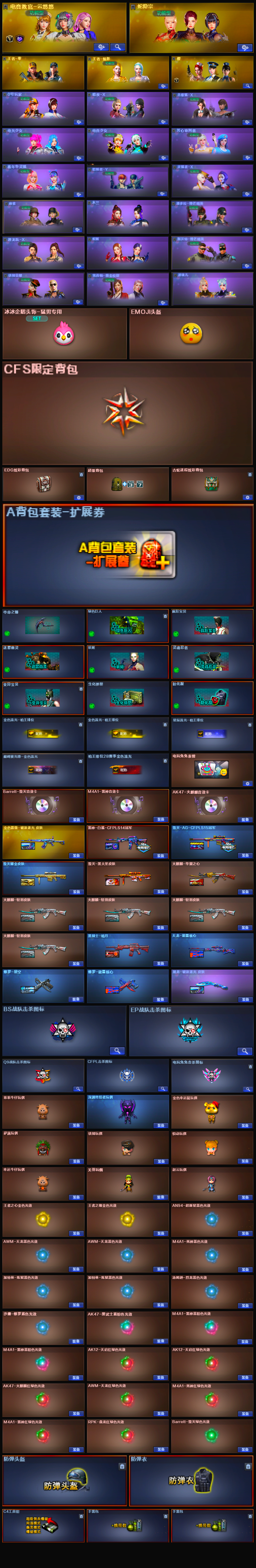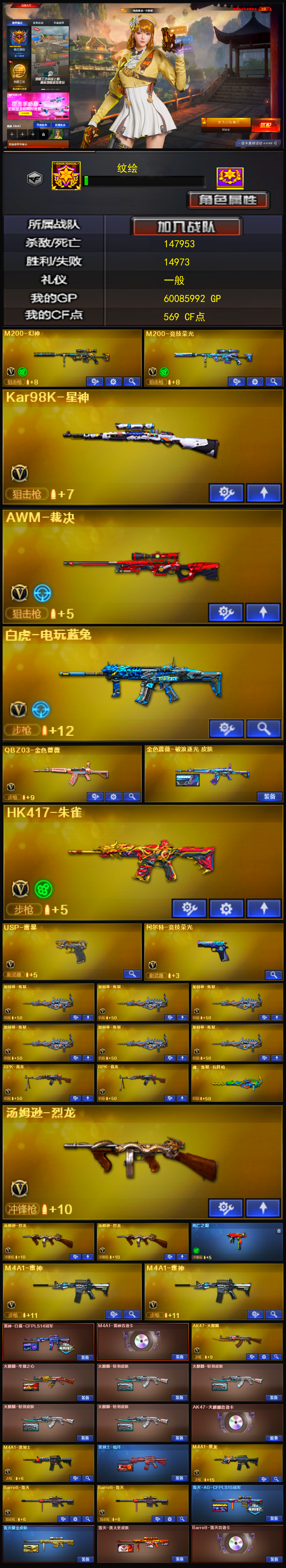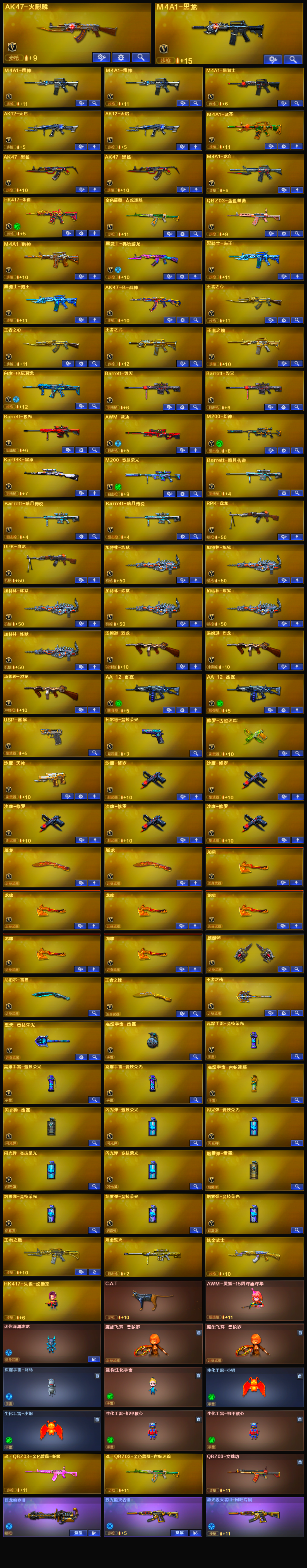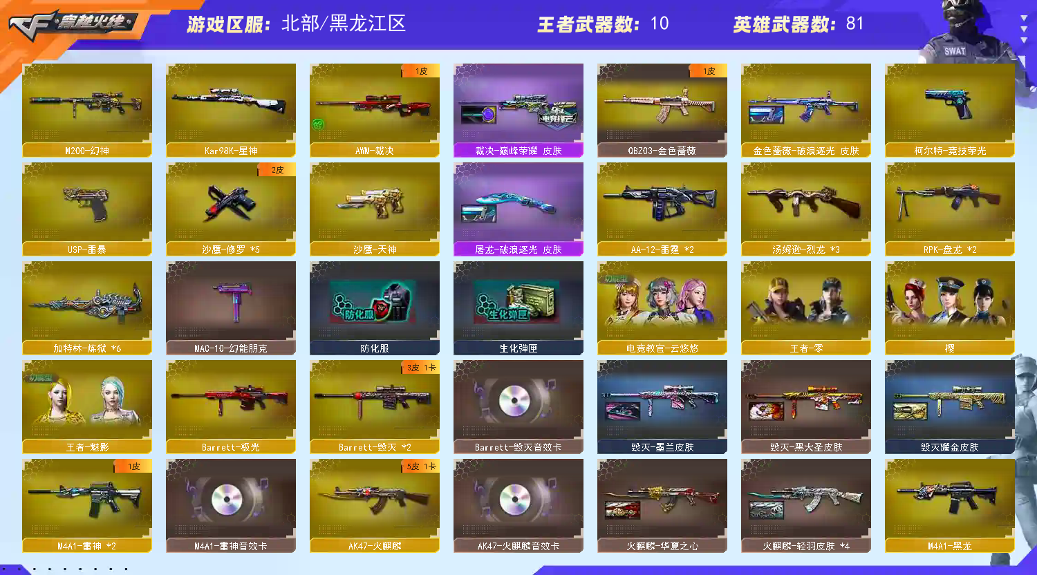 【m200幻神】【98k星神】【m200竞技荣光套+usp雷暴+四防云悠悠】【6炼狱 2盘龙 3烈龙】【qbz金色蔷薇】【hk417朱雀 】【火麒麟+卡】【黑龙】【雷神+卡+白鲨冠军】【黑骑士】【毁灭+卡+ag15冠军】【极光】【裁决】 【武器:天启 武圣 王者之心 王者之武 王者之魄 海王 白虎电玩蓝兔 天龙】 【手呛:修罗*5 沙鹰天神 修罗古蛇迷踪】 【刀具:屠龙*2 龙啸*6 麒麟刺 尼泊尔雷霆 王者之锋 王者之击】 【雷套:竞技荣光雷*3 雷霆雷】 【小人呛:朱雀蛇隐宗 火麒麟灵狐 天龙曼陀罗 cop白鲨】 【音效卡:毁灭音效卡 火麒麟音效卡 雷神音效卡 】 【四防角色:云悠悠 王者魅影】;USP-雷暴,电竞教官-云悠悠,RPK-盘龙,QBZ03-金色蔷薇,M200-幻神,Kar98K-星神,