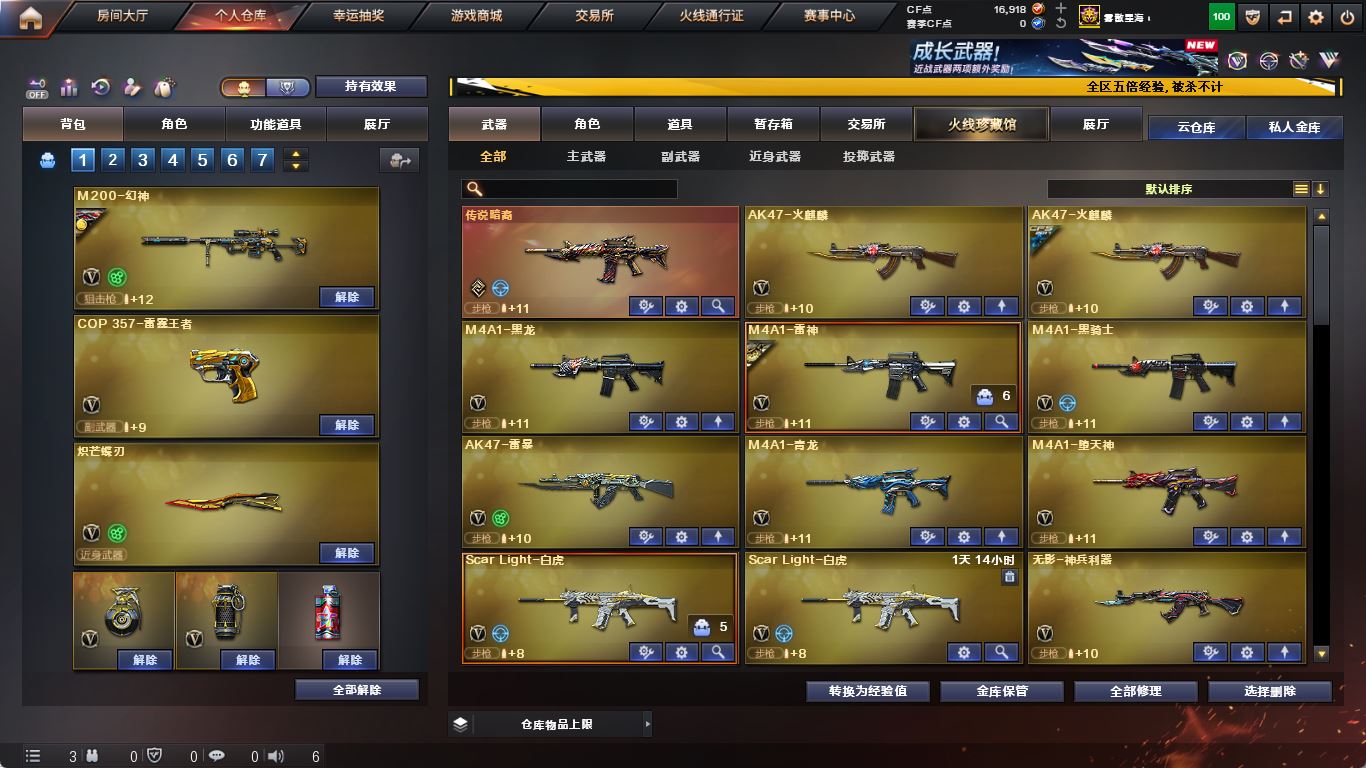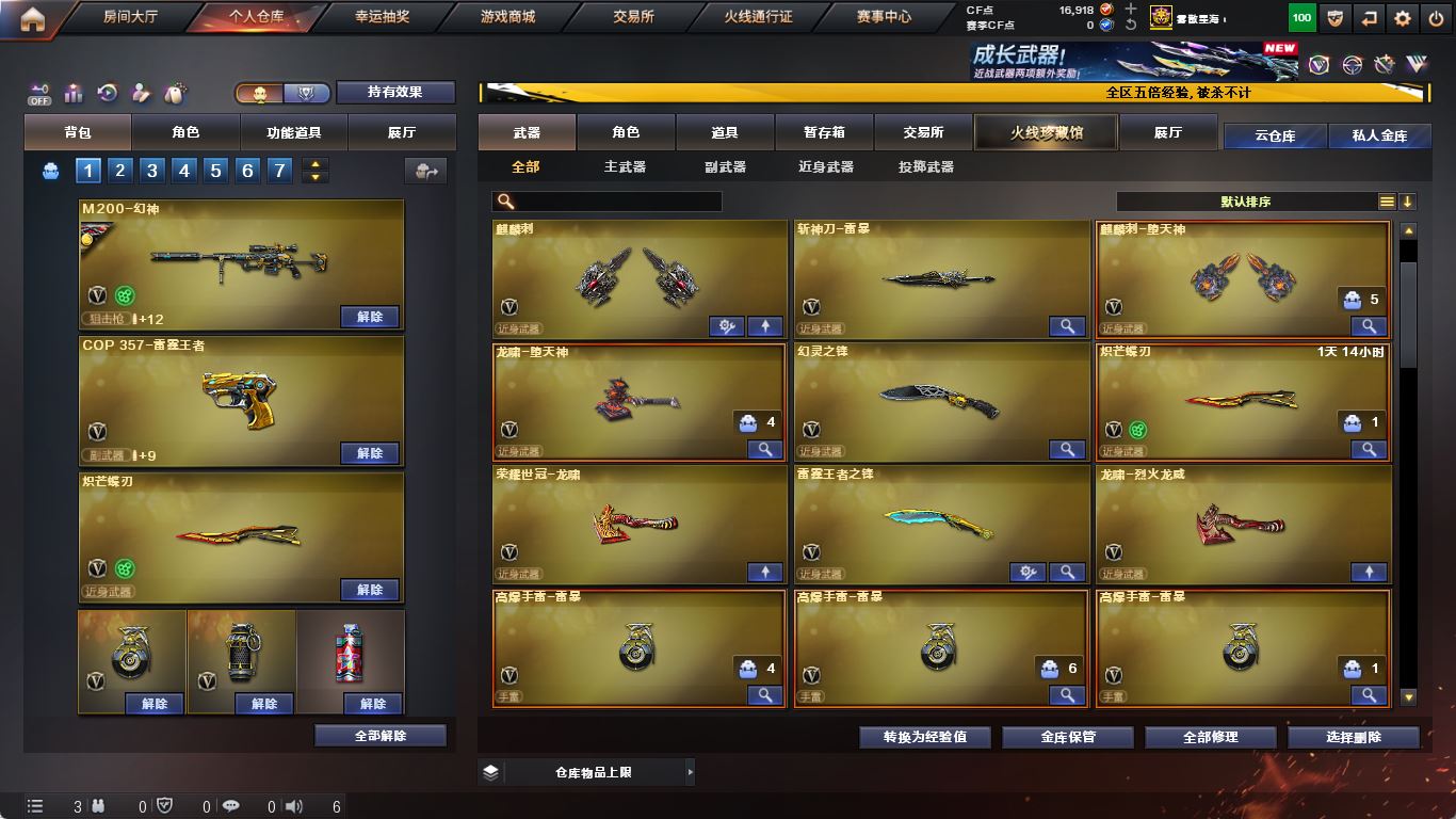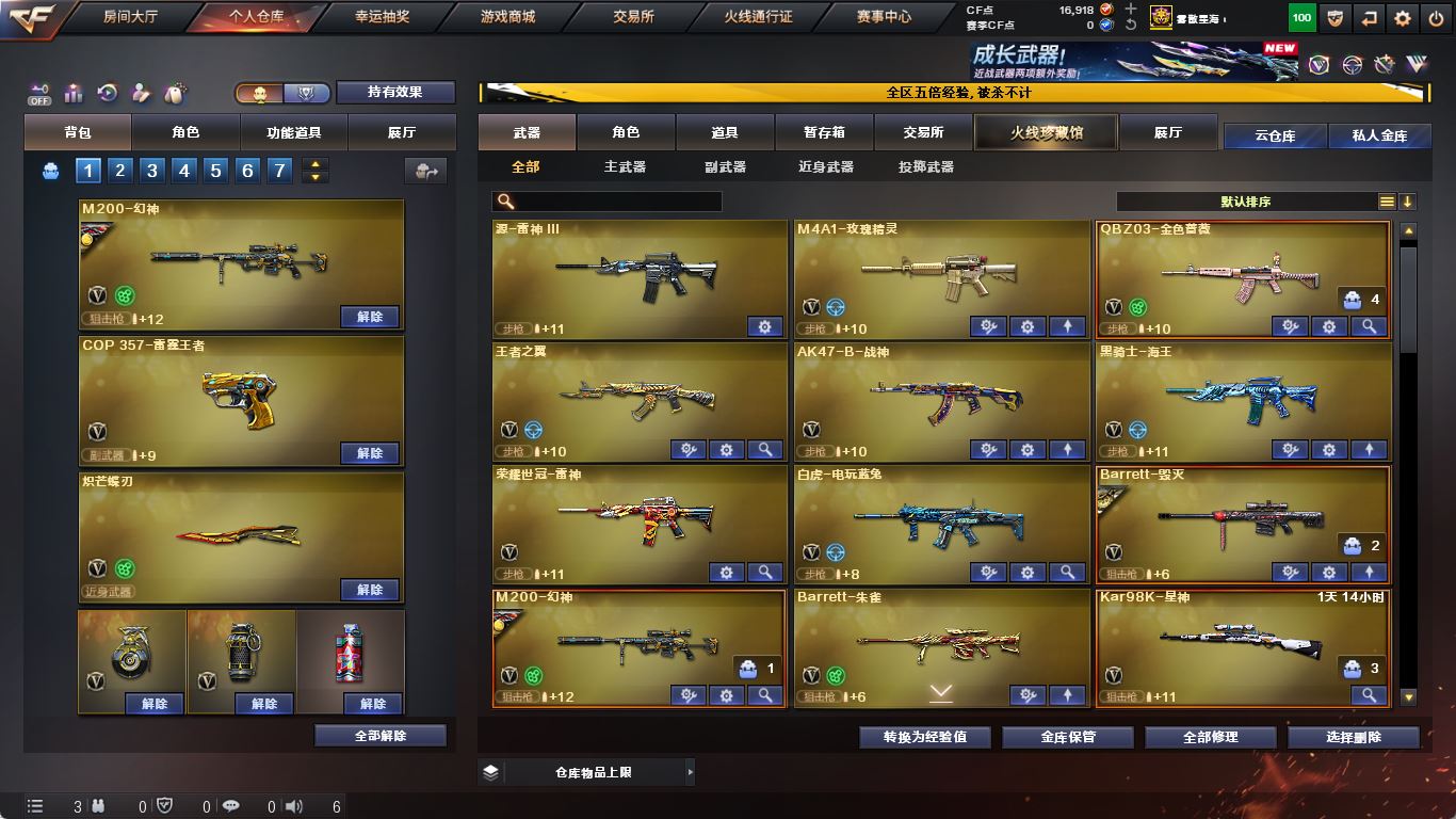 【M200-幻神+幻神-AG-CFPLS17】【传说暗裔】【ScarLight-白虎】【QBZ03-金色蔷薇】【Barrett-毁灭+音效卡+毁灭-冠军之怒】【堕天神套】【雷暴套】【AK47-火麒麟】【黑龙+音效卡】【M4A1-雷神+烈虎+雷神-宠儿】【黑骑士+音效卡+黑骑士-马超】【王者之翼】【青龙 玫瑰精灵】【7手枪 修罗 天神 usp雷暴 cop天神 cop雷霆王者】【11近战 屠龙 麒麟刺*2 斩神刀雷暴 幻灵之锋】【手雷 雷暴雷*6 堕天神*5 电竞装甲*2 幻灵雷 雷霆王者】【四防 王者魅影】【角色 幻面灵狐 修道士】【Barrett-毁灭音效卡 黑龙音效卡 黑骑士音效卡 M4A1-雷神音效卡】;USP-雷暴,荣耀世冠-柯尔特,QBZ03-金色蔷薇,M200-幻神,Scar Light-白虎,传说暗裔,