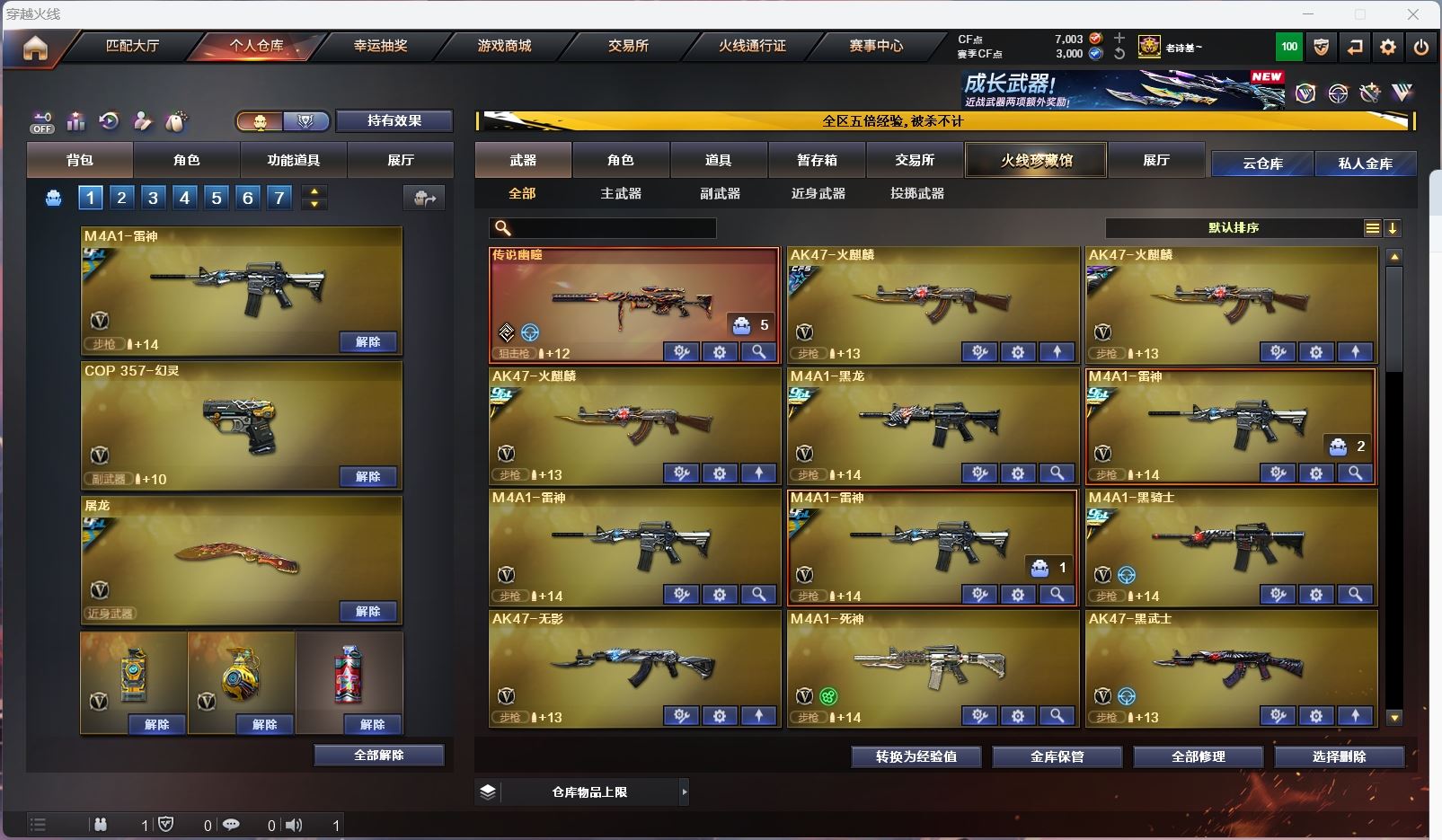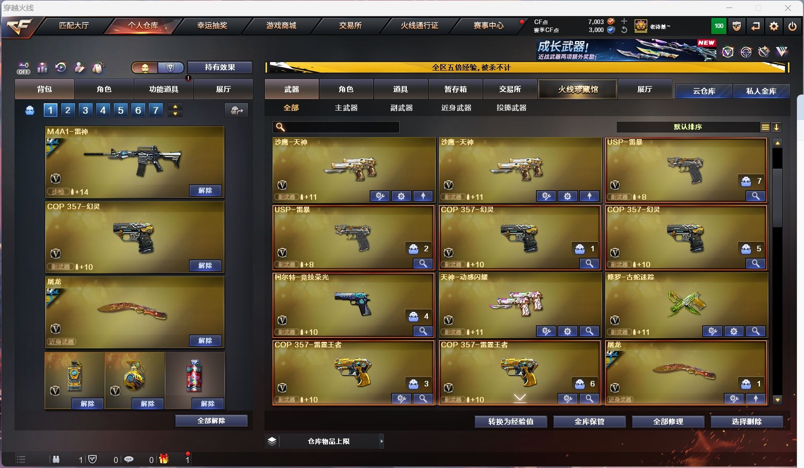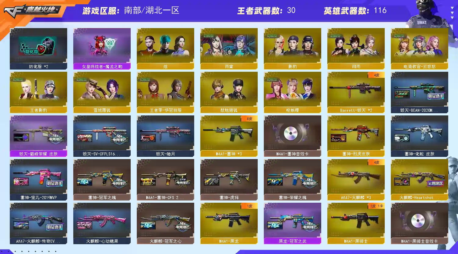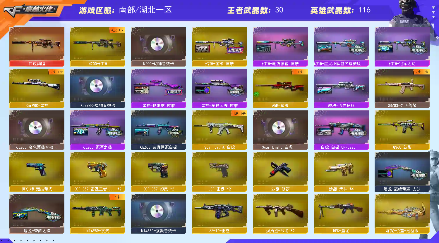 【亮点解析 幻神4皮带卡 星神三件套 白虎三件套 】【传说幽瞳】【m200幻神+音效卡+冠军之幻+星火小队+星耀+电流骇客】【98k星神+音效卡+枪娘+巅峰荣耀】【m200竞技荣光套+usp雷暴*2+四防云悠悠】【王者星神】【g36c幻影】【scar白虎+卡+白鲨冠军】【qbz金色蔷薇+卡+冠军之薇+荣耀世冠白鲨】【玄武+卡】【火麒麟+冠军之心 +女团+枪娘+even】【黑龙+冠军之薇】【雷神+卡+荣耀之魄+冠军之魄】【黑骑士+卡+冠军之势 】【毁灭+女团+巅峰荣耀】【裁决+流光秘银 】【武器:幻灵 王者之心 王者之戮 海王 王者之城 雷霆王者 荣耀世冠雷神 qbz王者蔷薇 白虎电玩 王者风势 盘龙 炼狱 烈龙*3】【12手枪:修罗 天神*4 雷暴*2 幻灵*2 竞技荣光 雷霆王者*2】【15刀具:屠龙 龙啸 麒麟刺 幻灵之峰*3 竞技荣光 神工天巧 荣耀世冠龙啸 雷霆王者之锋】【11雷套:幻灵雷*7 竞技荣光*4】【小人枪:雷神精英刀锋 白虎-茸茸松狮 雷神小红 毁灭孙三炮 天龙曼陀罗 cop白鲨 】【音效卡:玄武音效卡 星神音效卡 白虎音效卡 雷神音效卡 幻神音效卡 金色蔷薇音效卡 黑骑士音效卡 】【四防角色:云悠悠 司雨 影豹 雨棠 王者零华冠丽服 王者影豹 葵赛博朋克 零热舞青春 】;USP-雷暴,电竞教官-云悠悠,RPK-盘龙,QBZ03-金色蔷薇,传说幽瞳,G36C-幻影,M200-幻神,