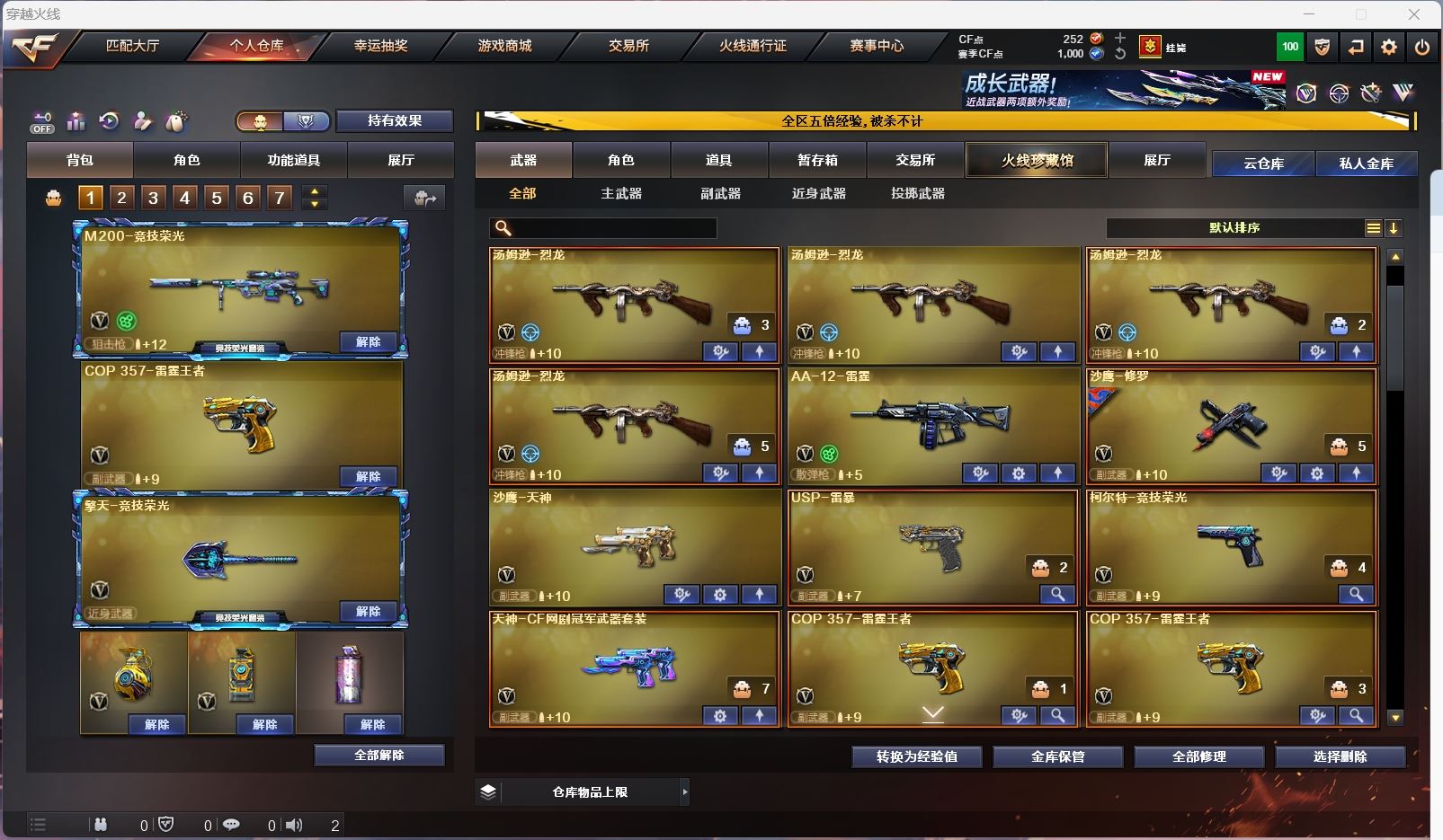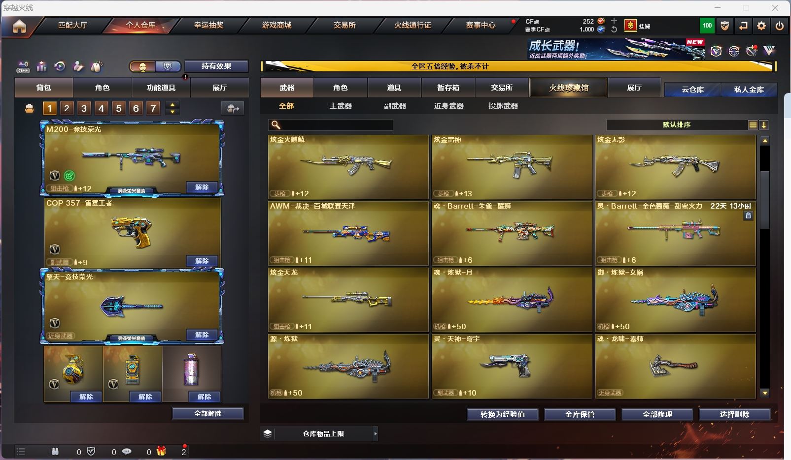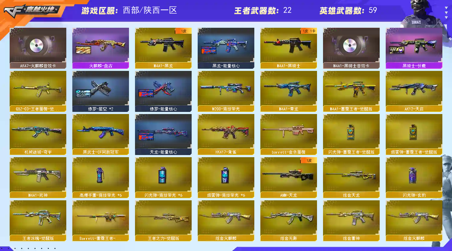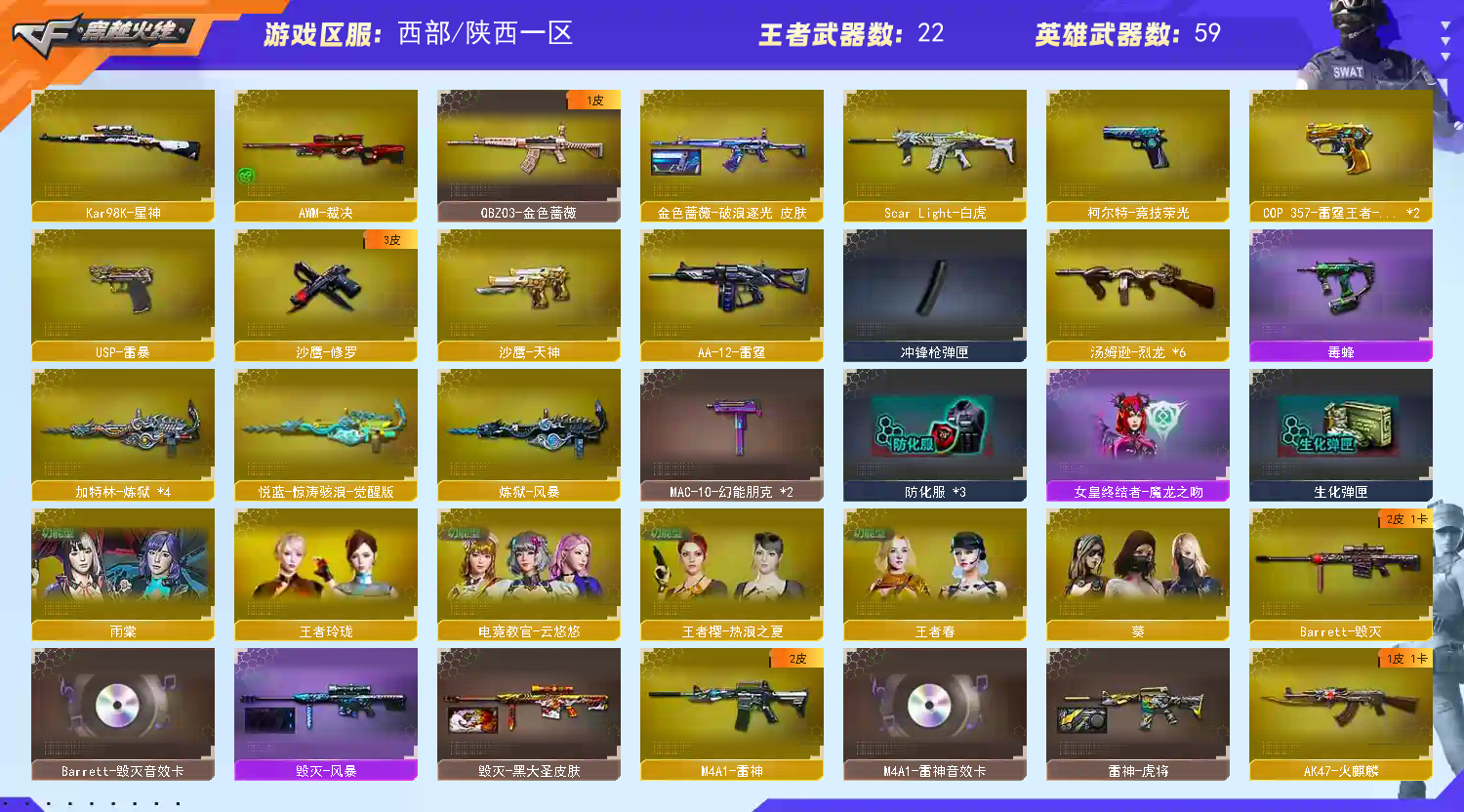 【m200竞技荣光套+usp雷暴+四防云悠悠】【98k星神】【6炼狱 6烈龙 死亡之眼 】【scar白虎】【qbz金色蔷薇】【朱雀】【火麒麟+卡】【黑龙】【雷神+卡】【黑骑士+卡】【毁灭+卡+枪娘】【裁决 】【武器:青龙 王者冰魄 王者之烈 雷霆王者 qbz王者蔷薇 王者凤吟 】【7手枪:修罗 天神 雷暴 竞技荣光 雷霆王者*2】【5刀具:屠龙 竞技荣光*2 雷霆王者之锋】【7雷套:竞技荣光*6 雷霆王者】【音效卡:火麒麟音效卡 雷神音效卡 黑骑士音效卡 毁灭音效卡 】【四防角色:云悠悠 雨棠 王者春 】;USP-雷暴,电竞教官-云悠悠,QBZ03-金色蔷薇,Scar Light-白虎,Kar98K-星神,